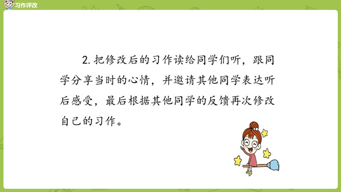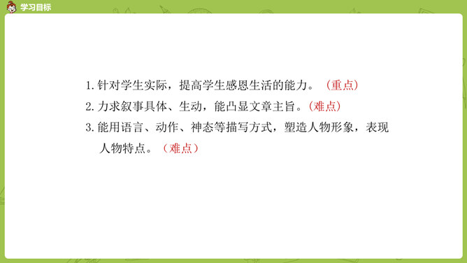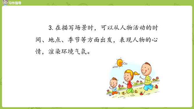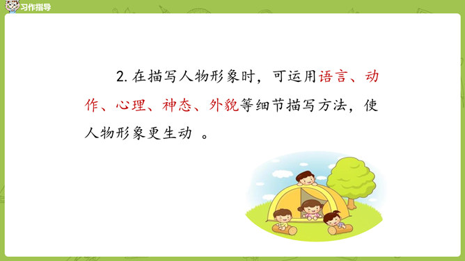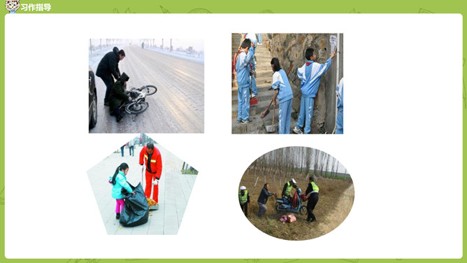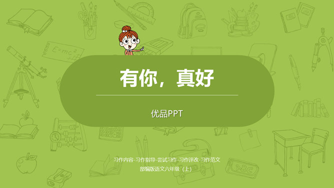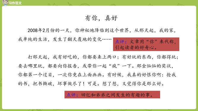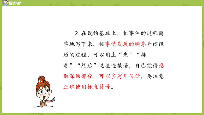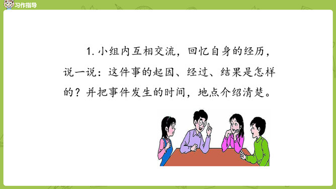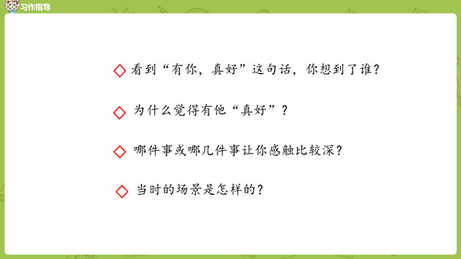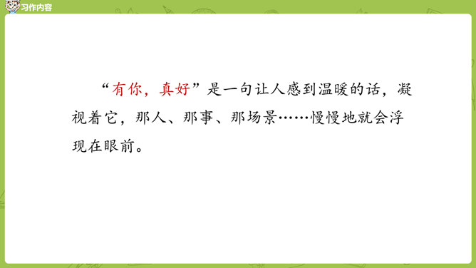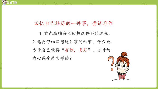 小组内互相交流,回忆自身的经历,说一说:这件事的起因、经过、结果是怎样的?并把事件发生的时间,地点介绍清楚。在描写人物形象时,可运用语言、动作、心理、神态、外貌等细节描写方法,使人物形象更生动 。在描写场景时,可以从人物活动的时间、地点、季节等方面出发,表现人物的心情,渲染环境气氛。首先在脑海里回想这件事的过程,注意要仔细回想这件事的细节,什么地方让自己觉得“有你,真好”,当时的内心感受是怎样的?所属专题:有你,真好ppt。