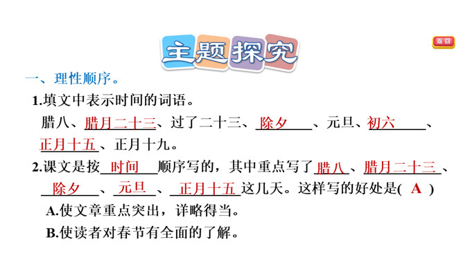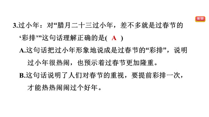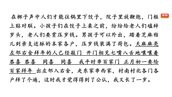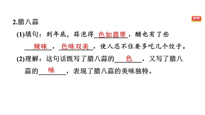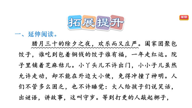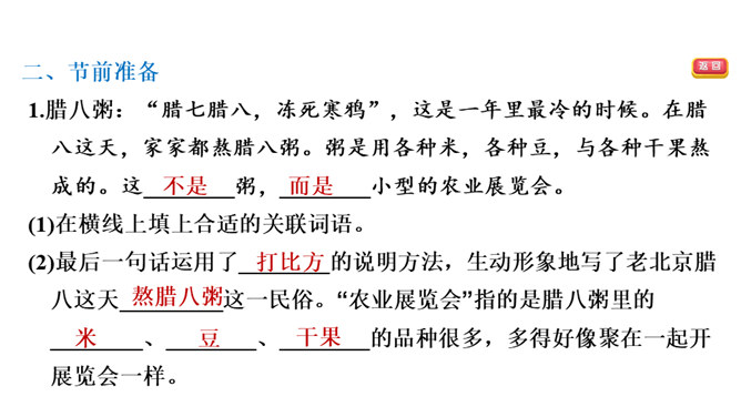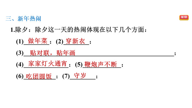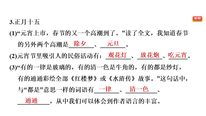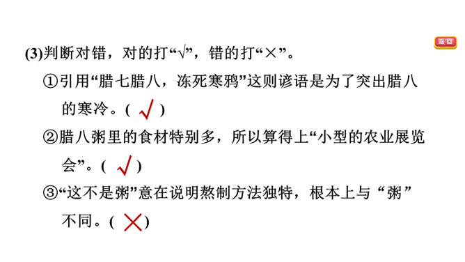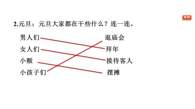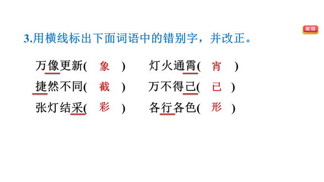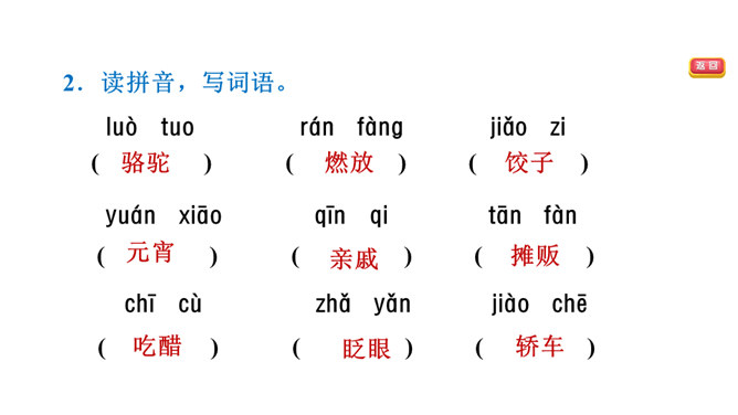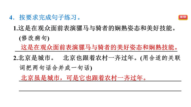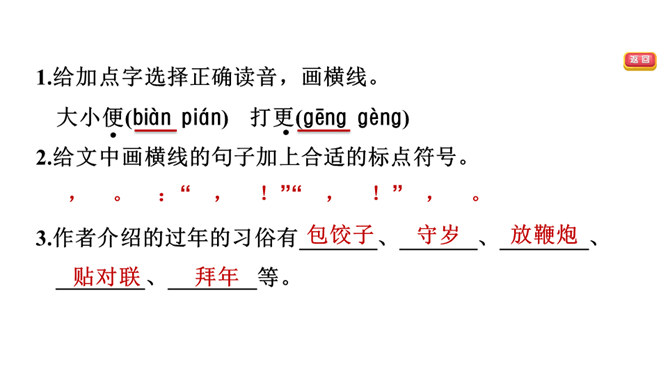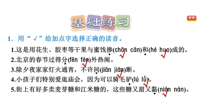 用“√”给加点字选择正确的读音。1.这是用花生、胶枣等干果与蜜饯掺(chān cān)和(hé huo)成的。2.北京的春节过得分(fēn fèn)外热闹。3.除夕夜家家灯火通宵,不许间(jiān jiàn)断。4.小孩子们特别爱逛庙会,因为可以骑毛驴(lú lǘ)。5.街上有好多卖麦芽糖和江米糖的,这些糖又甜又黏(nián nán)。读拼音,写词语。用横线标出下面词语中的错别字,并改正。按要求完成句子练习。这是在观众面前表演骡马与骑者的娴熟姿态和美好技能。所属专题:北京的春节ppt。