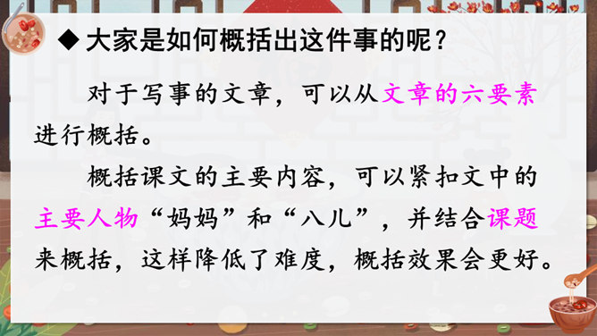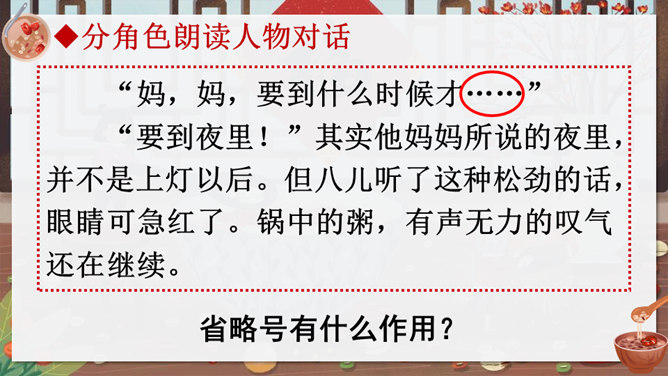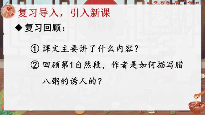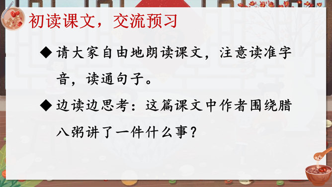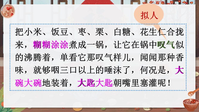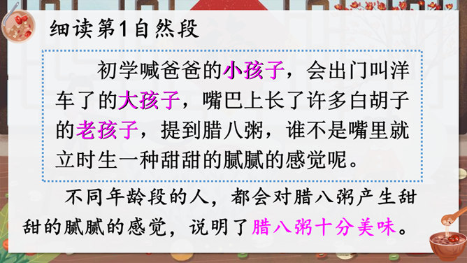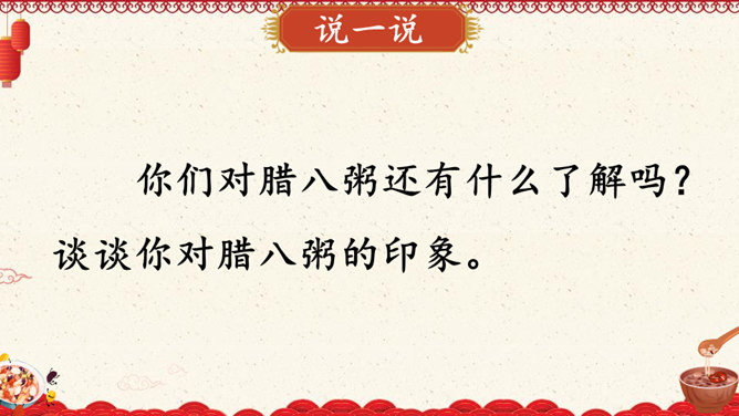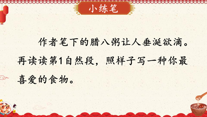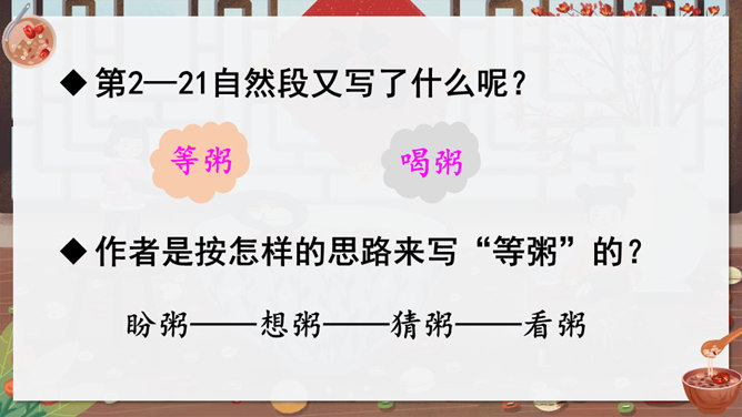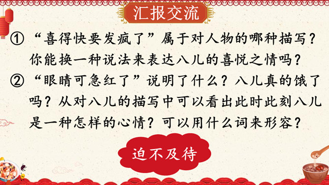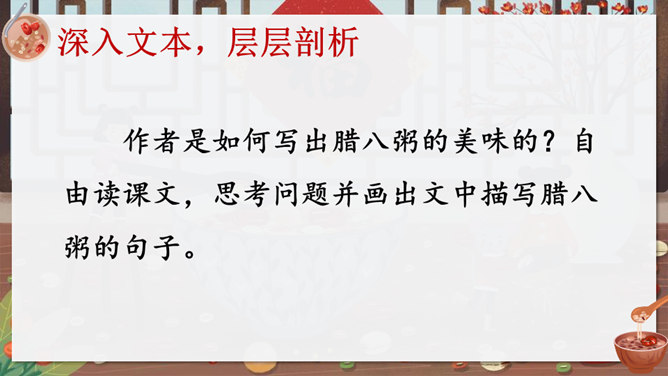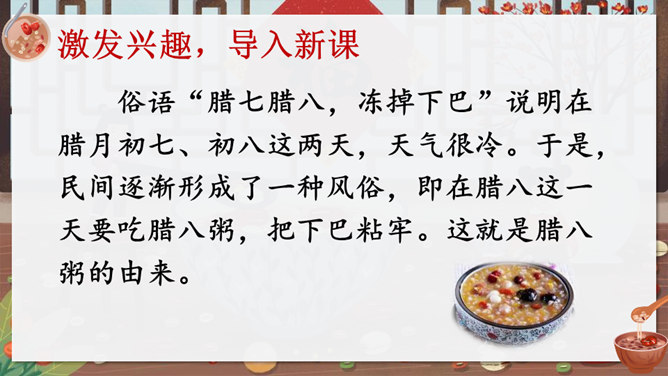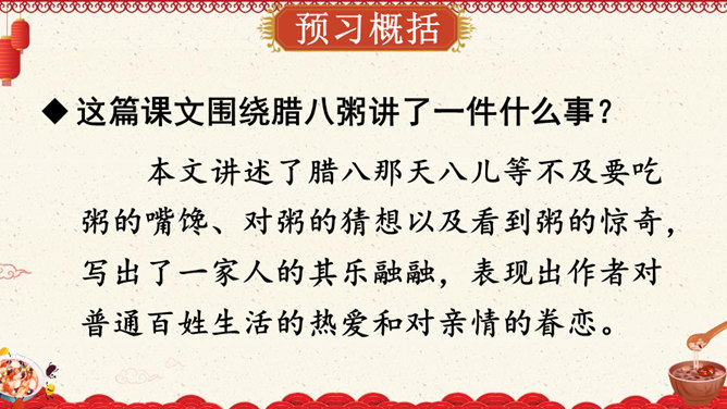 作者沈从文通过对人物的细节刻画表现出了八儿对腊八粥的喜爱之情,以及八儿一家其乐融融的情景。八儿这么想喝粥,他喝到了吗?喝到了妈妈煮的腊八粥,八儿又有什么表现呢?在文中找出具体描写八儿的语句。可以用一个怎样的词来形容八儿喝了腊八粥之后的心理?课文主要写了等粥和喝粥两件事情,说说哪部分写得详细,哪部分写得简略。想想这样写有什么好处。发挥想象,运用细节描写的手法,写出八儿喝腊八粥的情景。所属专题:腊八粥ppt。