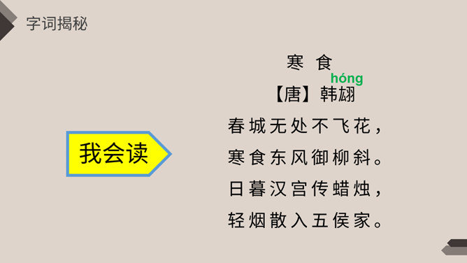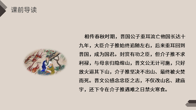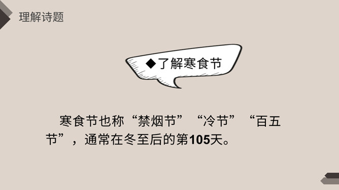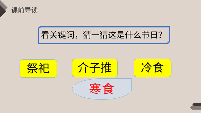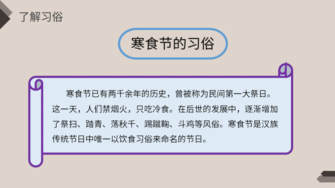 相传春秋时期,晋国公子重耳流亡他国长达十九年,大臣介子推始终追随左右,后来重耳回到晋国,成为国君。封赏有功之臣,但介子推不求利禄,与母亲归隐绵山,晋文公无计可施,只好放火逼其下山,介子推坚决不出山、最终被火焚而死。晋文公感念忠臣之志,不仅改山名、建庙宇,还下令在介子推遇难之日禁火寒食。寒食节也称“禁烟节”“冷节”“百五节”,通常在冬至后的第105天。寒食节已有两千余年的历史,曾被称为民间第一大祭日。 这一天,人们禁烟火,只吃冷食。在后世的发展中,逐渐增加了祭扫、踏青、荡秋千、踢蹴鞠、斗鸡等风俗。寒食节是汉族传统节日中唯一以饮食习俗来命名的节日。