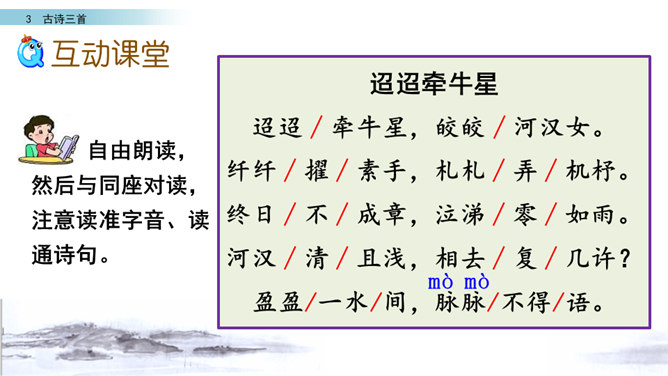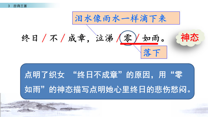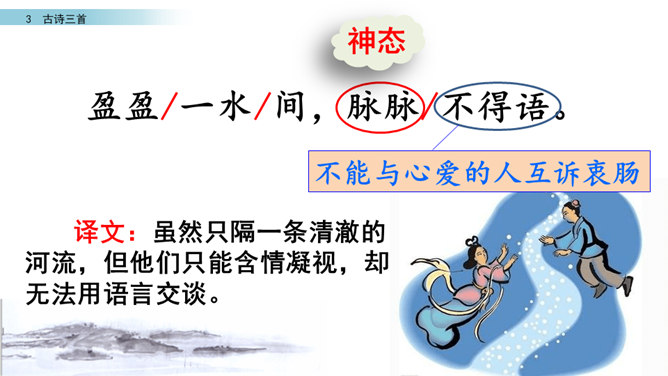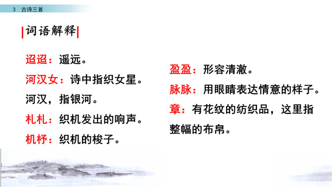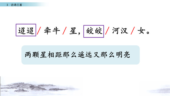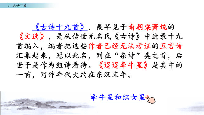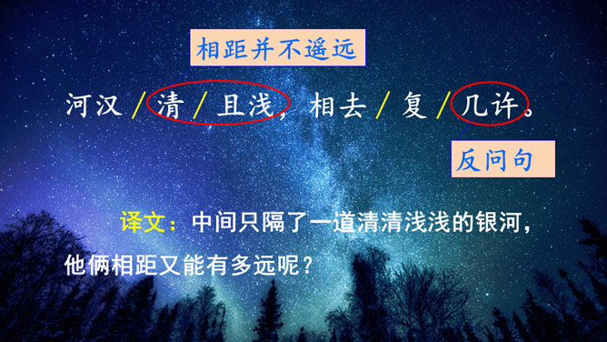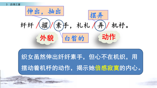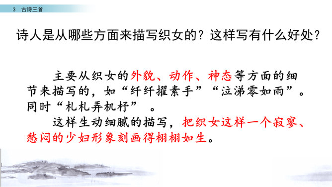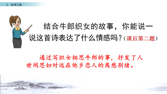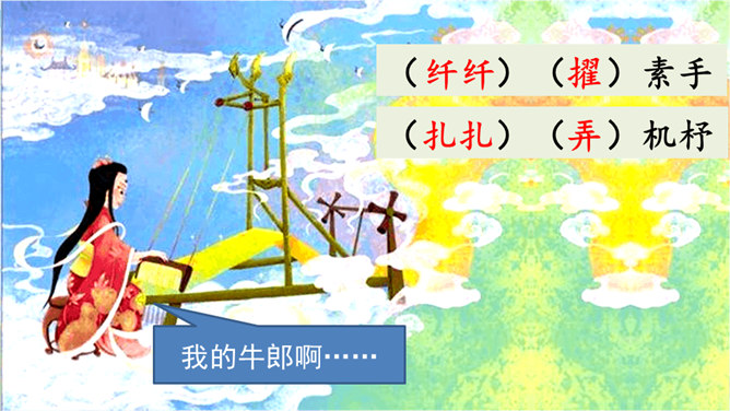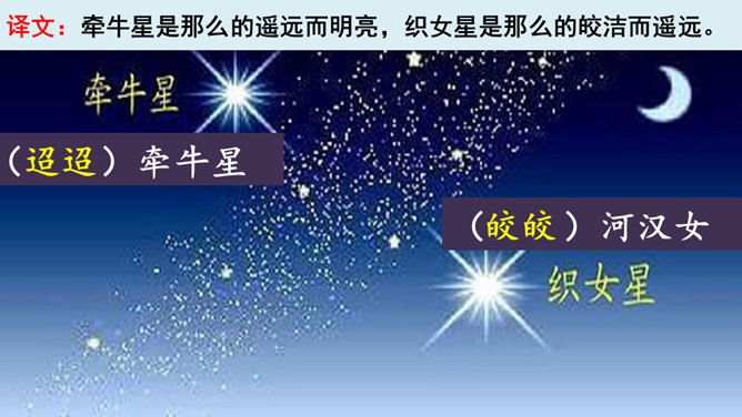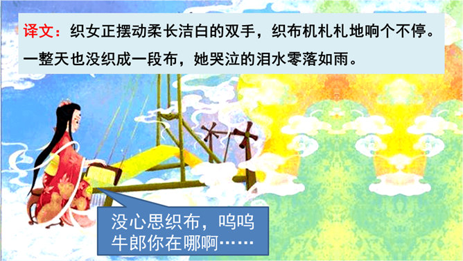 读第一行诗句,想想写了什么?诗人是从哪些方面来描写织女的?这样写有什么好处?主要从织女的外貌、动作、神态等方面的细节来描写的,如“纤纤擢素手”“泣涕零如雨”。同时“札札弄机杼” 。这样生动细腻的描写,把织女这样一个寂寥、愁闷的少妇形象刻画得栩栩如生。结合牛郎织女的故事,你能说一说这首诗表达了什么情感吗?通过写织女相思牛郎的事, 抒发了人世间思妇对远在他乡恋人的离愁别绪。所属专题:迢迢牵牛星ppt。
