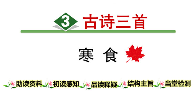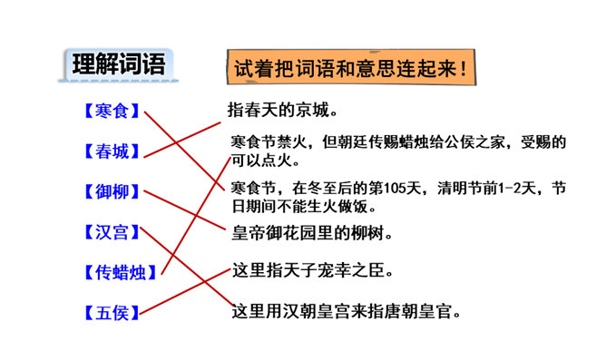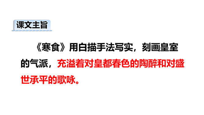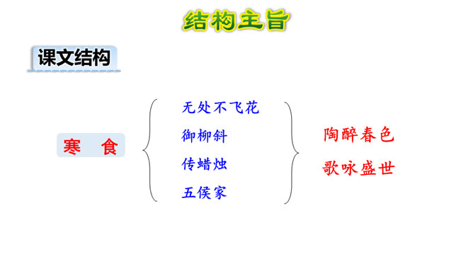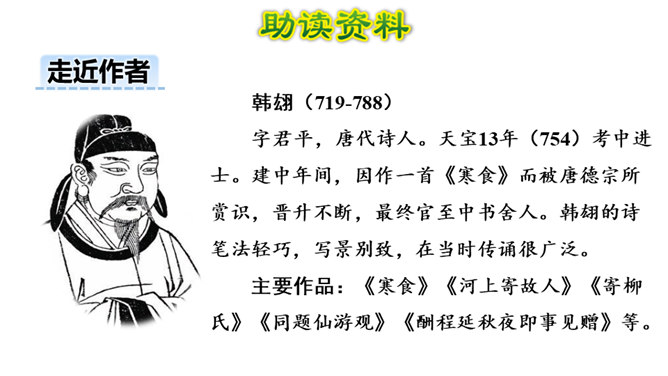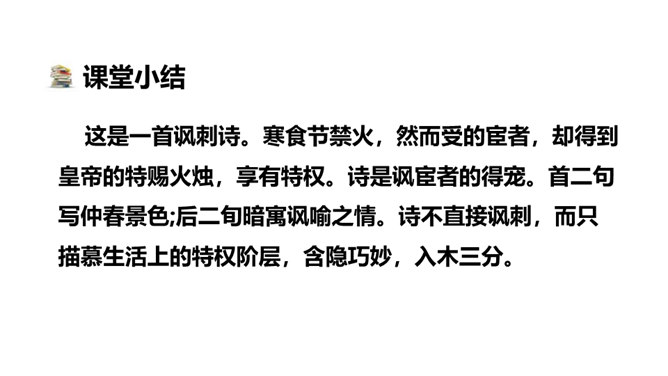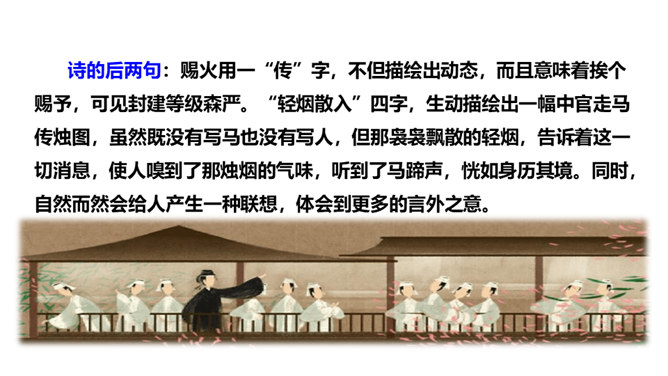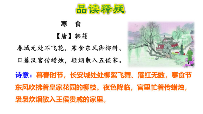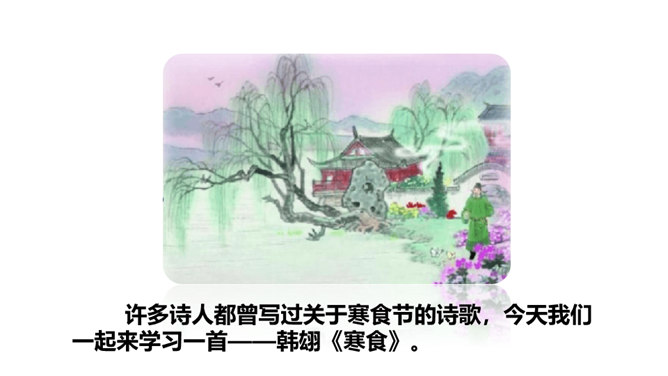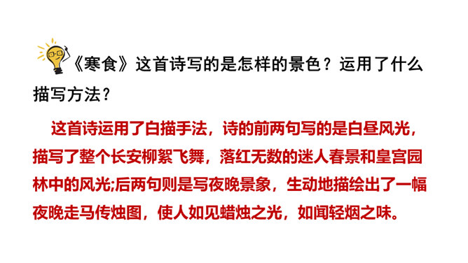 1.会写2个生字。(重点)2.理解诗意,体会作者表达的思想感情; (难点)3.能根据诗中的典故,联系相关传统文化知识理解古诗表达得情感。体会古诗委婉、间接抒情的特点(难点) 这首诗写的是怎样的景色?运用了什么描写方法?这首诗运用了白描手法,诗的前两句写的是白昼风光,描写了整个长安柳絮飞舞,落红无数的迷人春景和皇宫园林中的风光;后两句则是写夜晚景象,生动地描绘出了一幅夜晚走马传烛图,使人如见蜡烛之光,如闻轻烟之味。所属专题:寒食ppt。