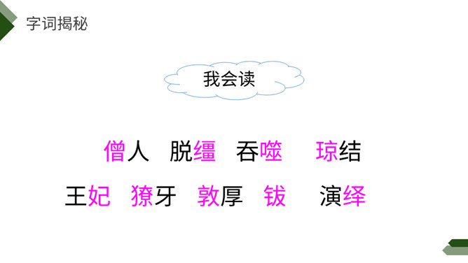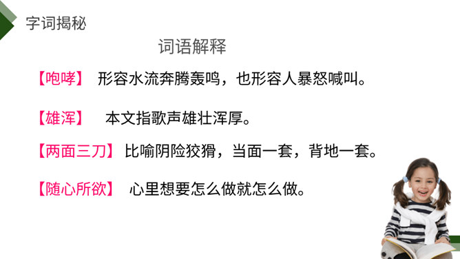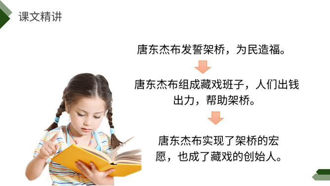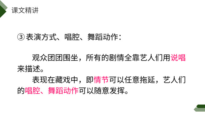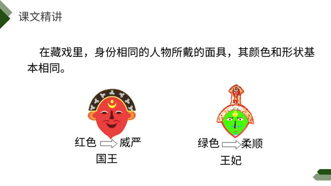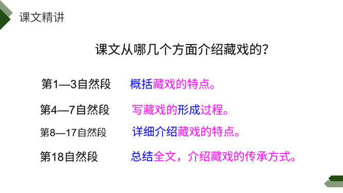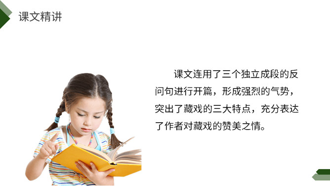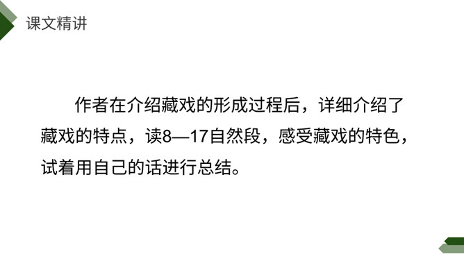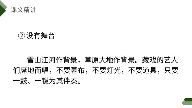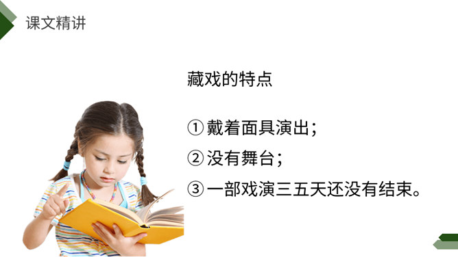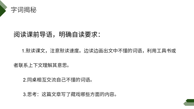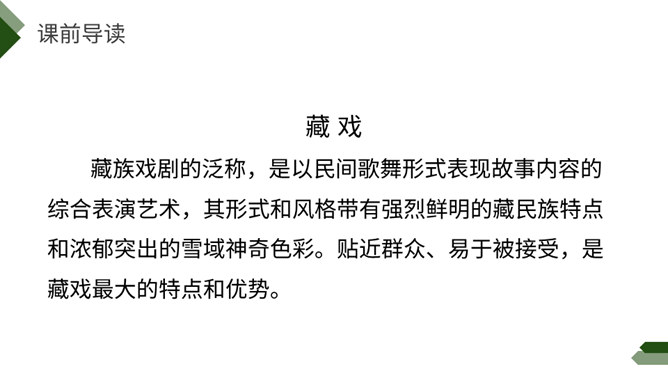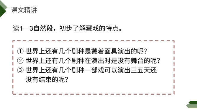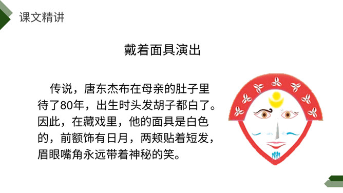 阅读课前导语,明确自读要求:1.默读课文,注意默读速度。边读边画出文中不懂的词语,利用工具书或者联系上下文理解其意思。2.同桌相互交流自己不懂的词语。3.思考:这篇文章写了藏戏哪些方面的内容。世界上还有几个剧种是戴着面具演出的呢?世界上还有几个剧种在演出时是没有舞台的呢?世界上还有几个剧种一部戏可以演出三五天还没有结束的呢?课文连用了三个独立成段的反问句进行开篇,形成强烈的气势,突出了藏戏的三大特点,充分表达了作者对藏戏的赞美之情。所属专题:藏戏ppt。