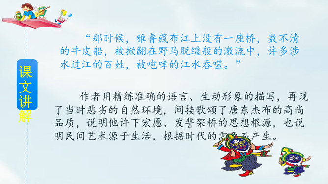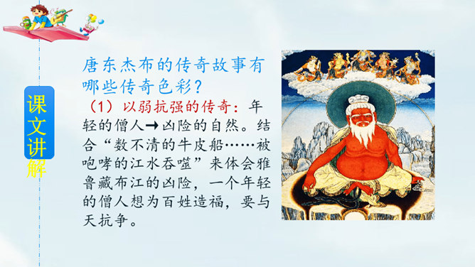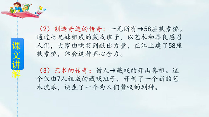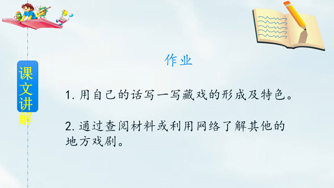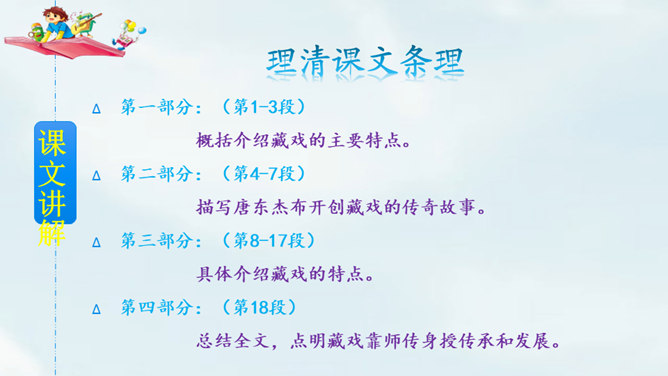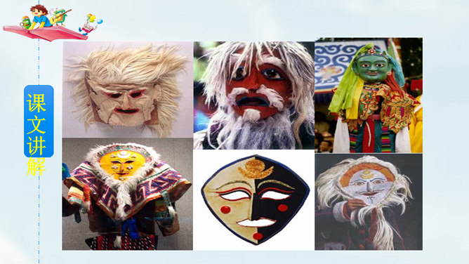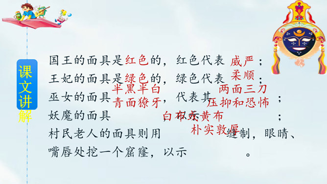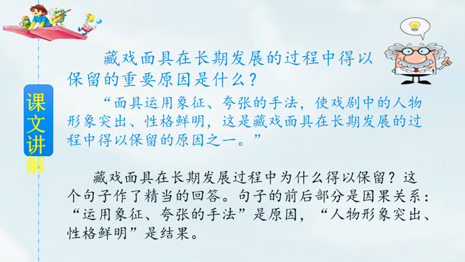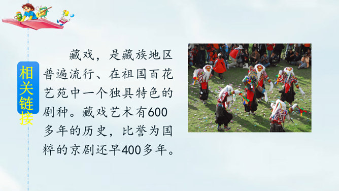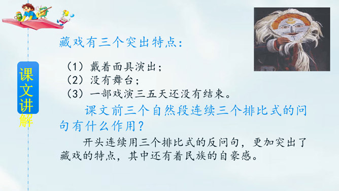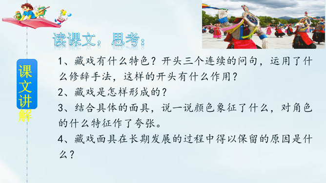 中国是一个多民族的国家,不仅有丰富多彩的节日风俗,还有独具特色的艺术形式。你知道祖国有哪些戏曲种类吗?1、藏戏有什么特色?开头三个连续的问句,运用了什么修辞手法,这样的开头有什么作用?2、藏戏是怎样形成的?3、结合具体的面具,说一说颜色象征了什么,对角色的什么特征作了夸张。4、藏戏面具在长期发展的过程中得以保留的原因是什么?8—4段写的是藏戏戴着面具演出的特点:多样、夸张、形象鲜明的面具。所属专题:藏戏ppt。