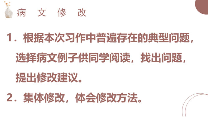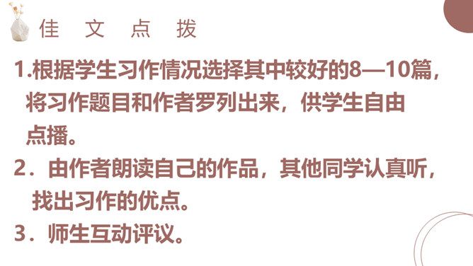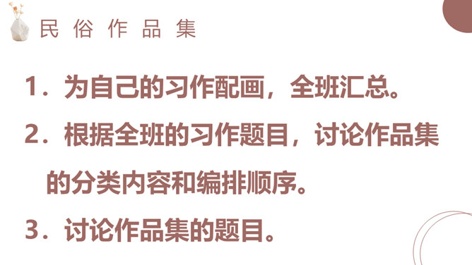 1.根据学生习作情况选择其中较好的8—10篇,将习作题目和作者罗列出来,供学生自由点播。 2.由作者朗读自己的作品,其他同学认真听,找出习作的优点。 3.师生互动评议。1.根据本次习作中普遍存在的典型问题,选择病文例子供同学阅读,找出问题,提出修改建议。 2.集体修改,体会修改方法。1.为自己的习作配画,全班汇总。 2.根据全班的习作题目,讨论作品集的分类内容和编排顺序。 3.讨论作品集的题目。所属专题:家乡的风俗ppt。