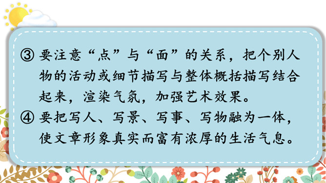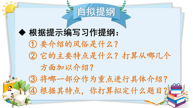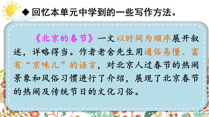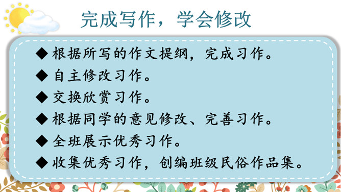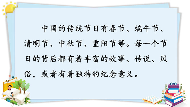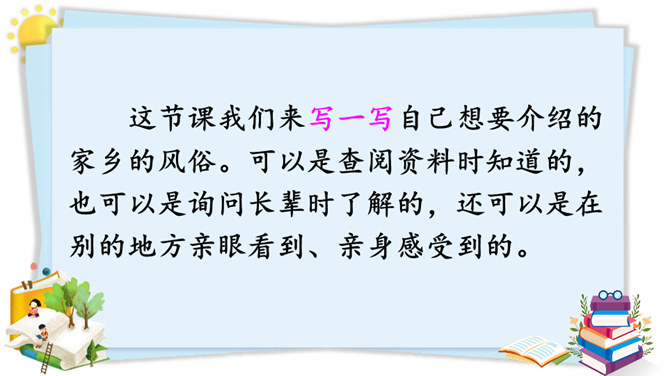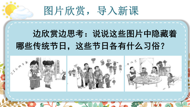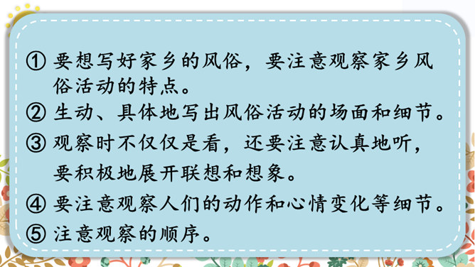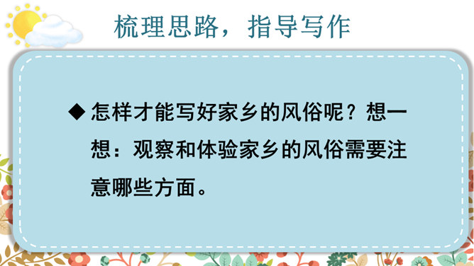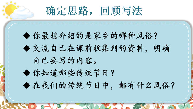 边欣赏边思考:说说这些图片中隐藏着哪些传统节日,这些节日各有什么习俗?这节课我们来写一写自己想要介绍的家乡的风俗。可以是查阅资料时知道的,也可以是询问长辈时了解的,还可以是在别的地方亲眼看到、亲身感受到的。中国的传统节日有春节、端午节、清明节、中秋节、重阳节等。每一个节日的背后都有着丰富的故事、传说、风俗,或者有着独特的纪念意义。说说你在本次习作中能借鉴的一些写法。所属专题:家乡的风俗ppt。