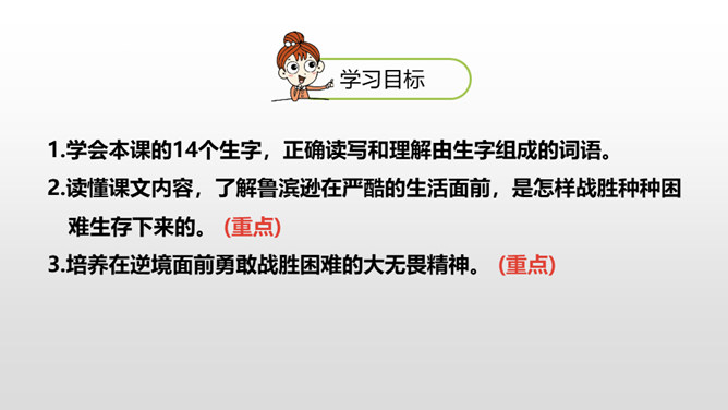 1.学会本课的14个生字,正确读写和理解由生字组成的词语。2.读懂课文内容,了解鲁滨逊在严酷的生活面前,是怎样战胜种种困难生存下来的。 (重点) 3.培养在逆境面前勇敢战胜困难的大无畏精神。 (重点)请学生们默读课文,思考:课文讲了一个什么故事?本文写的是一位叫鲁滨逊的英国人,在一次航海中翻船漂流到一座荒无人烟的小岛上,战胜种种困难,历尽磨难,生活了二十多年之久,最后终于获救回到英国的事。所属专题:鲁宾逊漂流记ppt。