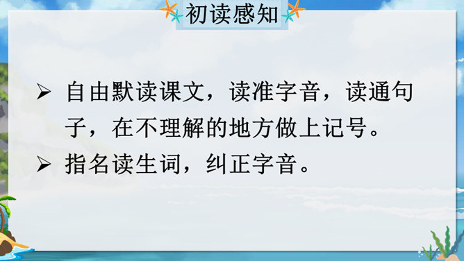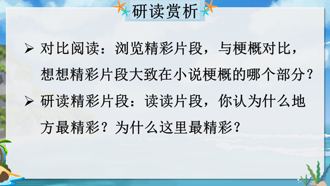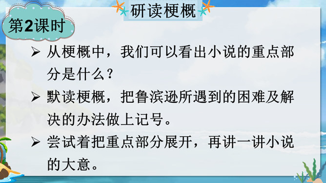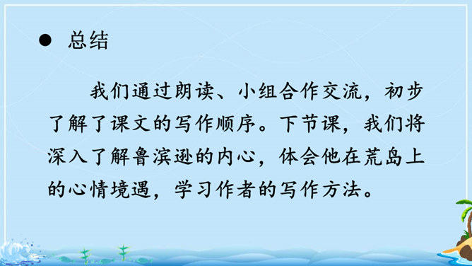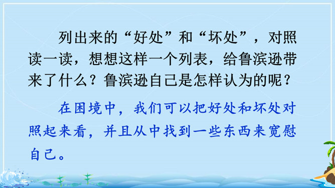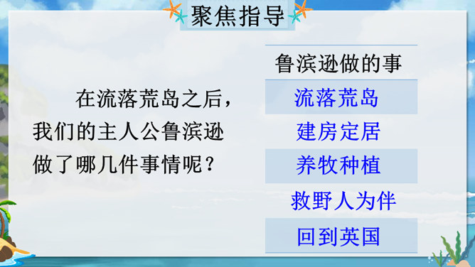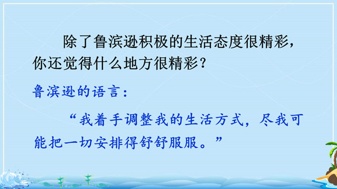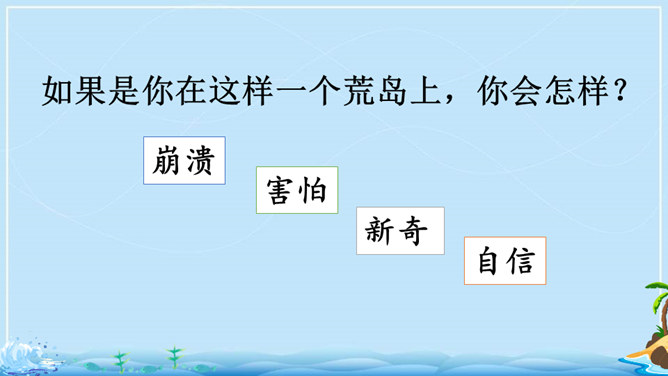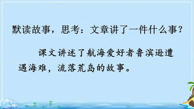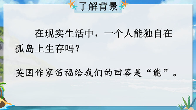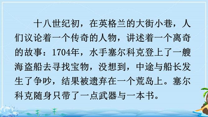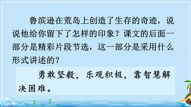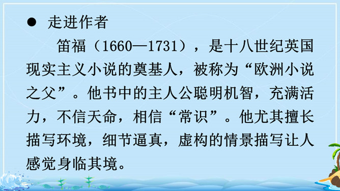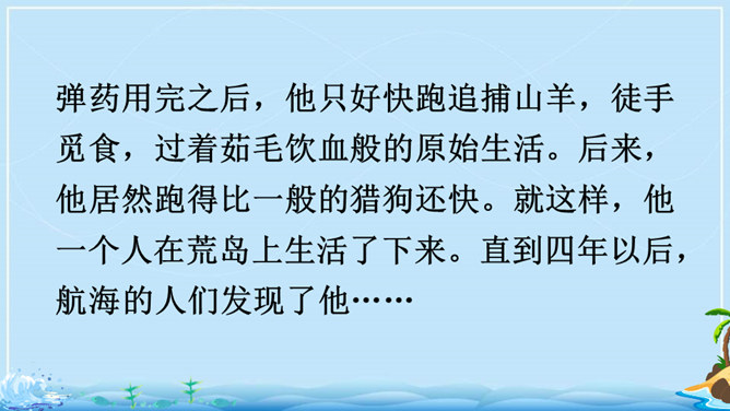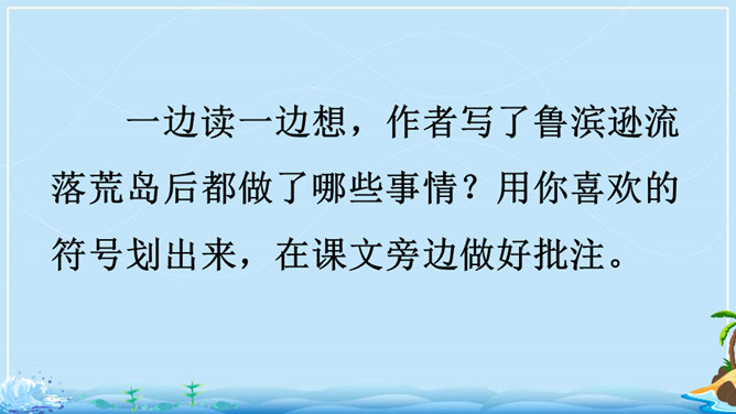 在现实生活中,一个人能独自在孤岛上生存吗?英国作家笛福给我们的回答是“能”。自由默读课文,读准字音,读通句子,在不理解的地方做上记号。指名读生词,纠正字音。一边读一边想,作者写了鲁滨逊流落荒岛后都做了哪些事情?用你喜欢的符号划出来,在课文旁边做好批注。 鲁滨逊在荒岛上创造了生存的奇迹,说说他给你留下了怎样的印象?课文的后面一部分是精彩片段节选,这一部分是采用什么形式讲述的?所属专题:鲁宾逊漂流记ppt。