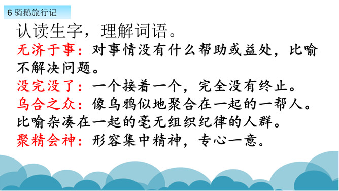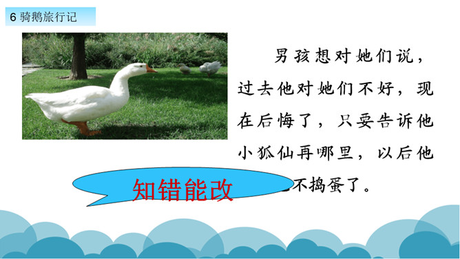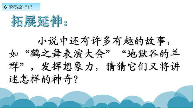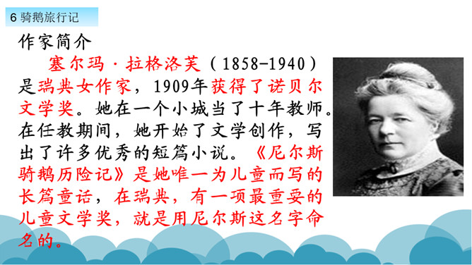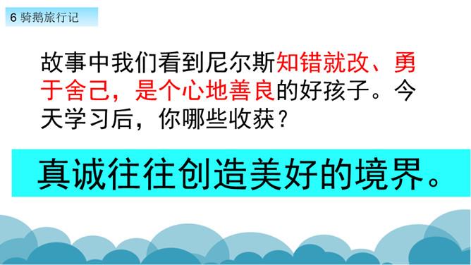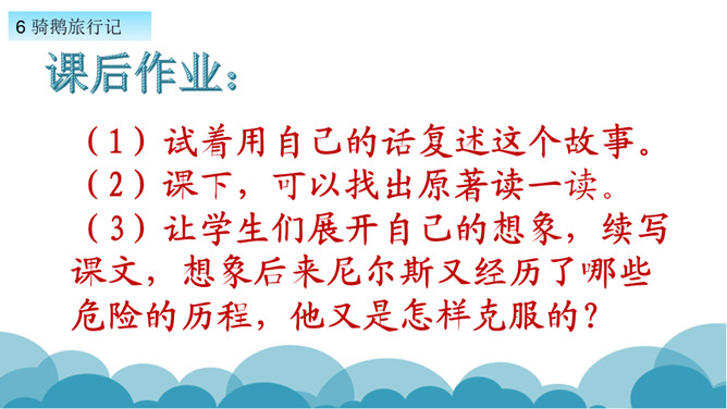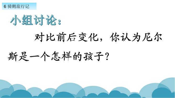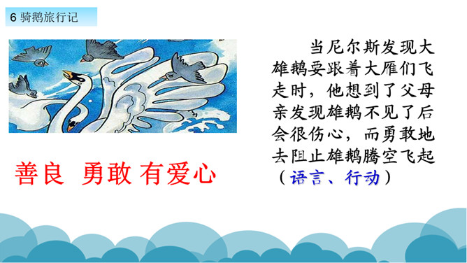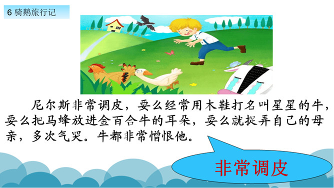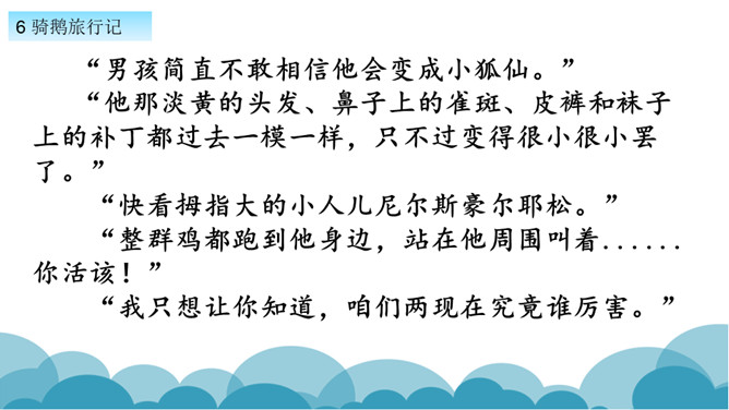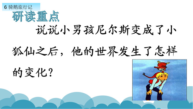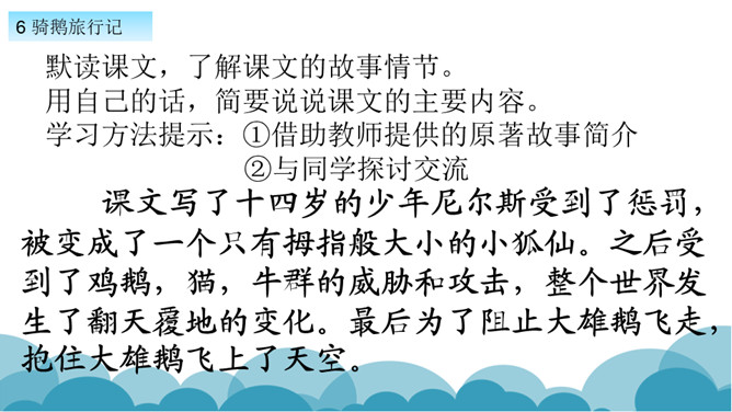 默读课文,了解课文的故事情节。用自己的话,简要说说课文的主要内容。学习方法提示:①借助教师提供的原著故事简介。②与同学探讨交流。课文写了十四岁的少年尼尔斯受到了惩罚,被变成了一个只有拇指般大小的小狐仙。之后受到了鸡鹅,猫,牛群的威胁和攻击,整个世界发生了翻天覆地的变化。最后为了阻止大雄鹅飞走,抱住大雄鹅飞上了天空。说说小男孩尼尔斯变成了小狐仙之后,他的世界发生了怎样的变化?所属专题:骑鹅旅行记ppt。