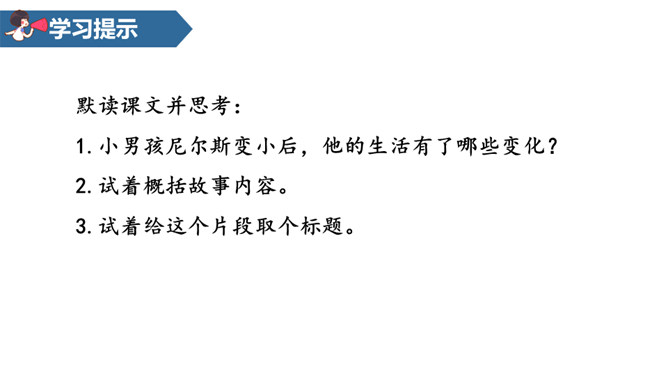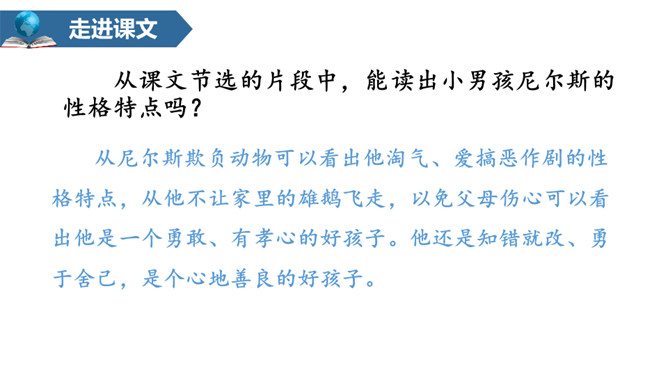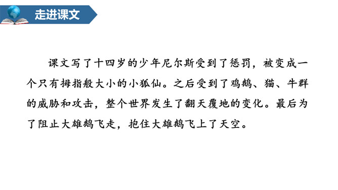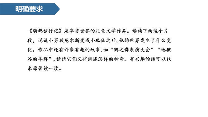 《骑鹅旅行记》是享誉世界的儿童文学作品。读读下面这个片段,说说小男孩尼尔斯变成小狐仙之后,他的世界发生了什么变化。作品中还有许多有趣的故事,如“鹤之舞表演大会”“地狱谷的羊群”,猜猜它们又将讲述怎样的神奇。有兴趣的话可以找来原著读一读。读课文,不动笔墨不读书:把不认识的字和不理解的词语做上记号,等课文全部阅读完再查资料解决。从课文节选的片段中,能读出小男孩尼尔斯的性格特点吗?所属专题:骑鹅旅行记ppt。