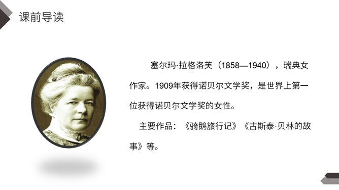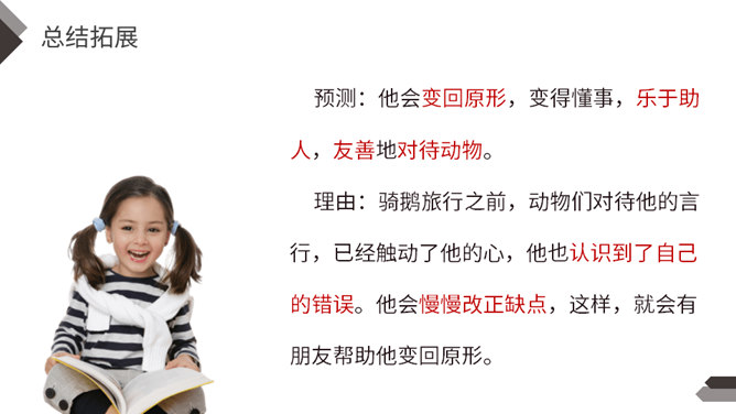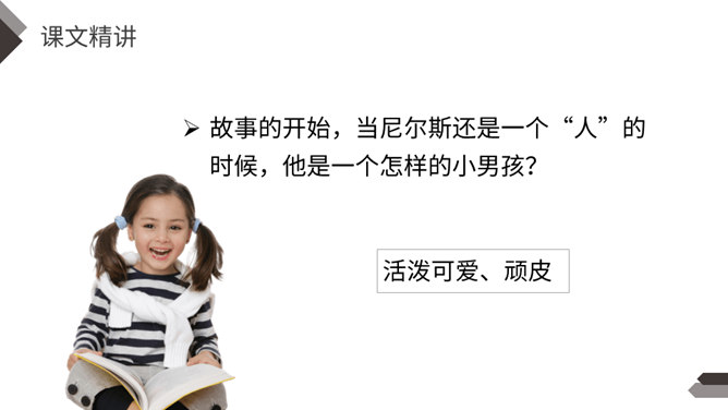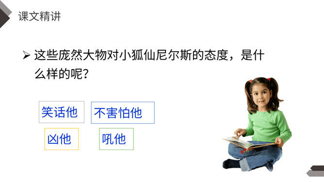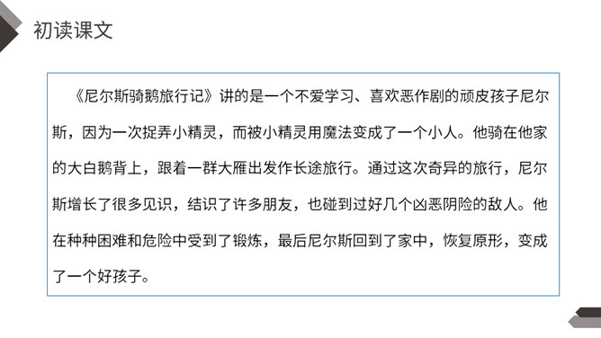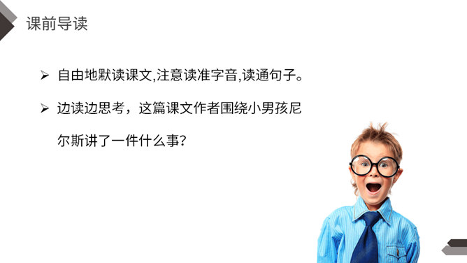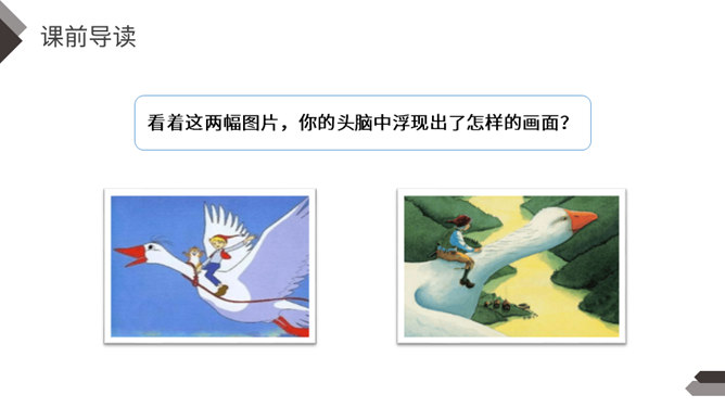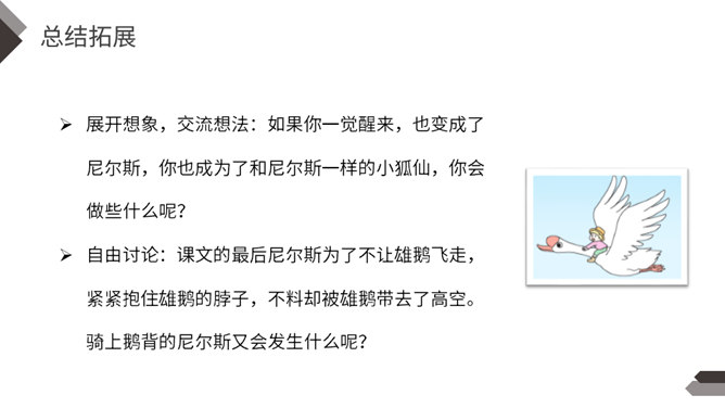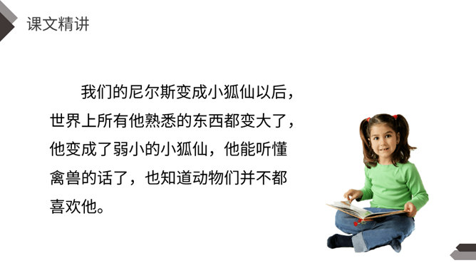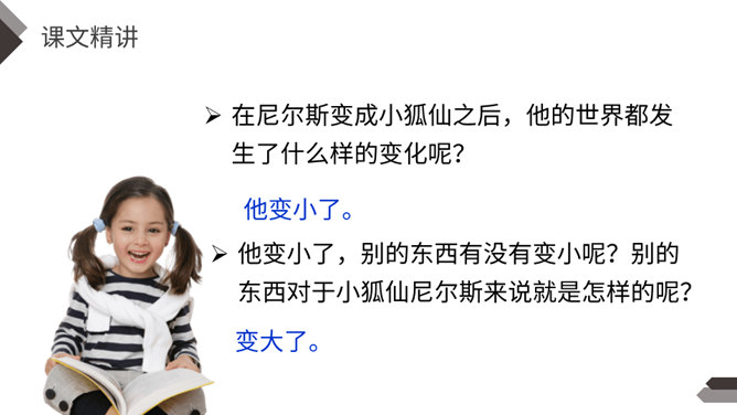 在尼尔斯变成小狐仙之后,他的世界都发生了什么样的变化呢?他变小了。他变小了,别的东西有没有变小呢?别的东西对于小狐仙尼尔斯来说就是怎样的呢?变大了。我们的尼尔斯变成小狐仙以后,世界上所有他熟悉的东西都变大了,他变成了弱小的小狐仙,他能听懂禽兽的话了,也知道动物们并不都喜欢他。展开想象,交流想法:如果你一觉醒来,也变成了尼尔斯,你也成为了和尼尔斯一样的小狐仙,你会做些什么呢?所属专题:骑鹅旅行记ppt。