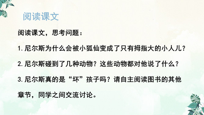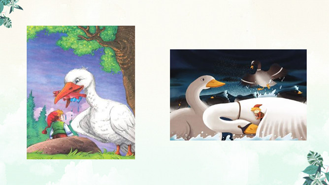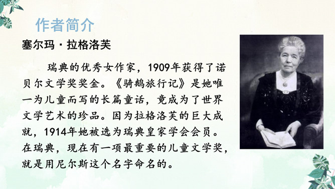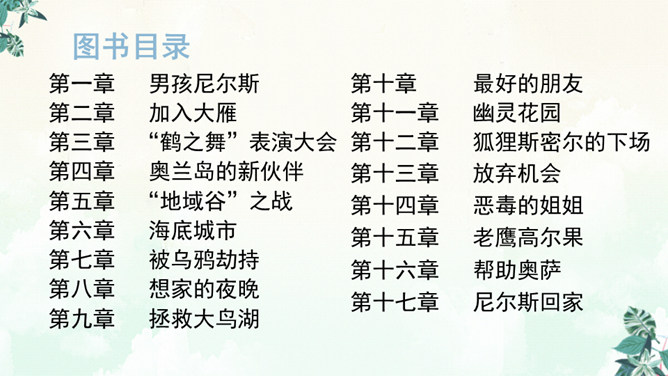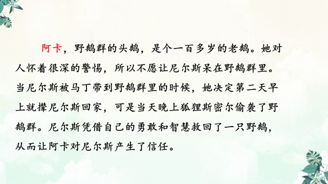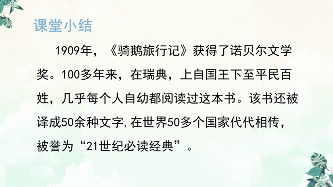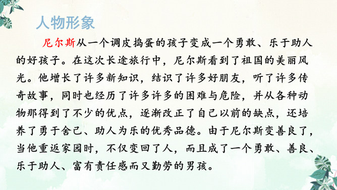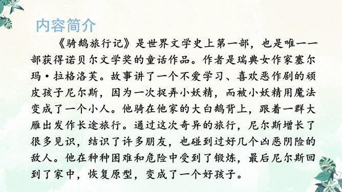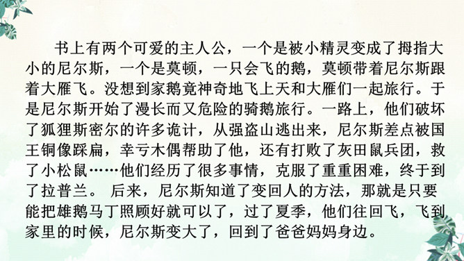 书上有两个可爱的主人公,一个是被小精灵变成了拇指大小的尼尔斯,一个是莫顿,一只会飞的鹅,莫顿带着尼尔斯跟着大雁飞。没想到家鹅竟神奇地飞上天和大雁们一起旅行。于是尼尔斯开始了漫长而又危险的骑鹅旅行。一路上,他们破坏了狐狸斯密尔的许多诡计,从强盗山逃出来,尼尔斯差点被国王铜像踩扁,幸亏木偶帮助了他,还有打败了灰田鼠兵团,救了小松鼠……他们经历了很多事情,克服了重重困难,终于到了拉普兰。所属专题:骑鹅旅行记ppt。