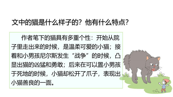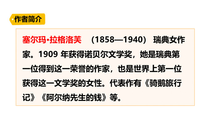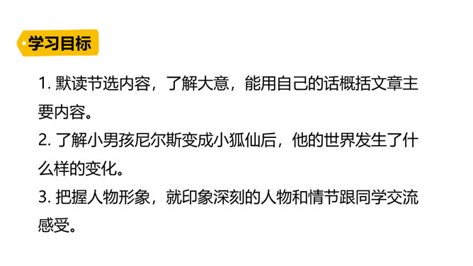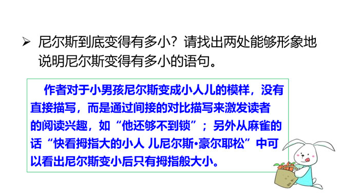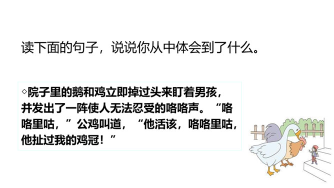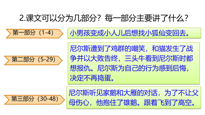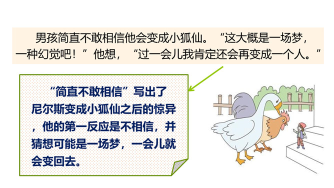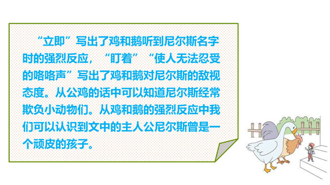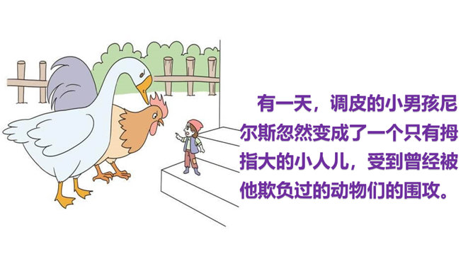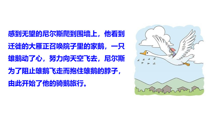 本文节选的部分主要介绍尼尔斯变小以后,在寻找小狐仙的过程中被麻雀、鹅、鸡嘲笑,并且和猫打了一架,被猫打倒以后,他认识到自己变小后的弱小无力。当他溜进牛棚时,三头牛对他的愤怒让他认识到自己过去所犯的错误,并感到后悔。感到无望的尼尔斯爬到围墙上,他看到迁徙的大雁正召唤院子里的家鹅,一只雄鹅动了心,努力向天空飞去,尼尔斯为了阻止雄鹅飞走而抱住雄鹅的脖子,由此开始了他的骑鹅旅行。所属专题:骑鹅旅行记ppt。