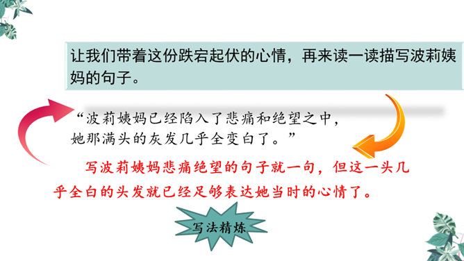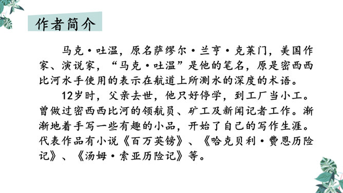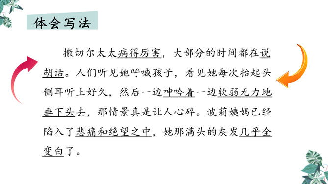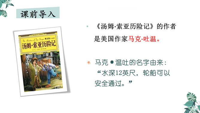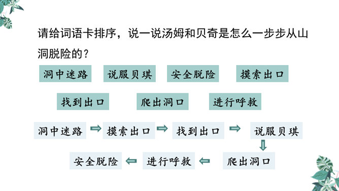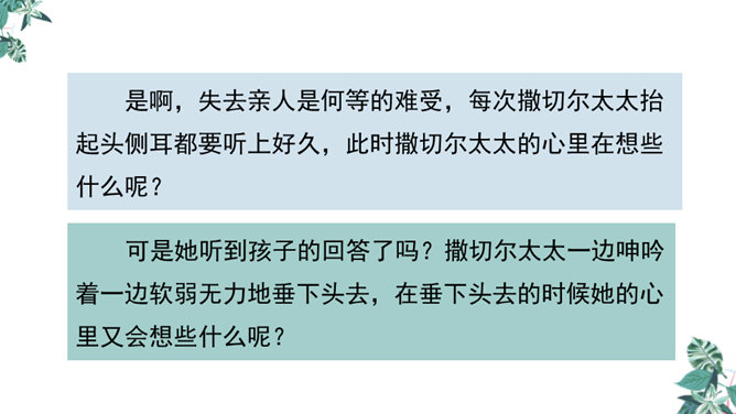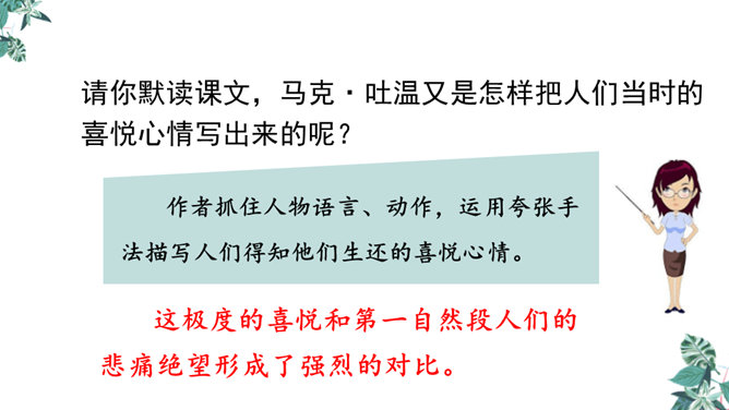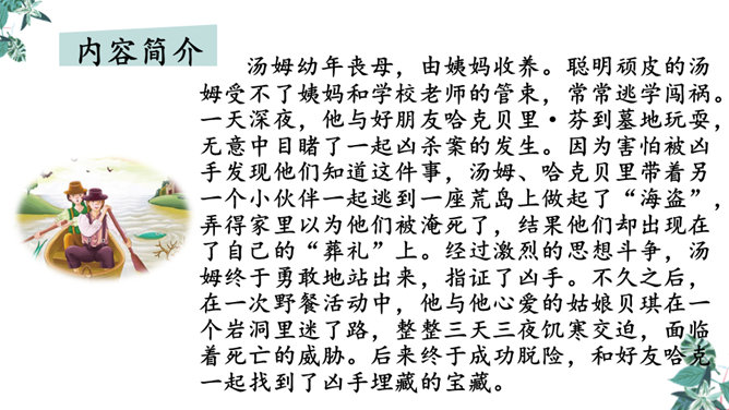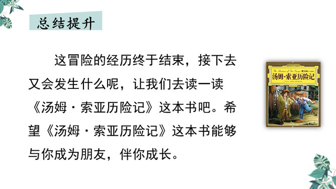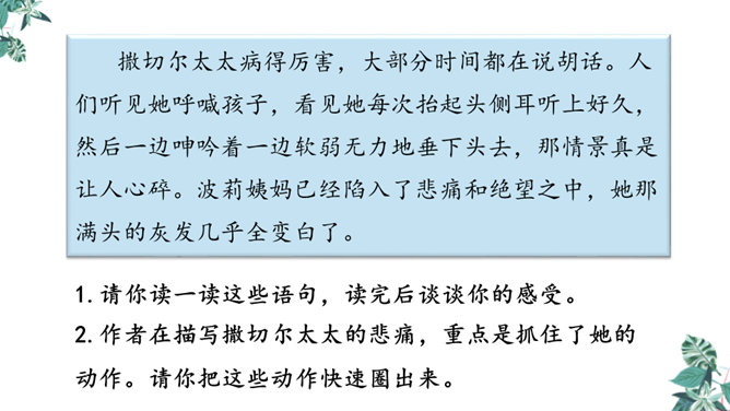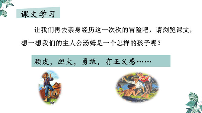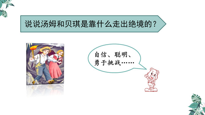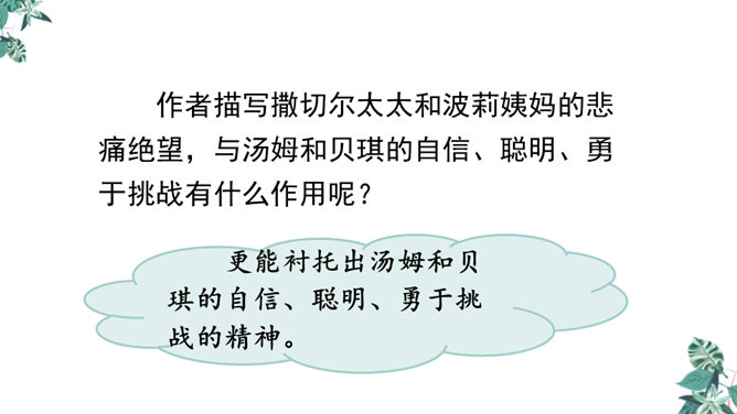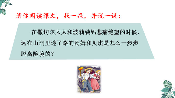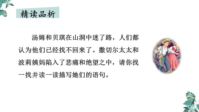让我们再去亲身经历这一次次的冒险吧,请浏览课文,想一想我们的主人公汤姆是一个怎样的孩子呢?顽皮,胆大,勇敢,有正义感……汤姆和贝琪在山洞中迷了路,人们都认为他们已经找不回来了。撒切尔太太和波莉姨妈陷入了悲痛和绝望之中,请你找一找并读一读描写她们的语句。1.请你读一读这些语句,读完后谈谈你的感受。2.作者在描写撒切尔太太的悲痛,重点是抓住了她的动作。请你把这些动作快速圈出来。所属专题:汤姆索亚历险记ppt。