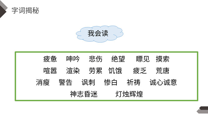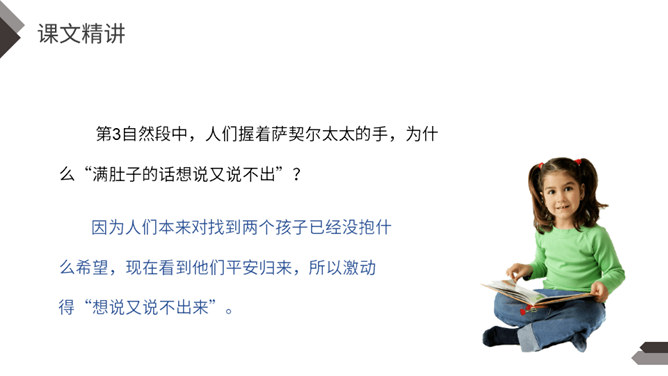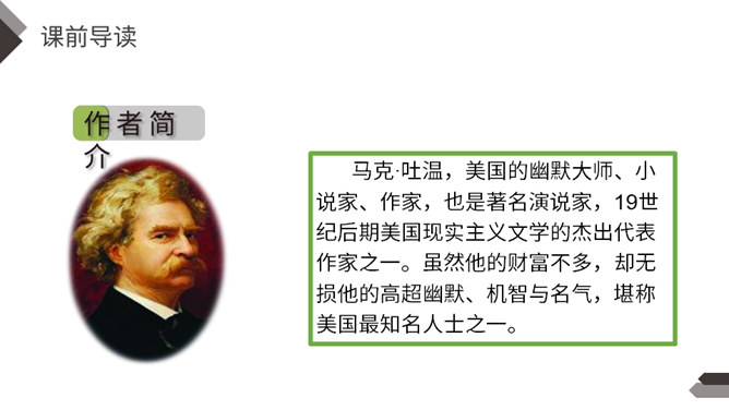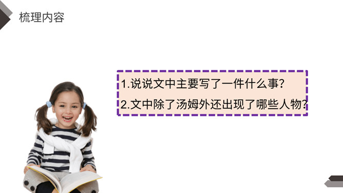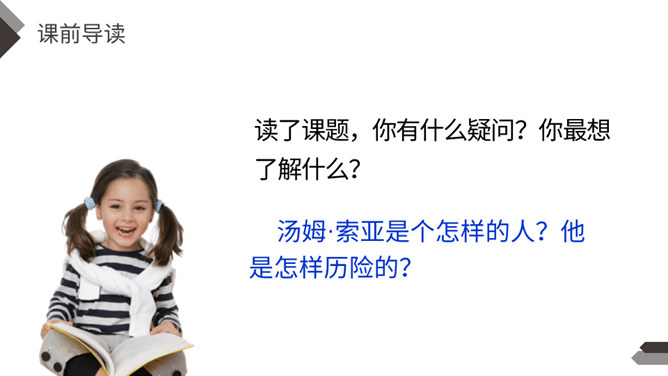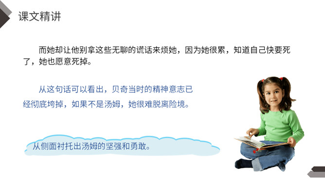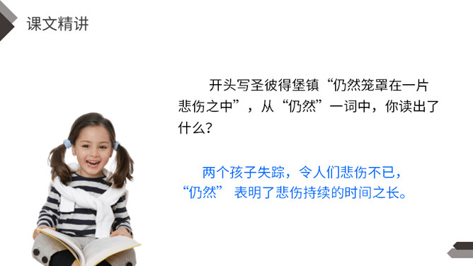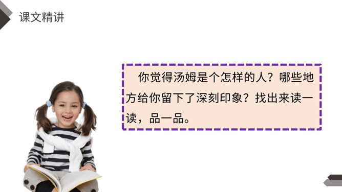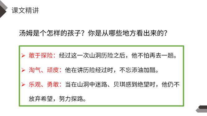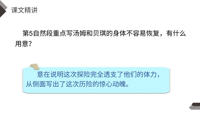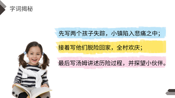 1.说说文中主要写了一件什么事?2.文中除了汤姆外还出现了哪些人物?先写两个孩子失踪,小镇陷入悲痛之中;接着写他们脱险回家,全村欢庆;最后写汤姆讲述历险过程,并探望小伙伴。你觉得汤姆是个怎样的人?哪些地方给你留下了深刻印象?找出来读一读,品一品。 开头写圣彼得堡镇“仍然笼罩在一片悲伤之中”,从“仍然”一词中,你读出了什么?两个孩子失踪,令人们悲伤不已,“仍然” 表明了悲伤持续的时间之长。所属专题:汤姆索亚历险记ppt。