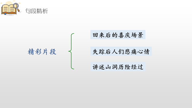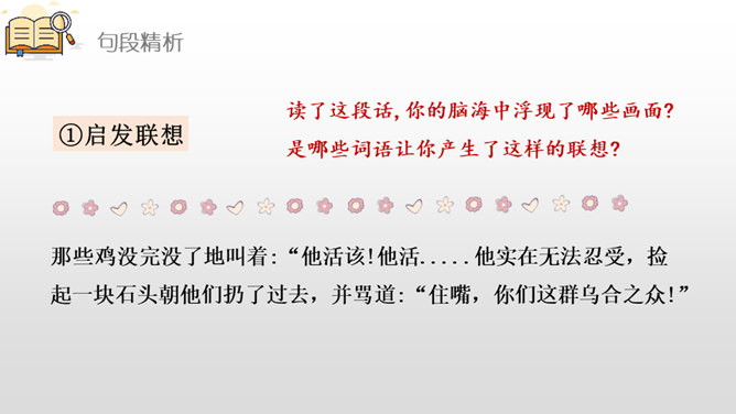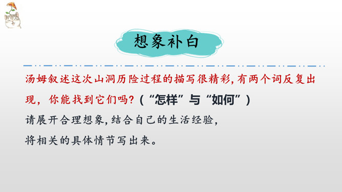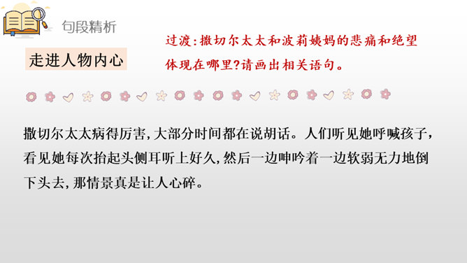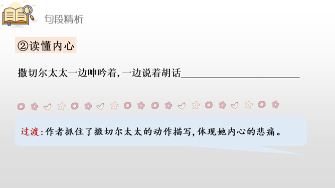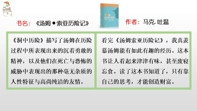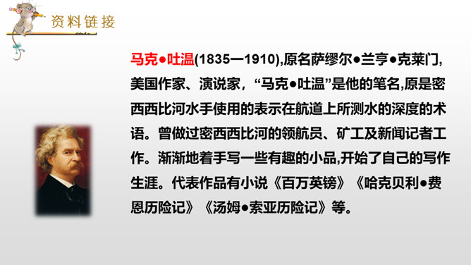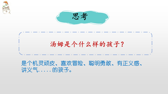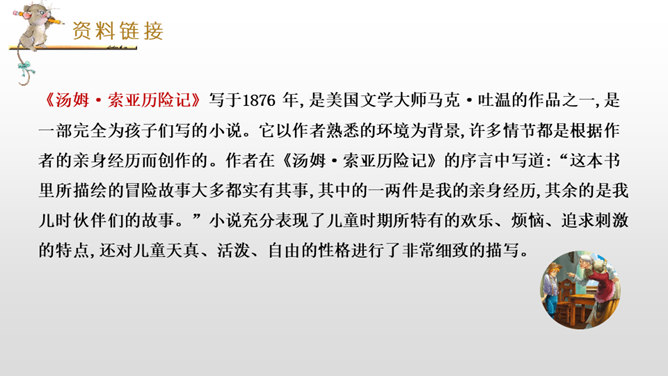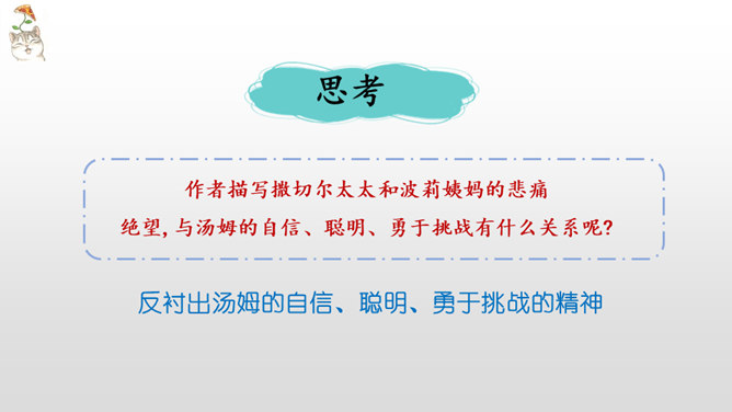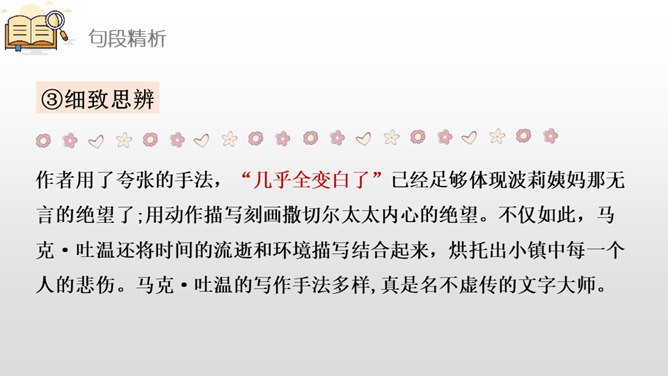 作者用了夸张的手法,“几乎全变白了”已经足够体现波莉姨妈那无言的绝望了;用动作描写刻画撒切尔太太内心的绝望。不仅如此,马克·吐温还将时间的流逝和环境描写结合起来,烘托出小镇中每一个人的悲伤。马克·吐温的写作手法多样,真是名不虚传的文字大师。马克·吐温对写作手法的娴熟运用,还体现在文章的第2.3自然段中请用刚才学到的赏析方法,从此部分中找出作者写作的高明之处。所属专题:汤姆索亚历险记ppt。