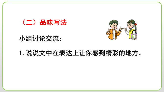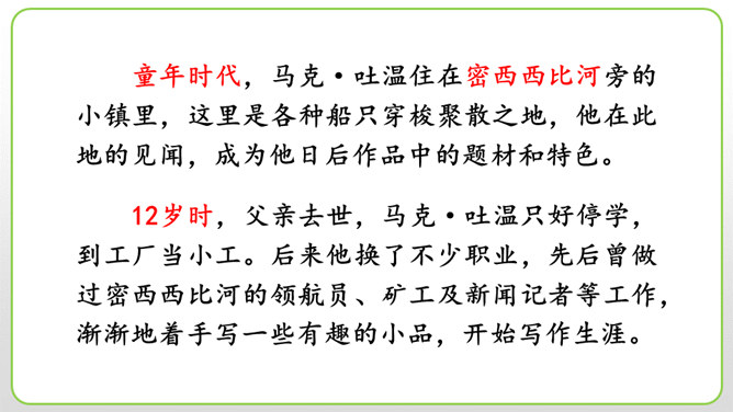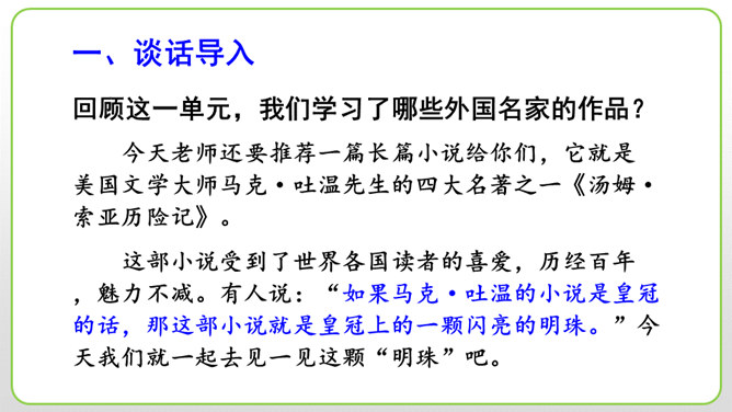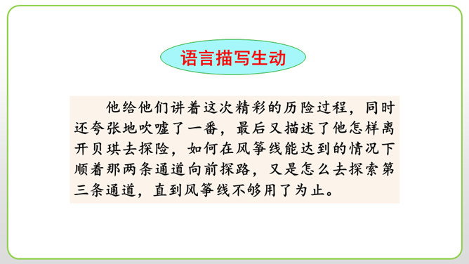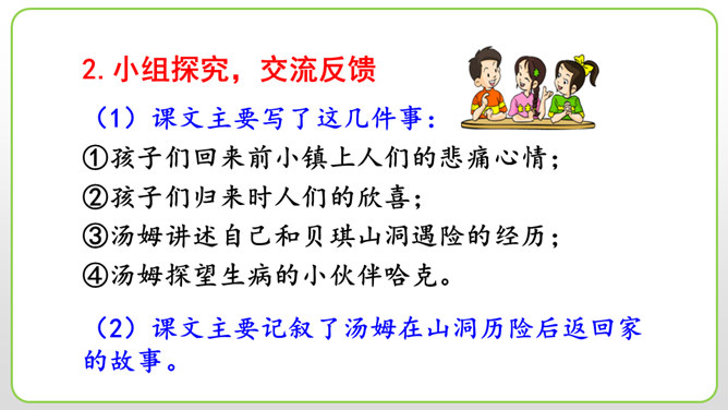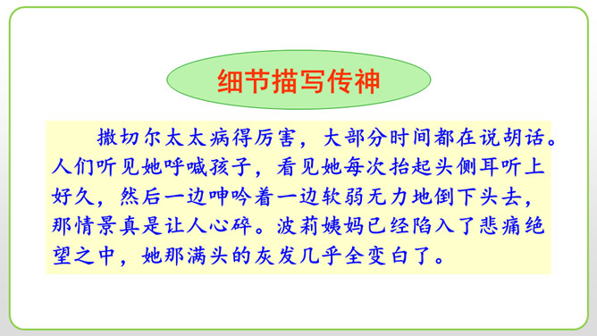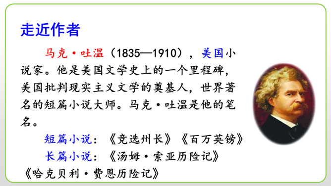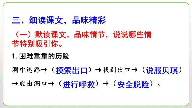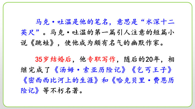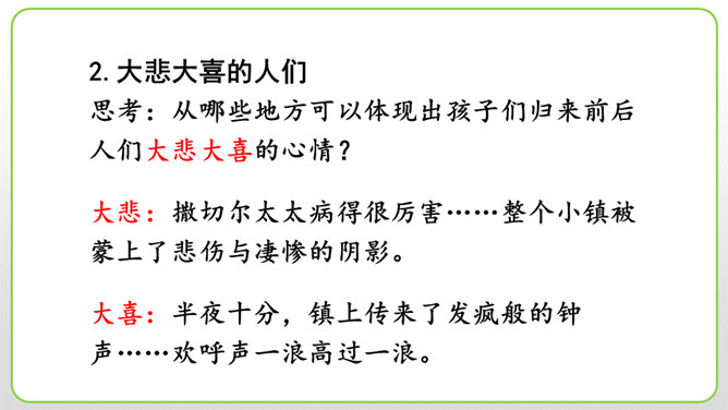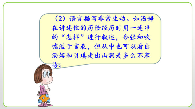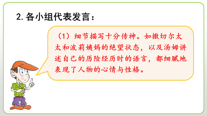 (1)细节描写十分传神。如撒切尔太太和波莉姨妈的绝望状态,以及汤姆讲述自己的历险经历时的语言,都细腻地表现了人物的心情与性格。(2)语言描写非常生动。如汤姆在讲述他的历险经历时用一连串的“怎样”进行叙述,夸张和吹嘘溢于言表,但从中也可以看出汤姆和贝琪走出山洞是多么不容易。这本书的主人公明明是汤姆,可是这里却为什么要花这么多笔墨来细致入微地描写撒切尔太太、波莉姨妈和小镇人们的悲伤绝望呢?所属专题:汤姆索亚历险记ppt。