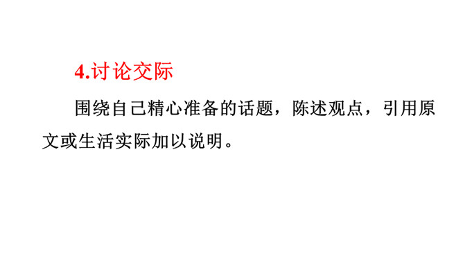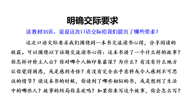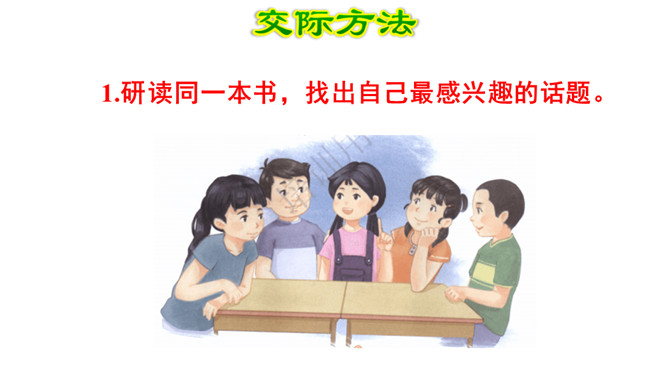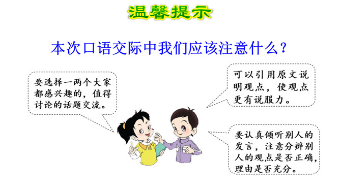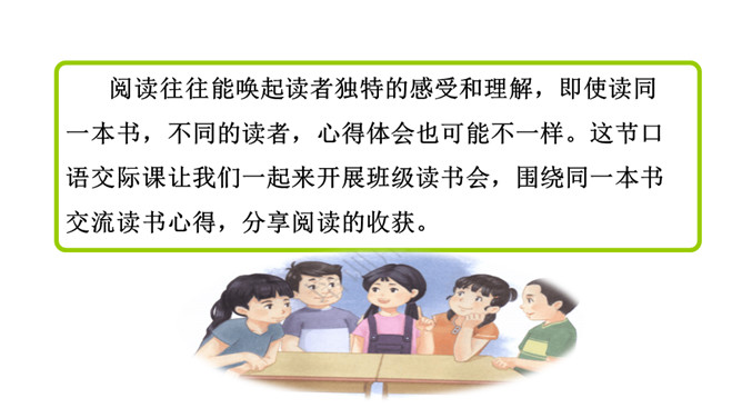 阅读往往能唤起读者独特的感受和理解,即使读同一本书,不同的读者,心得体会也可能不一样。这节口语交际课让我们一起来开展班级读书会,围绕同一本书交流读书心得,分享阅读的收获。本次口语交际中我们应该注意什么?要选择一两个大家都感兴趣的,值得讨论的话题交流。可以引用原文说明观点,使观点更有说服力。要认真倾听别人的发言,注意分辨别人的观点是否正确,理由是否充分。所属专题:同读一本书ppt。