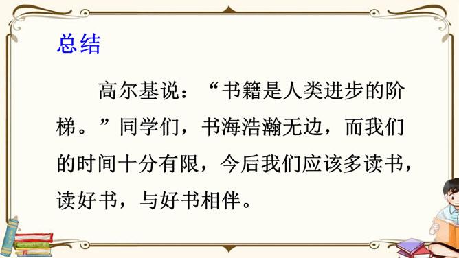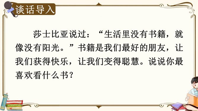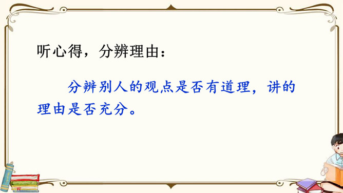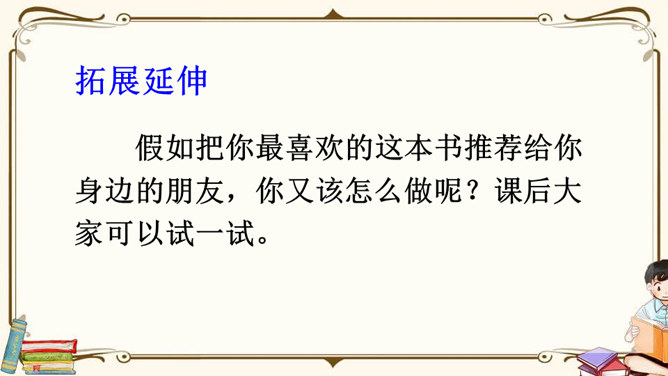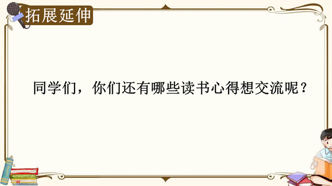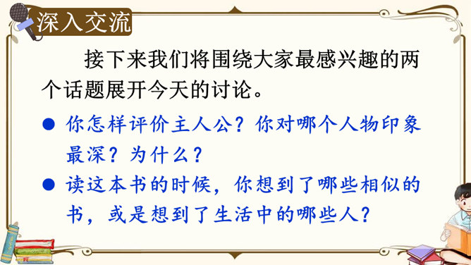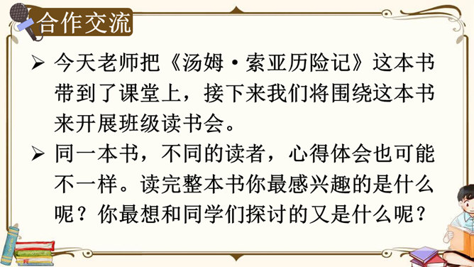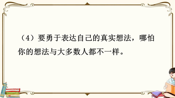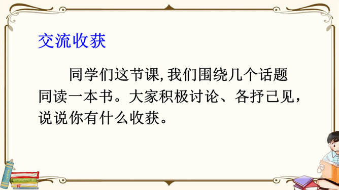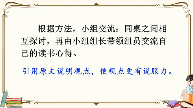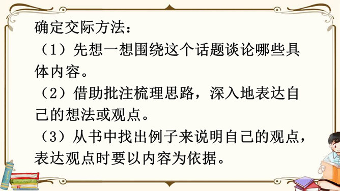 确定交际方法:(1)先想一想围绕这个话题谈论哪些具体内容。(2)借助批注梳理思路,深入地表达自己的想法或观点。(3)从书中找出例子来说明自己的观点,表达观点时要以内容为依据。(4)要勇于表达自己的真实想法,哪怕你的想法与大多数人都不一样。根据方法,小组交流:同桌之间相互探讨,再由小组组长带领组员交流自己的读书心得。引用原文说明观点,使观点更有说服力。分辨别人的观点是否有道理,讲的理由是否充分。所属专题:同读一本书ppt。