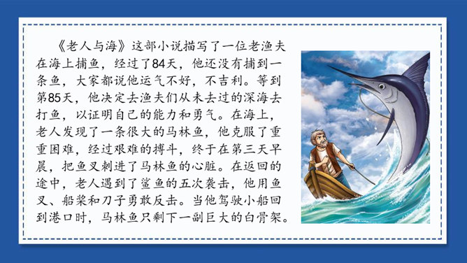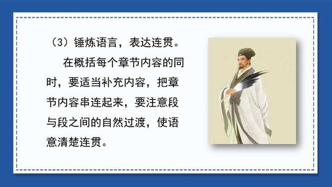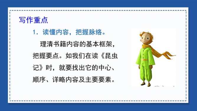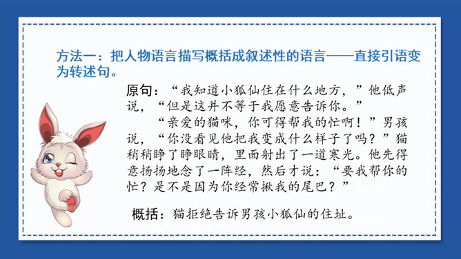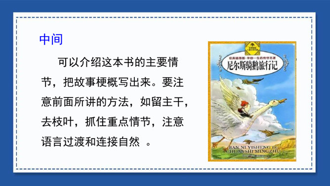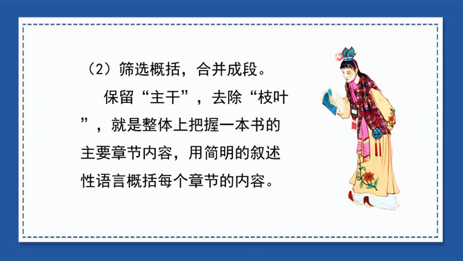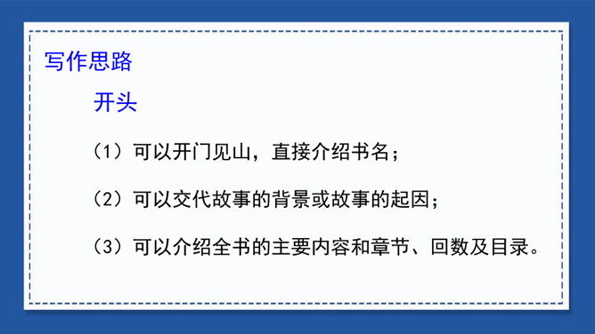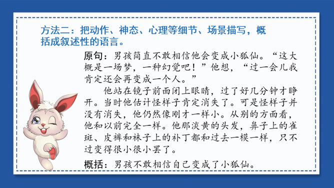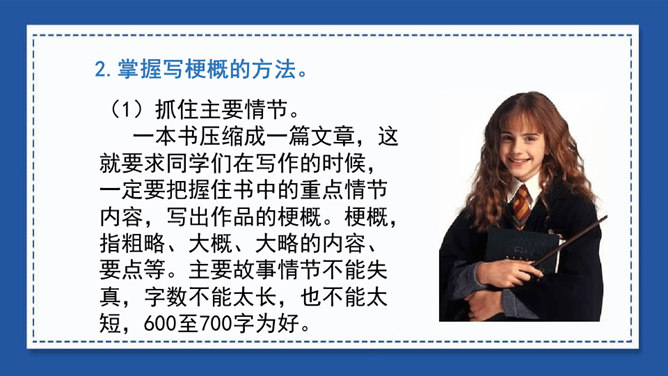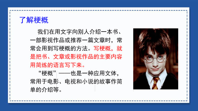 我们在用文字向别人介绍一本书、一部影视作品或推荐一篇文章时,常常会用到写梗概的方法。写梗概,就是把书、文章或影视作品的主要内容用简练的语言写下来。“梗概”——也是一种应用文体,常用于电影、电视和小说的故事作简单的介绍等。方法一:把人物语言描写概括成叙述性的语言——直接引语变为转述句。方法二:把动作、神态、心理等细节、场景描写,概括成叙述性的语言。