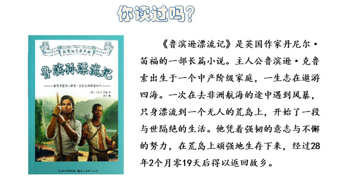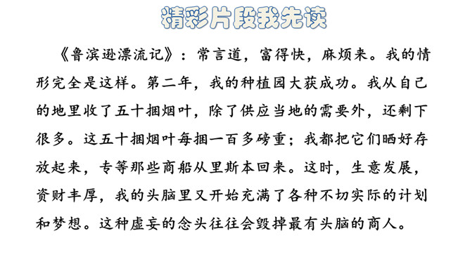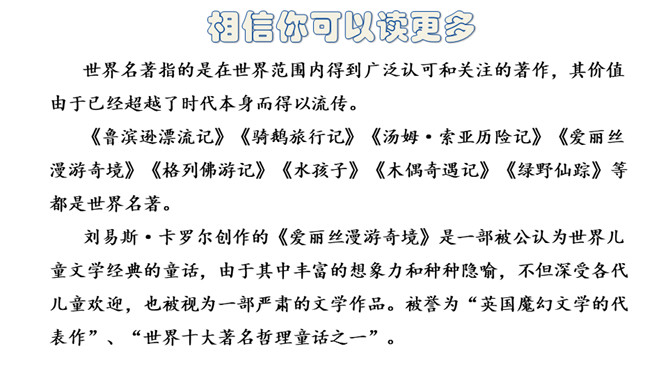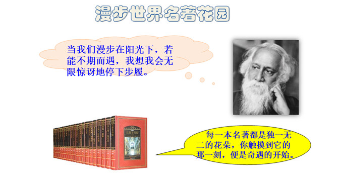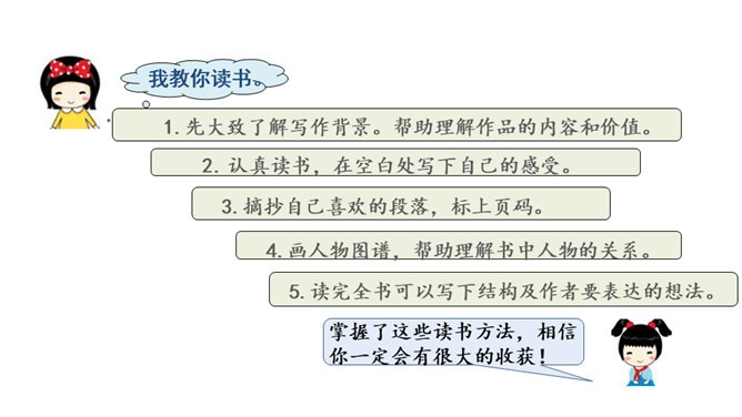 当我们漫步在阳光下,若能不期而遇,我想我会无限惊讶地停下步履。每一本名著都是独一无二的花朵,你触摸到它的那一刻,便是奇遇的开始。我教你读书。1.先大致了解写作背景。帮助理解作品的内容和价值。2. 认真读书,在空白处写下自己的感受。3.摘抄自己喜欢的段落,标上页码。4.画人物图谱,帮助理解书中人物的关系。5.读完全书可以写下结构及作者要表达的想法。掌握了这些读书方法,相信你一定会有很大的收获!所属专题:漫步世界名著花园ppt。