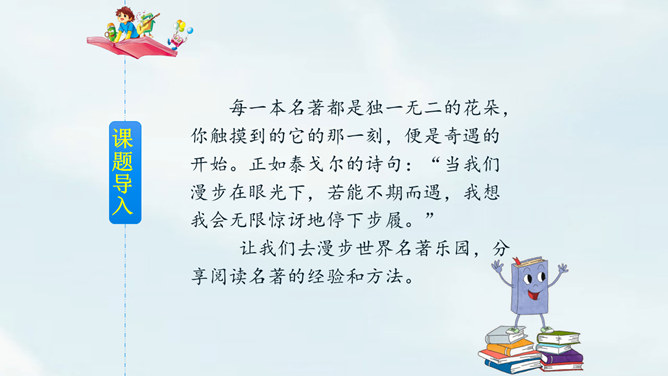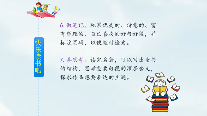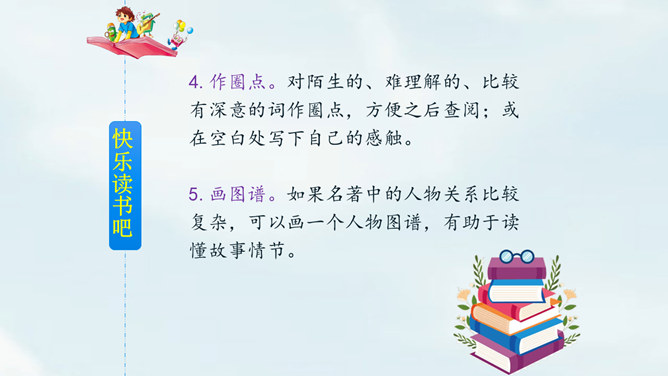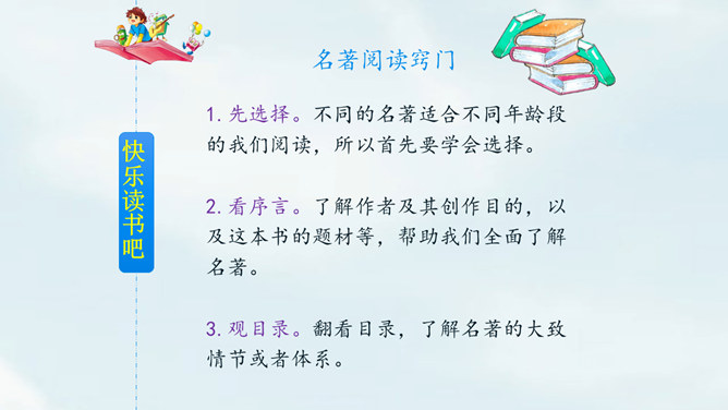 名著阅读窍门:1.先选择。不同的名著适合不同年龄段的我们阅读,所以首先要学会选择。2.看序言。了解作者及其创作目的,以及这本书的题材等,帮助我们全面了解名著。3.观目录。翻看目录,了解名著的大致情节或者体系。 4.作圈点。对陌生的、难理解的、比较有深意的词作圈点,方便之后查阅;或在空白处写下自己的感触。5.画图谱。如果名著中的人物关系比较复杂,可以画一个人物图谱,有助于读懂故事情节。所属专题:漫步世界名著花园ppt。