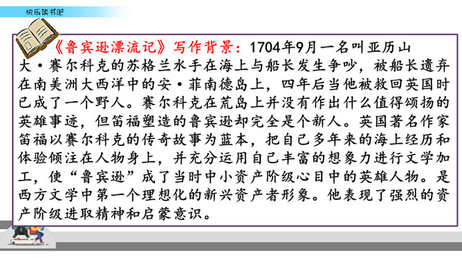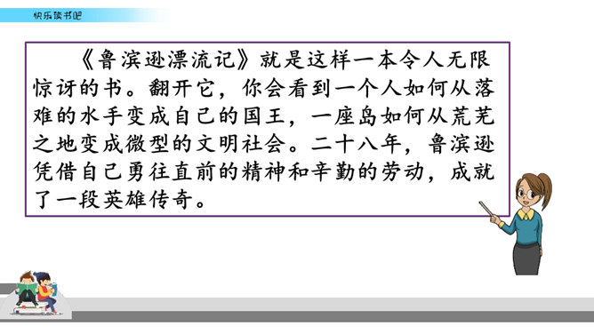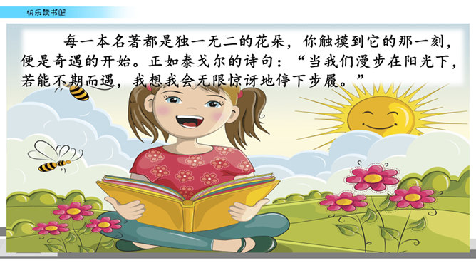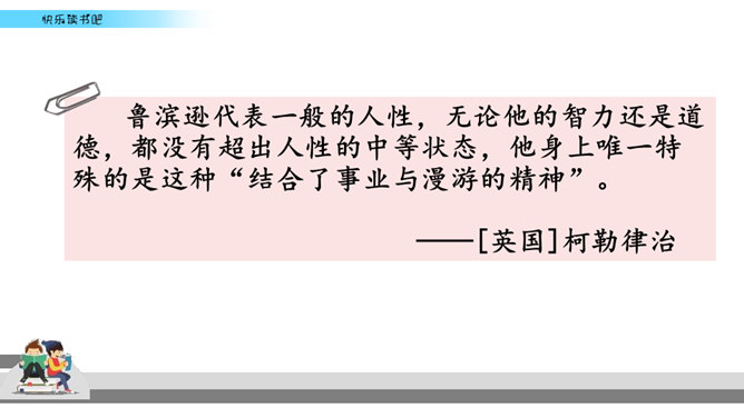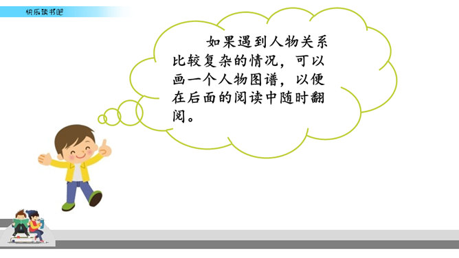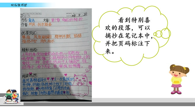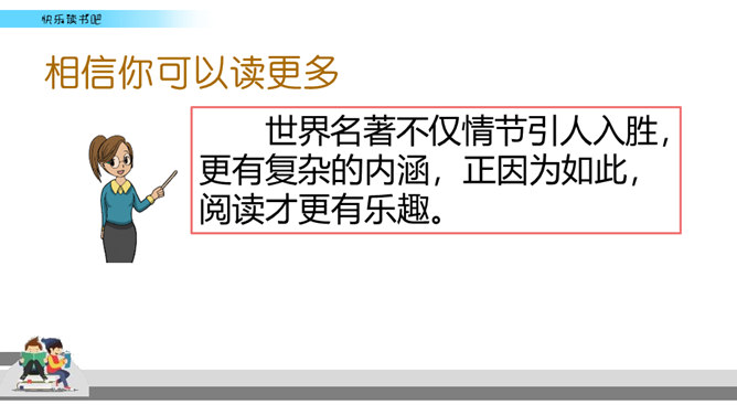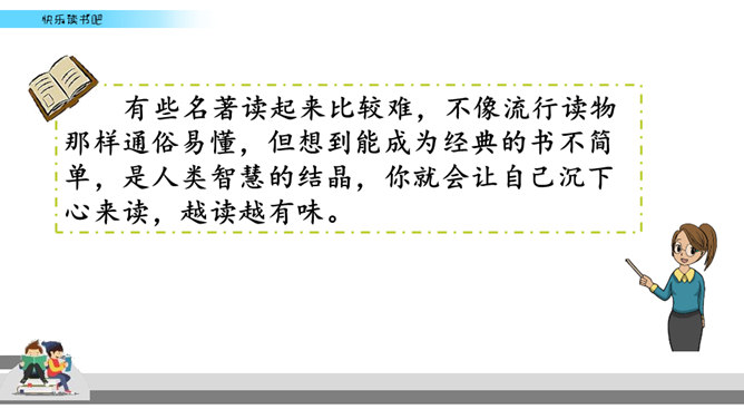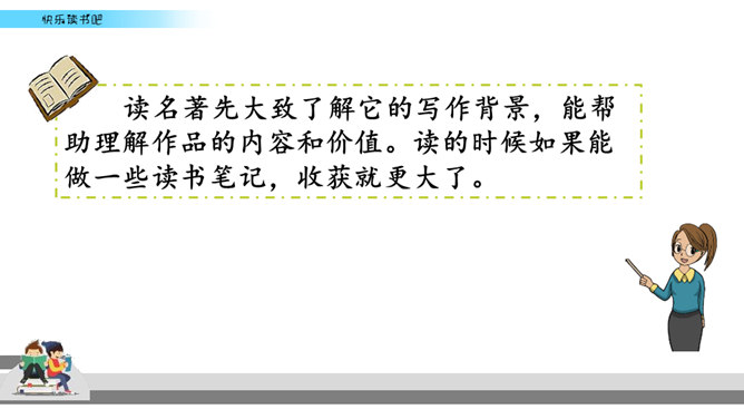 有些名著读起来比较难,不像流行读物那样通俗易懂,但想到能成为经典的书不简单,是人类智慧的结晶,你就会让自己沉下心来读,越读越有味。名著先大致了解它的写作背景,能帮助理解作品的内容和价值。读的时候如果能做一些读书笔记,收获就更大了。我们可以在页面的空白处,随时写下自己的感触。看到特别喜欢的段落,可以摘抄在笔记本中,并把页码标注下来。如果遇到人物关系比较复杂的情况,可以画一个人物图谱,以便在后面的阅读中随时翻阅。所属专题:漫步世界名著花园ppt。