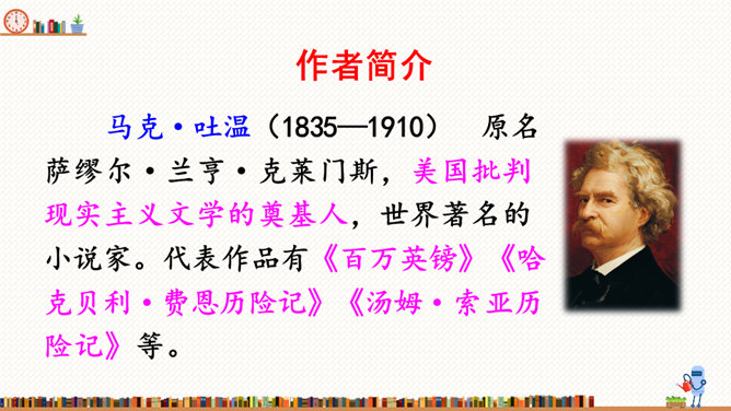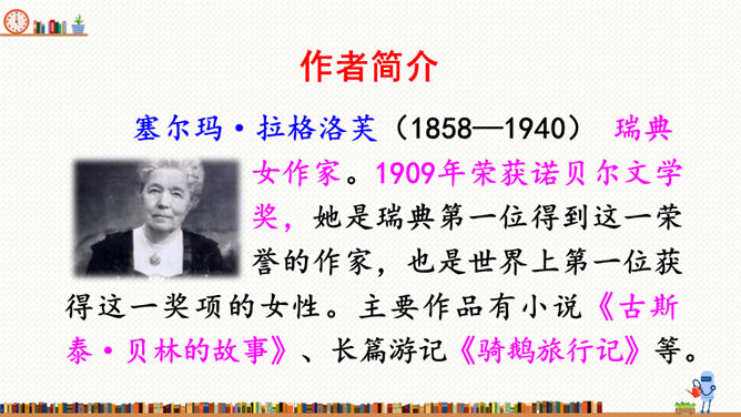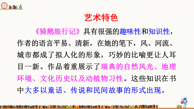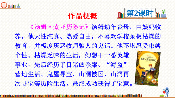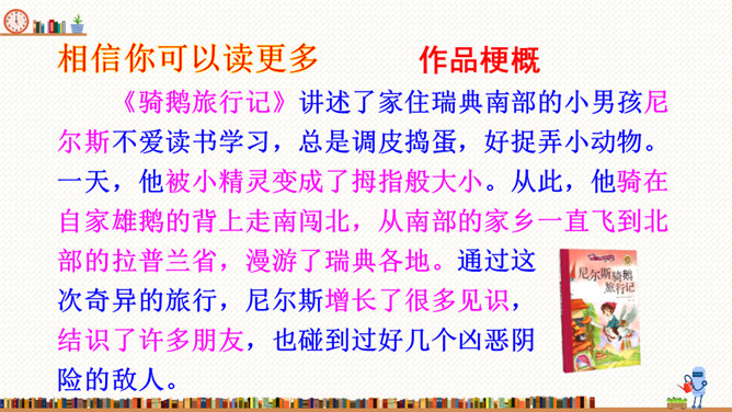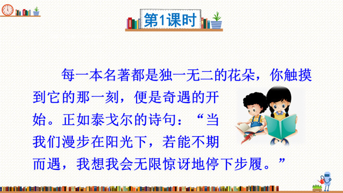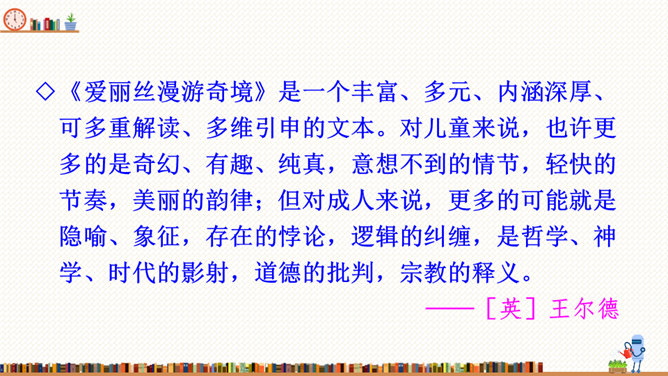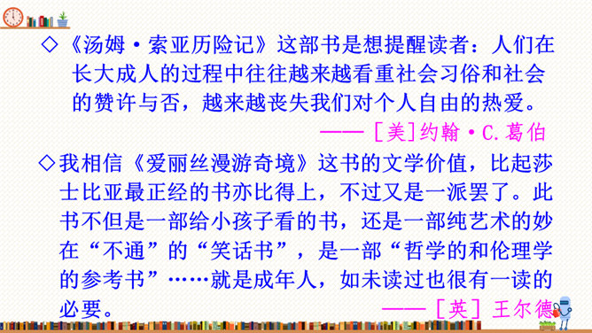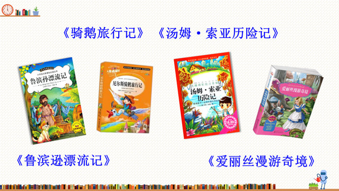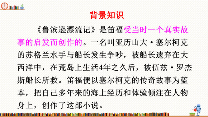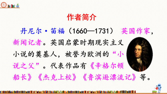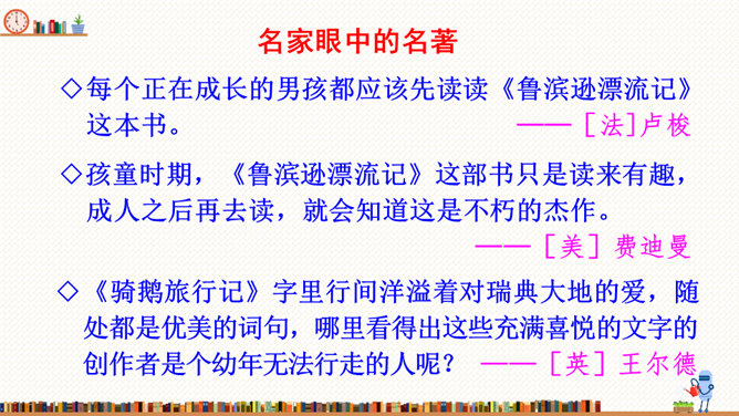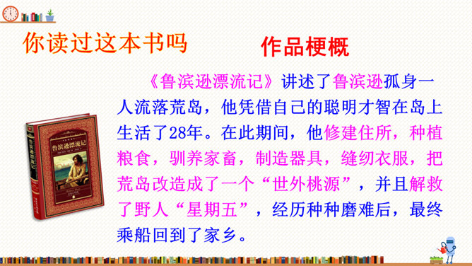 在这部历险记中,笛福采用第一人称叙述的方法来讲述鲁滨逊的冒险经历,重视对人物心理活动的描写,充分展示人物丰富的内心世界。这样不仅拉近了读者与小说的距离,令读者无法相信这不是一个真实的故事,而且也让读者真实地感受到鲁滨逊的性格特征,给读者留下深刻的印象。阅读体会:鲁滨逊流落到无人的荒岛上后没有绝望,也没有妥协,而是勇敢地面对现实。面对重重困难,他冷静思考,积极寻求解决问题的方法。他用勤劳、智慧与顽强,创造了奇迹。他用亲身经历告诉我们:只有坦然从容、积极乐观、勇于拼搏、坚持不懈,才能收获灿烂的人生。所属专题:漫步世界名著花园ppt。