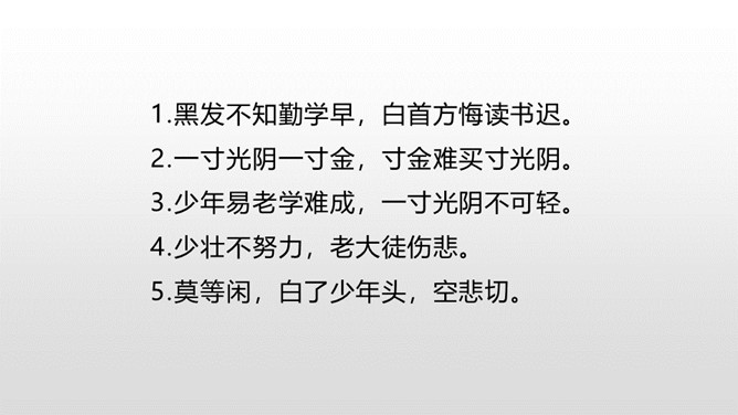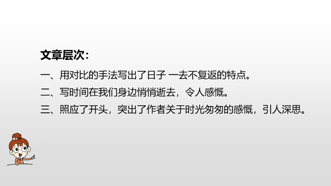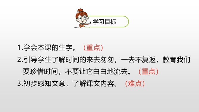 1.学会本课的生字。(重点)2.引导学生了解时间的来去匆匆,一去不复返,教育我们要珍惜时间,不要让它白白地流去。(重点)3.初步感知文意,了解课文内容。(难点)同学们,大家知道哪些珍惜时间的名言警句呀?请同学们思考,课文主要分为哪几层?文章层次:一、用对比的手法写出了日子 一去不复返的特点。二、写时间在我们身边悄悄逝去,令人感慨。三、照应了开头,突出了作者关于时光匆匆的感慨,引人深思。所属专题:匆匆ppt。