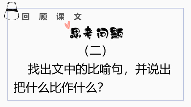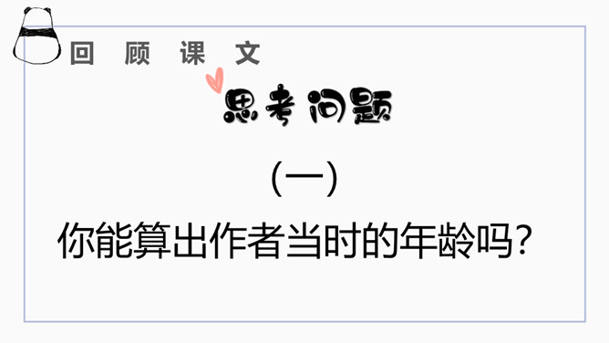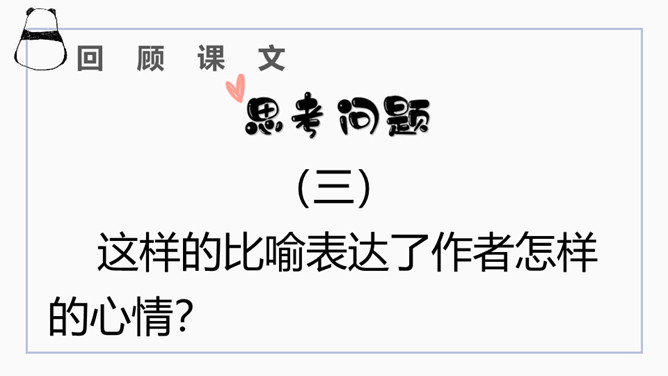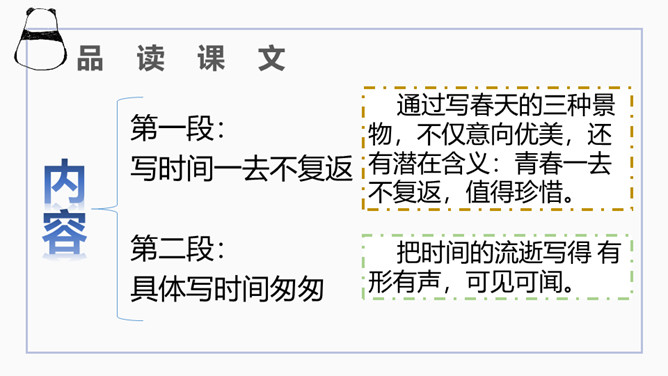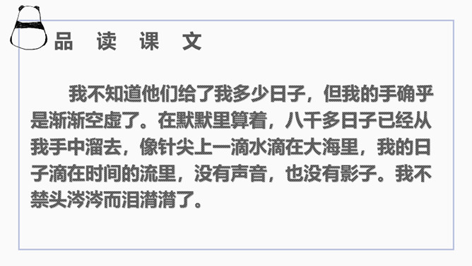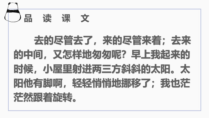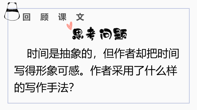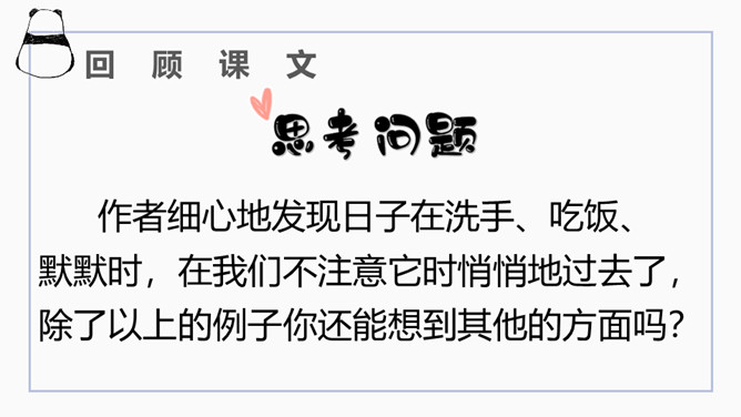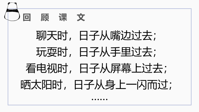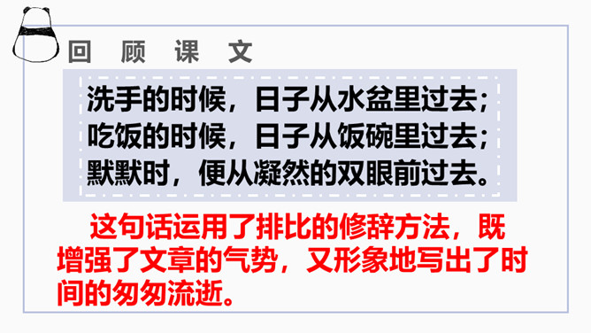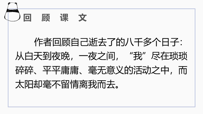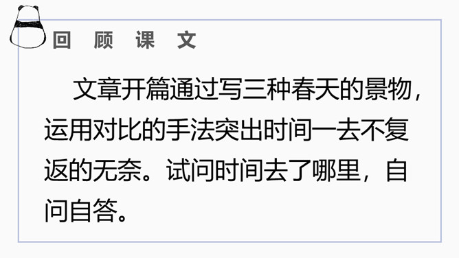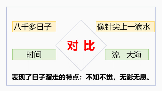 文章开篇通过写三种春天的景物,运用对比的手法突出时间一去不复返的无奈。试问时间去了哪里,自问自答。你能算出作者当时的年龄吗?找出文中的比喻句,并说出把什么比作什么?这样的比喻表达了作者怎样的心情?这句话运用了排比的修辞方法,既增强了文章的气势,又形象地写出了时间的匆匆流逝。这句话运用了拟人的修辞方法,把时间的匆匆流逝写得有形有声,非常形象生动具体。“轻烟”、“薄雾”说明了什么?所属专题:匆匆ppt。