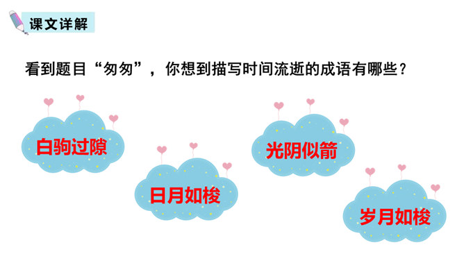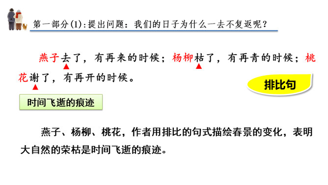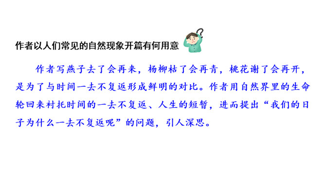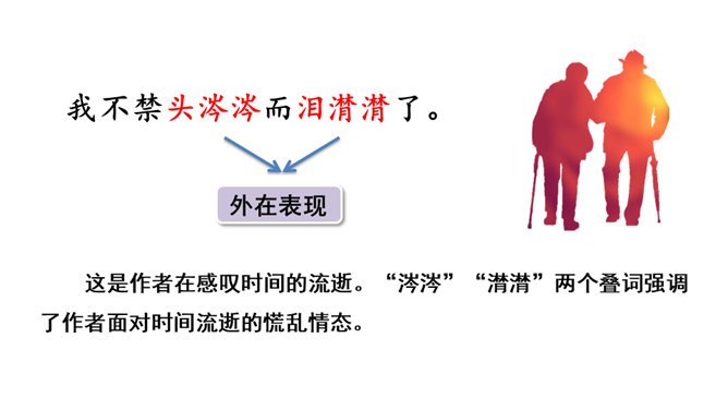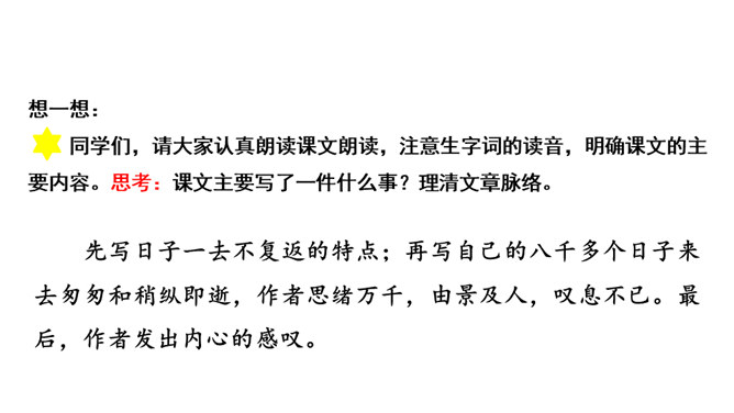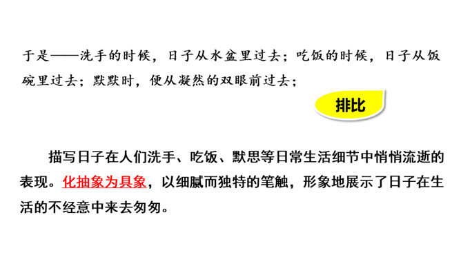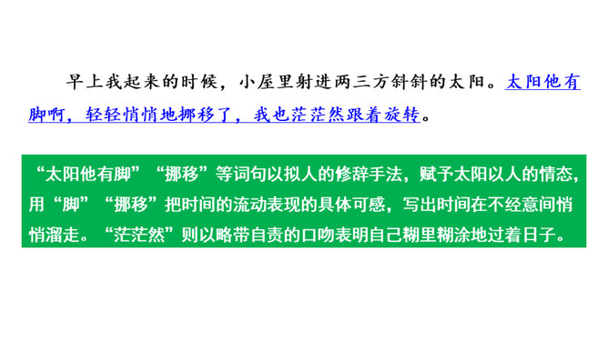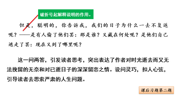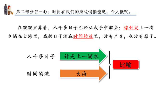 作者运用新奇巧妙的比喻,把自己过去的八千多日子比喻成极小极小的针尖上的水滴,把时间的流比喻成浩瀚的大海。生动形象地写出过去的日子的渺小,消逝的速度之快,无声无息,无影无踪。充分表现出作者因时间无声消逝而十分无奈的愁绪。这一连串层层递进的问句是作者内心的情感独白,既是对时光流逝的感叹,也是对虚度光阴、无所作为的不甘,更是对自己要珍惜时光,有所作为的要求。这一连串问句像一条线,在全文中巧妙地起了牵引情感的线头作用,一层紧扣一层地点明并深化了主题。所属专题:匆匆ppt。