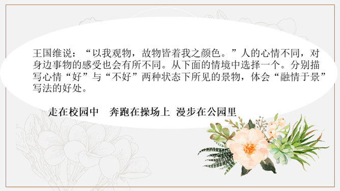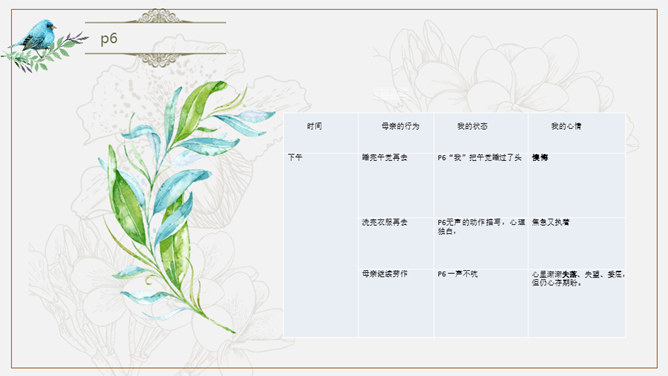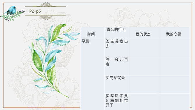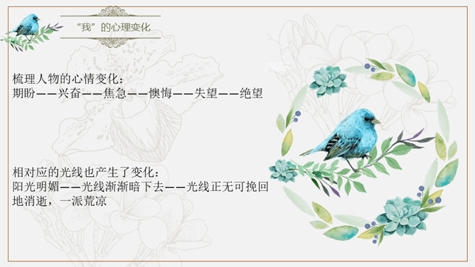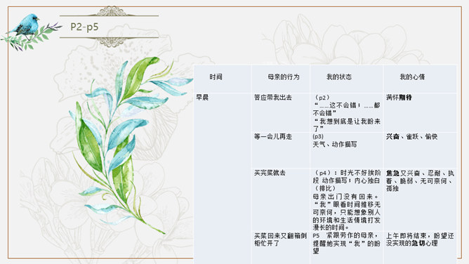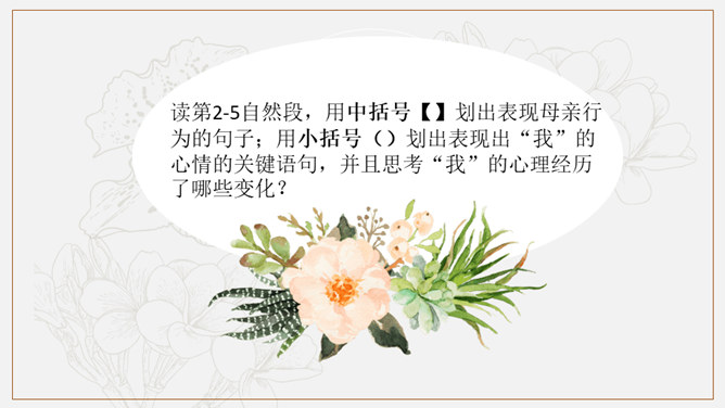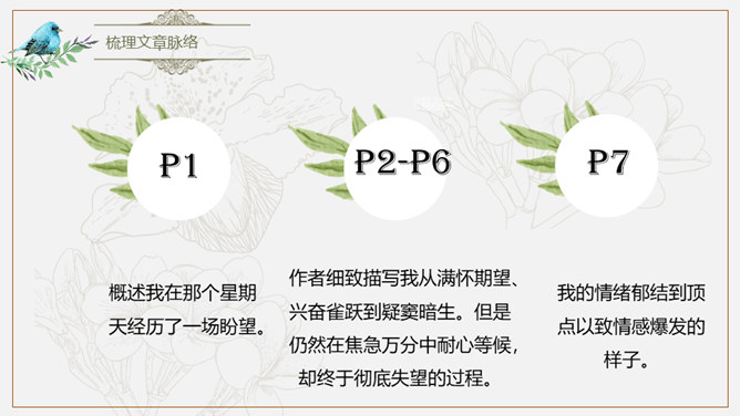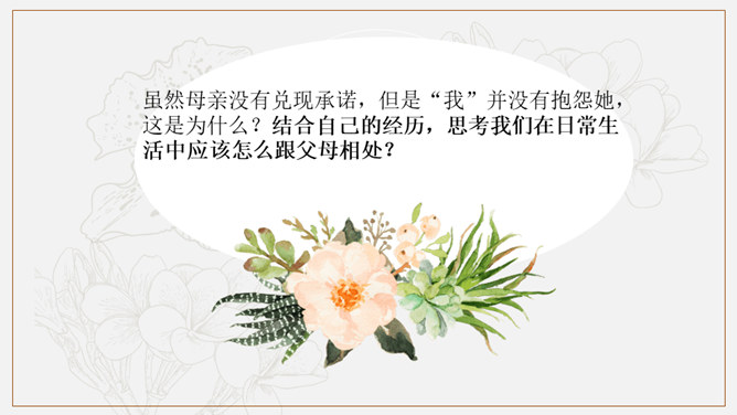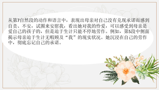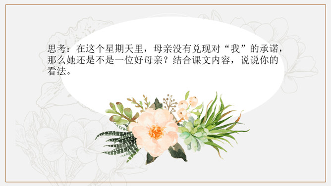 概述我在那个星期天经历了一场盼望。作者细致描写我从满怀期望、兴奋雀跃到疑窦暗生。但是仍然在焦急万分中耐心等候,却终于彻底失望的过程。我的情绪郁结到顶点以致情感爆发的样子。读第2-5自然段,用中括号划出表现母亲行为的句子;用小括号划出表现出“我”的心情的关键语句,并且思考“我”的心理经历了哪些变化?思考:在这个星期天里,母亲没有兑现对“我”的承诺,那么她还是不是一位好母亲?结合课文内容,说说你的看法。所属专题:那个星期天ppt。