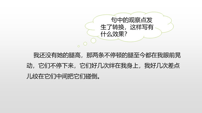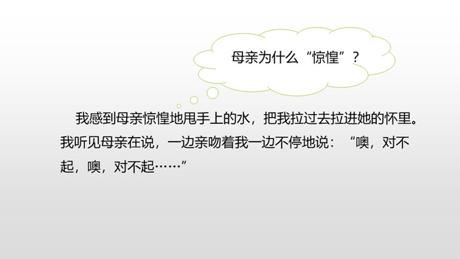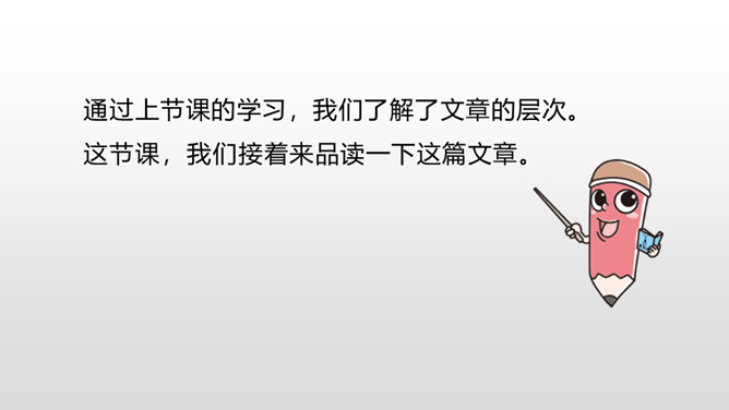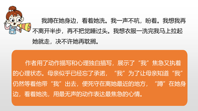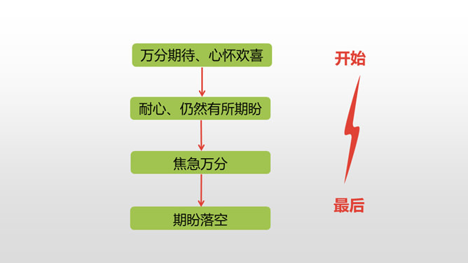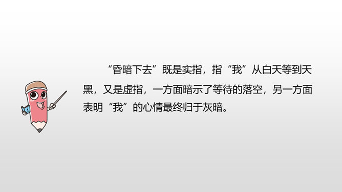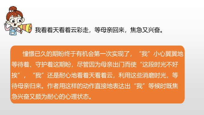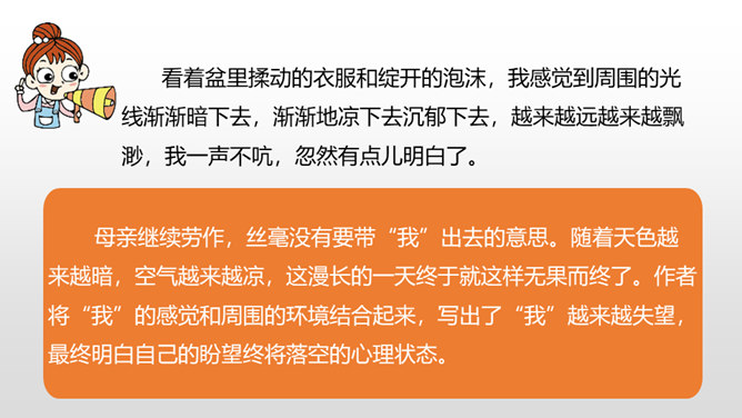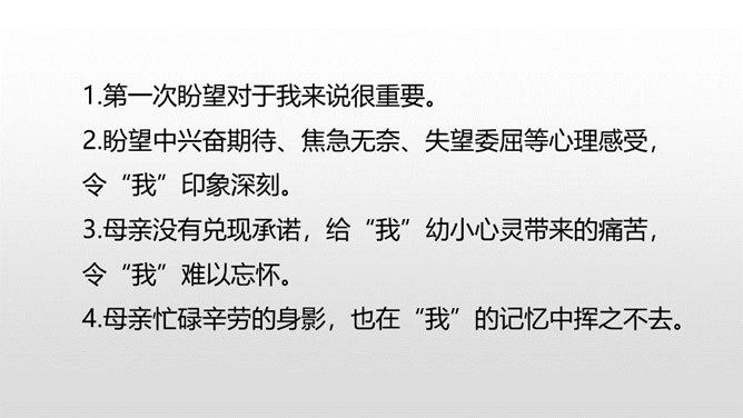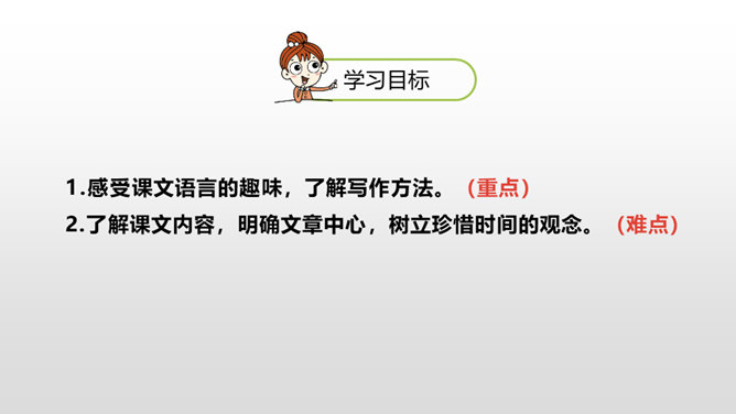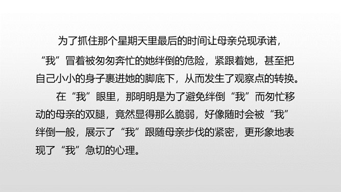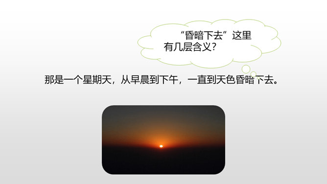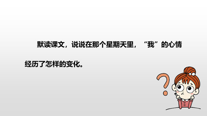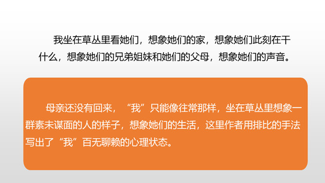 1.感受课文语言的趣味,了解写作方法。(重点)2.了解课文内容,明确文章中心,树立珍惜时间的观念。(难点)通过上节课的学习,我们了解了文章的层次。这节课,我们接着来品读一下这篇文章。默读课文,说说在那个星期天里,“我”的心情经历了怎样的变化。母亲还没有回来,“我”只能像往常那样,坐在草丛里想象一群素未谋面的人的样子,想象她们的生活,这里作者用排比的手法写出了“我”百无聊赖的心理状态。所属专题:那个星期天ppt。