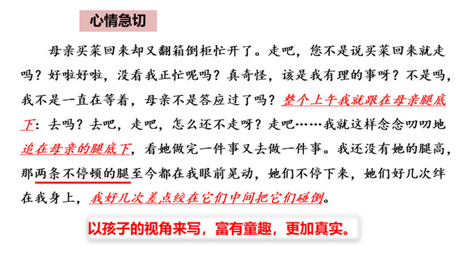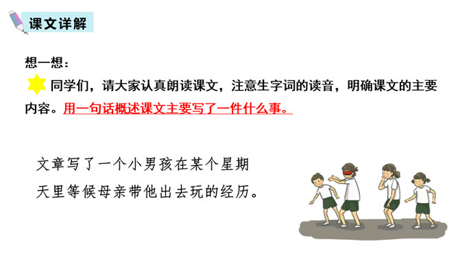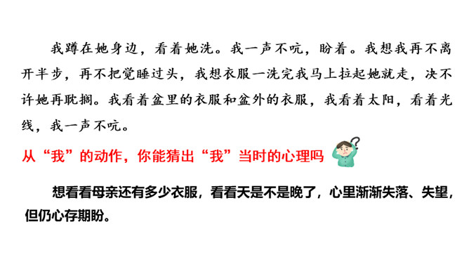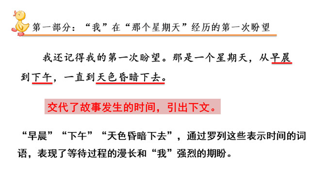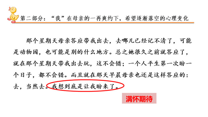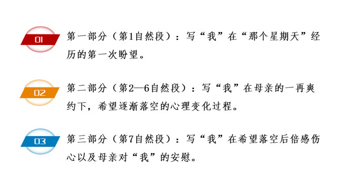 本文写的是“我”第一次盼望的经历,以“那个星期天”作为课题,有什么作用?1)以“那个星期天”为题,点明了故事发生的具体时间,既突出了作者对这次盼望经历的难忘,同时表明了这次经历对于作者人生的独特意义。(2)以“那个星期天”为题,有利于按时间为线索组织材料,使文章结构有序、紧凑。(3)以“那个星期天”为题,留有悬念,引起读者的阅读兴趣。“我”为什么不直接拉着母亲出门,一定要等母亲忙完呢?从中你觉得“我”是个怎样的孩子?因为“我”是一个乖巧、内敛、懂事的孩子,能够体谅母亲的辛劳,所以选择等母亲忙玩琐事。所属专题:那个星期天ppt。