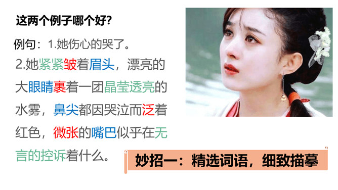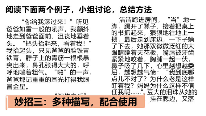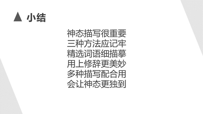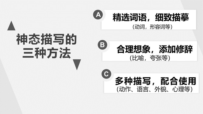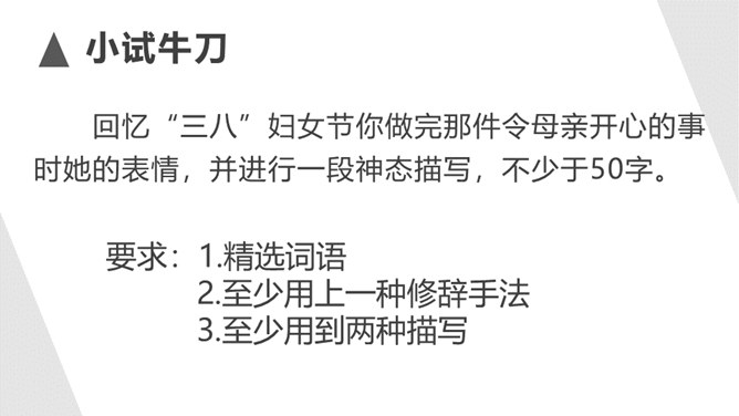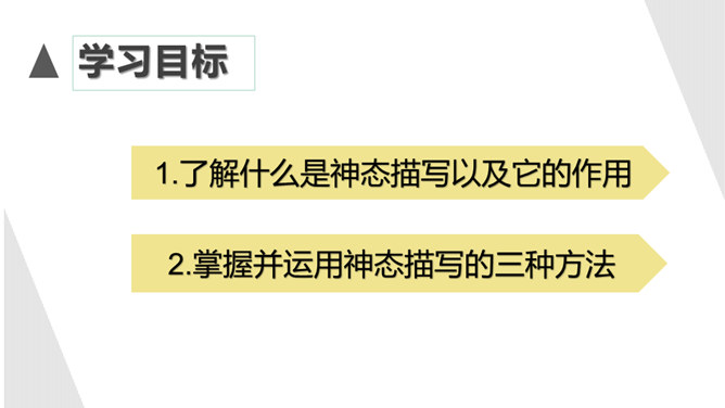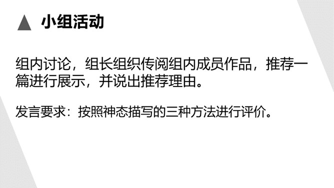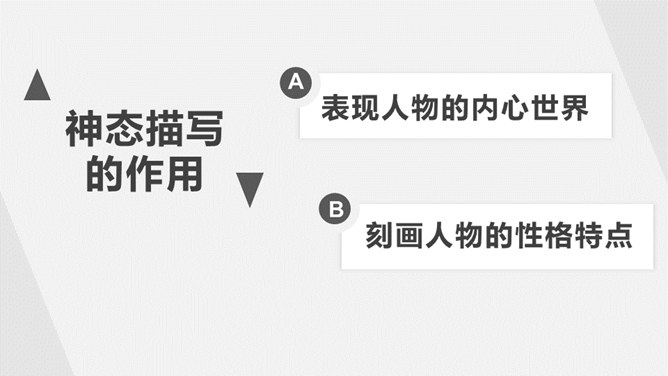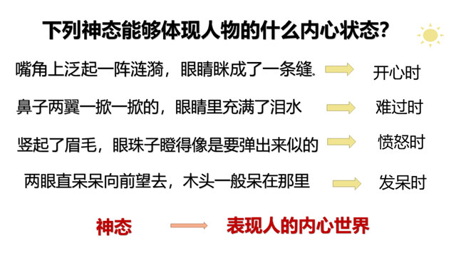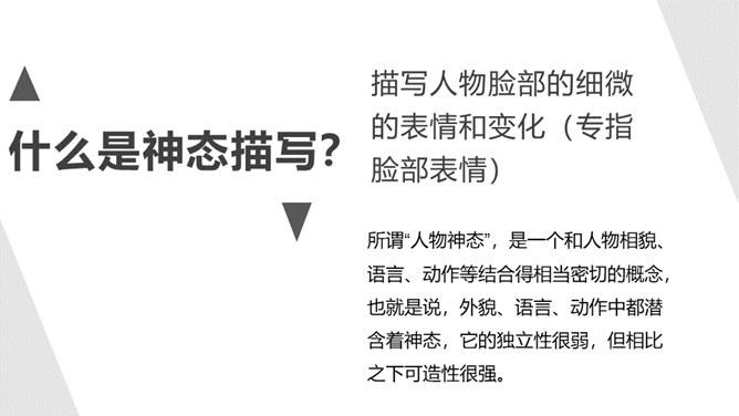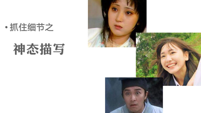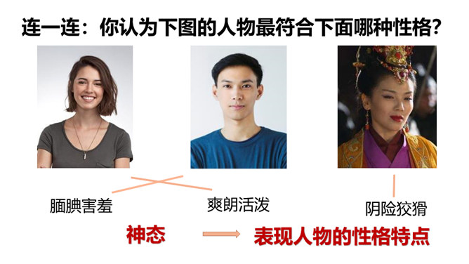 1.了解什么是神态描写以及它的作用。2.掌握并运用神态描写的三种方法。描写人物脸部的细微的表情和变化(专指脸部表情)所谓“人物神态”,是一个和人物相貌、语言、动作等结合得相当密切的概念,也就是说,外貌、语言、动作中都潜含着神态,它的独立性很弱,但相比之下可造性很强。连一连:你认为下图的人物最符合下面哪种性格?组内讨论,组长组织传阅组内成员作品,推荐一篇进行展示,并说出推荐理由。所属专题:让真情自然流露ppt。