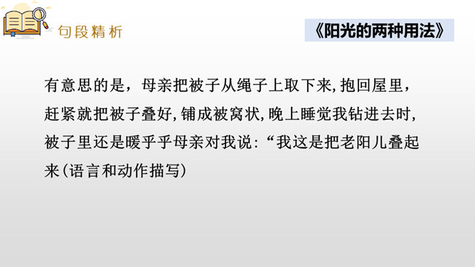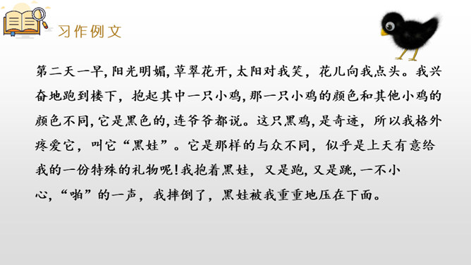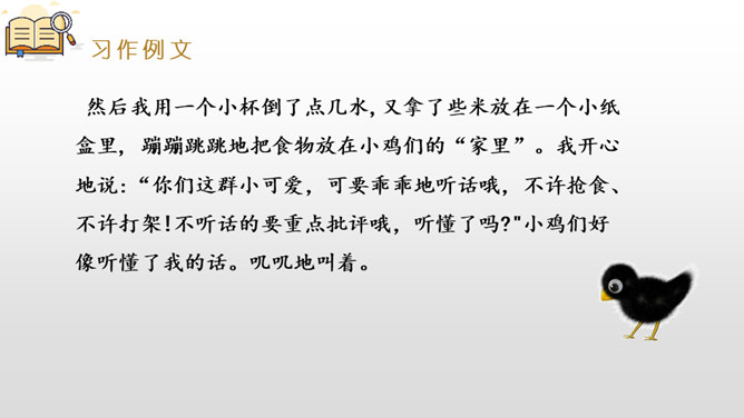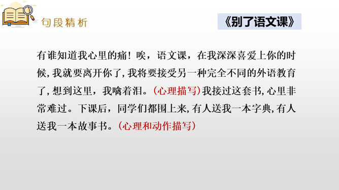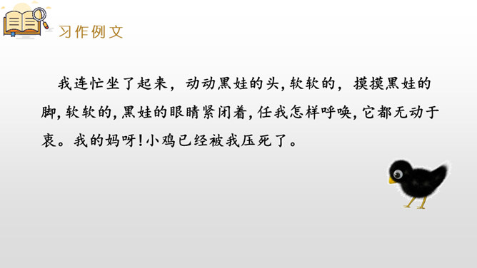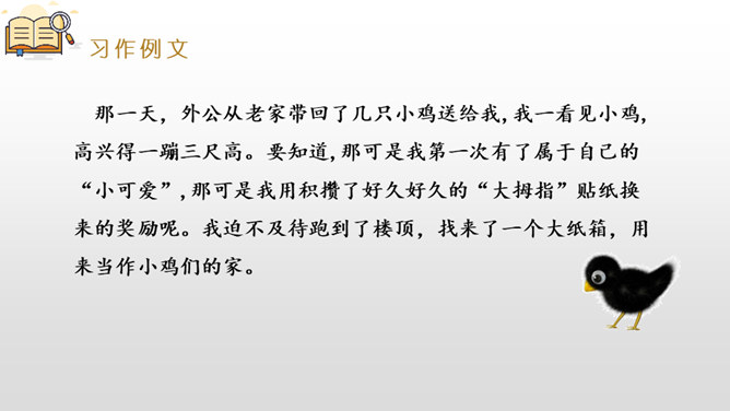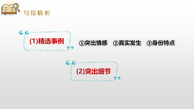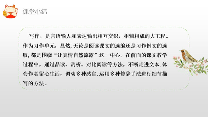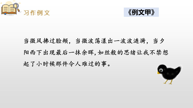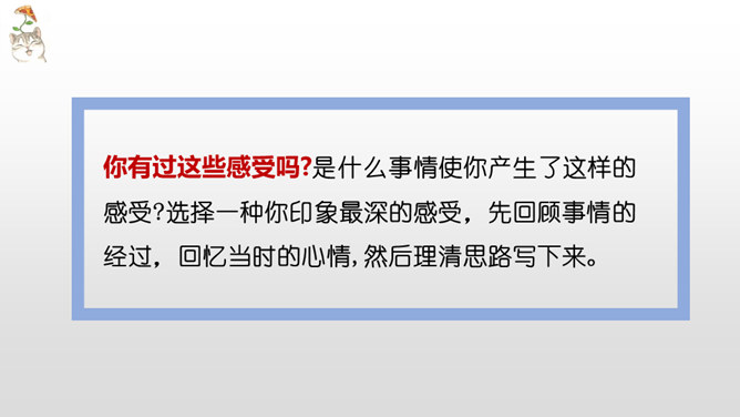 是什么事情使你产生了这样的感受?选择一种你印象最深的感受,先回顾事情的经过,回忆当时的心情,然后理清思路写下来。写作,是言语输人和表达输出相互交织,相辅相成的大工程。作为习作单元,显然,无论是阅读课文的选编还是习作例文的选取,都是围绕“让真情自然流露”这一中心。在前面的课文教学过程中,通过品读、赏析、对比阅读等方法,不断走进文本,体会作者留心生活,调动多种感官,运用多种修辞手法进行细节描写的方法。所属专题:让真情自然流露ppt。