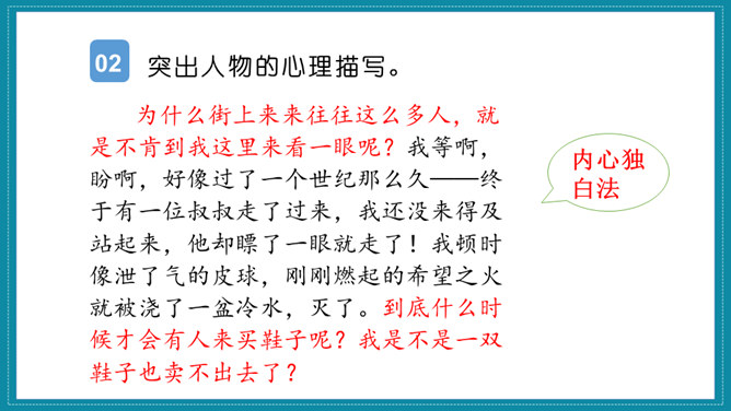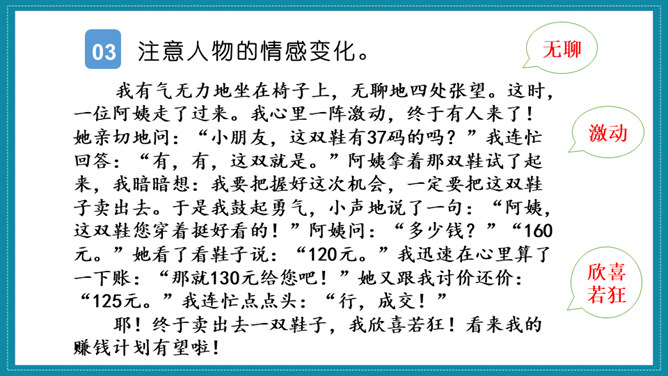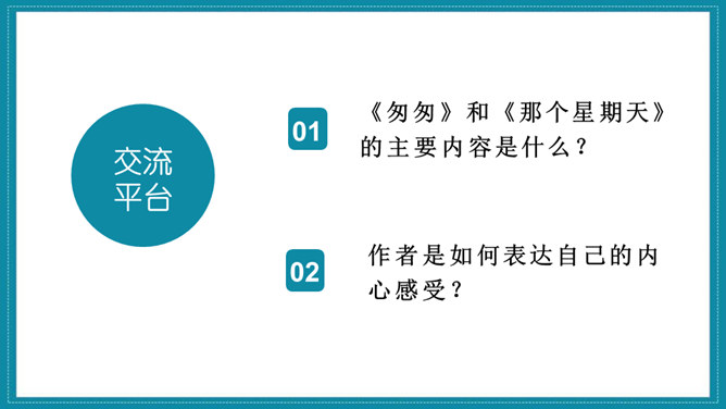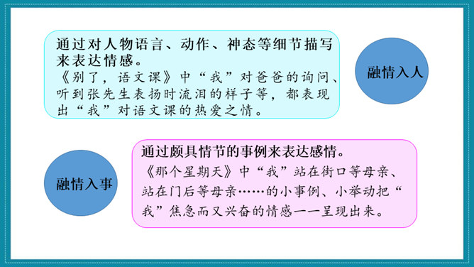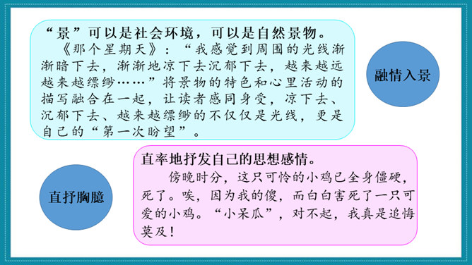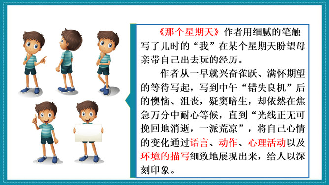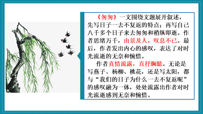 《匆匆》一文围绕文题展开叙述,先写日子一去不复返的特点;再写自己八千多个日子来去匆匆和稍纵即逝。作者思绪万千,由景及人,叹息不已。最后,作者发出内心的感叹,表达了对时光流逝的无奈和惋惜。作者真情流露,直抒胸臆。无论是写燕子、杨柳、桃花,还是写太阳,都与“我们的日子为什么一去不复返呢”的感叹融为一体,处处流露出作者对时光流逝感到无奈和惋惜。《那个星期天》作者用细腻的笔触写了儿时的“我”在某个星期天盼望母亲带自己出去玩的经历。作者从一早就兴奋雀跃、满怀期望的等待写起,写到中午“错失良机”后的懊恼、沮丧,疑窦暗生,却依然在焦急万分中耐心等候,直到“光线正无可挽回地消逝,一派荒凉”,将自己心情的变化通过语言、动作、心理活动以及环境的描写细致地展现出来,给人以深刻印象。所属专题:让真情自然流露ppt。