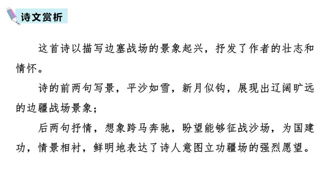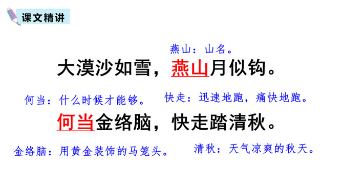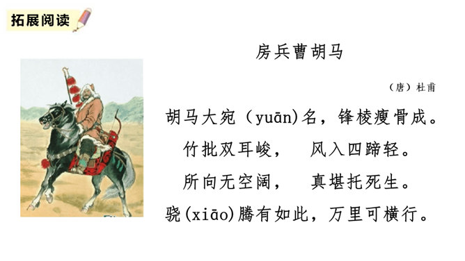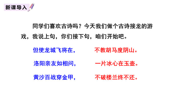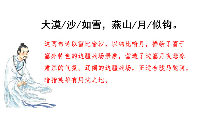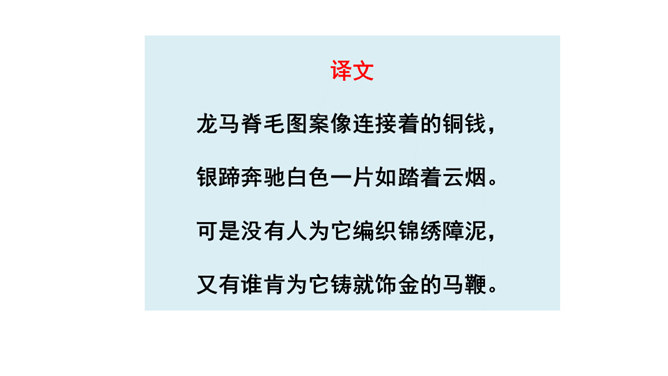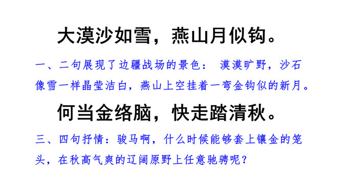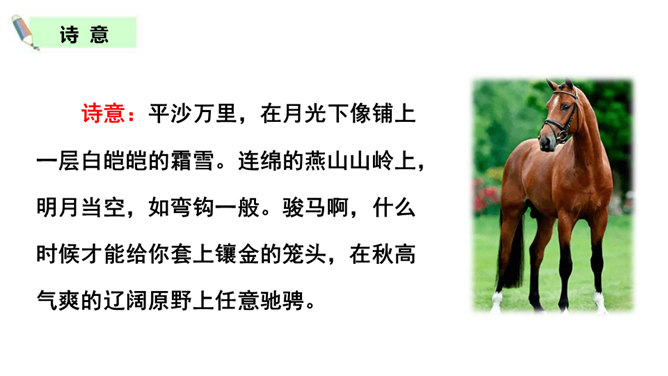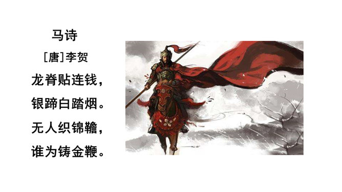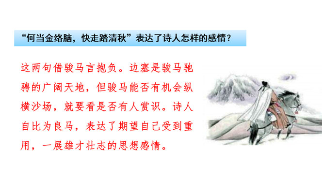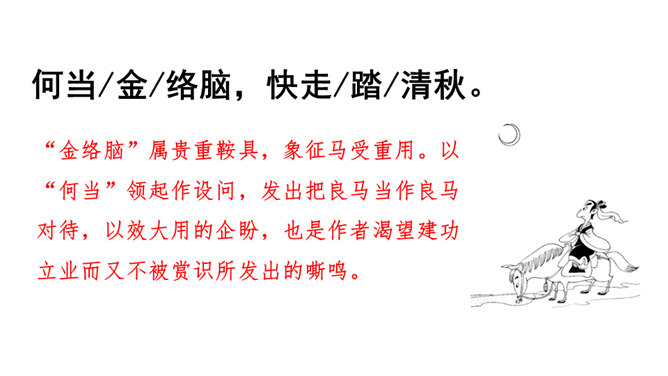 同学们喜欢古诗吗?今天我们做个古诗接龙的游戏,我说上句,你们接下句,咱们开始吧。这两句诗以雪比喻沙,以钩比喻月,描绘了富于塞外特色的边疆战场景象,营造了边塞月夜悲凉肃杀的气氛。辽阔的边疆战场,正适合骏马驰骋,暗指英雄有用武之地。“金络脑”属贵重鞍具,象征马受重用。以“何当”领起作设问,发出把良马当作良马对待,以效大用的企盼,也是作者渴望建功立业而又不被赏识所发出的嘶鸣。所属专题:马诗ppt。