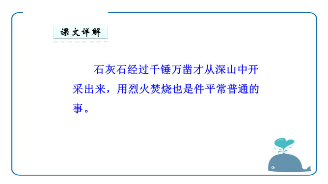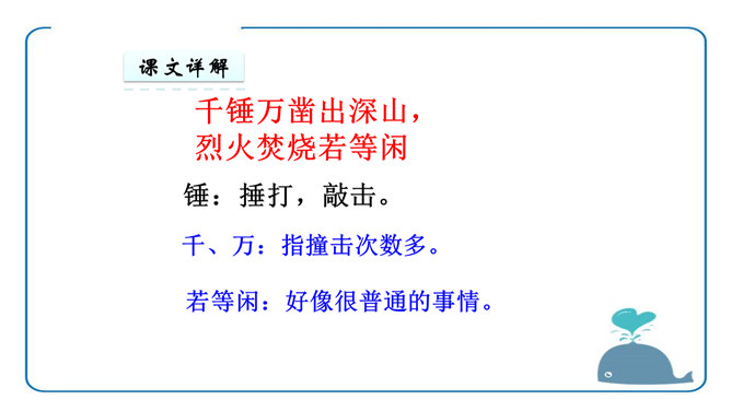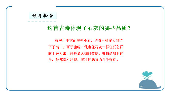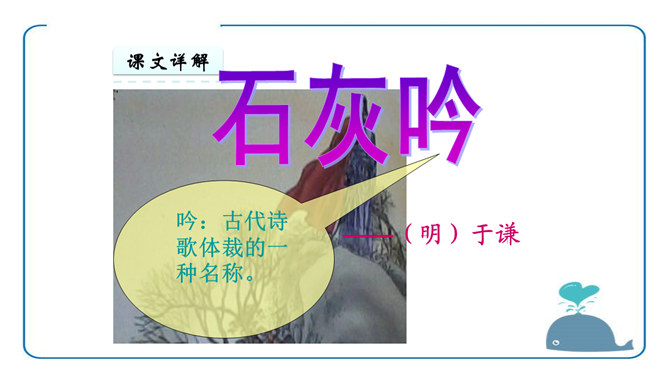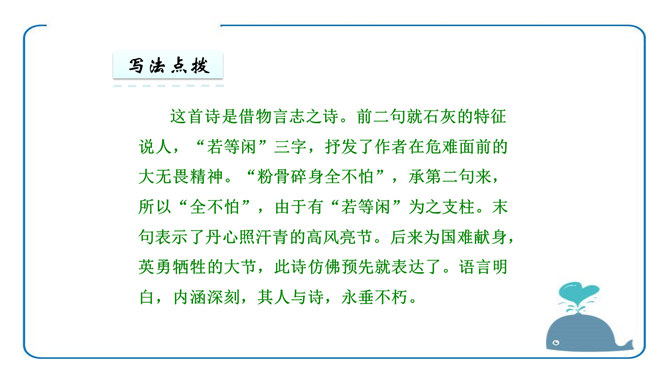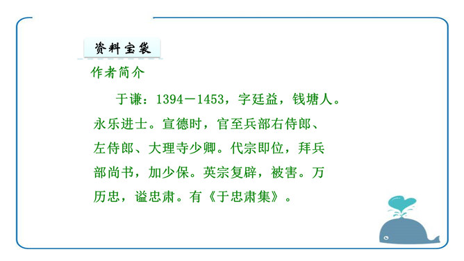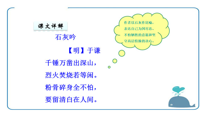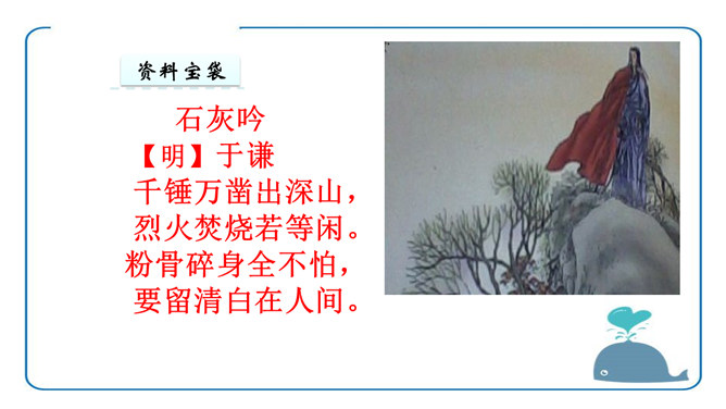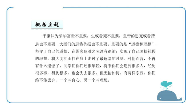 于谦认为荣华富贵不重要,生或者死不重要,皇帝的恩宠或者猜忌也不重要,大臣们的恩将仇报也不重要。重要的是“道德和理想”,坚守了自己的道德,在国家危难之际没有退缩;实现了自己匡扶社稷的理想,将大明江山扛在肩上走过了最危险的时刻。对他而言,不再有什么遗憾了。同学们你们还很年轻,将来你们会遇到很多人,经历很多事,得到很多,也会失去很多,但无论如何,有两样东西,你们绝不能丢弃,一个叫良心,另一个叫理想。所属专题:石灰吟ppt。
