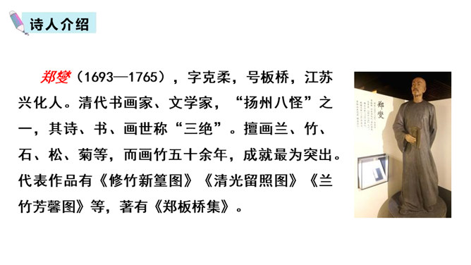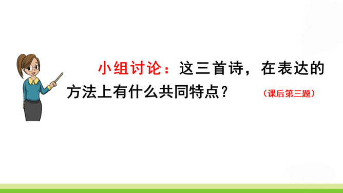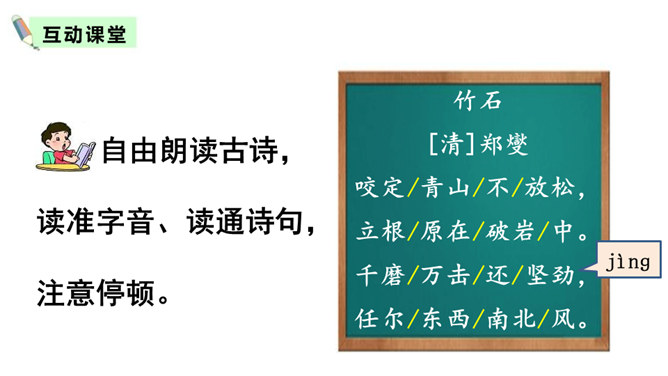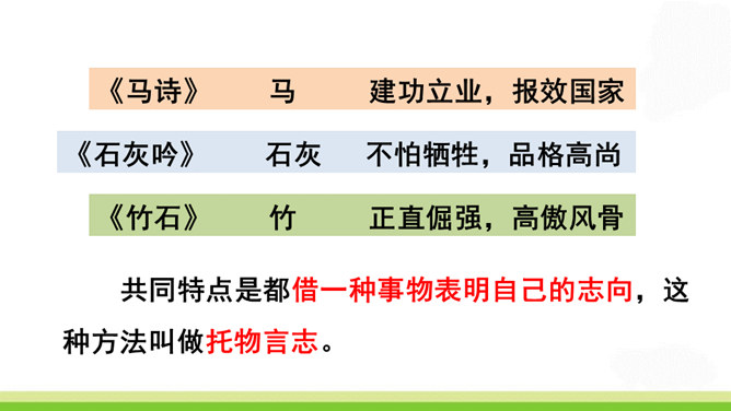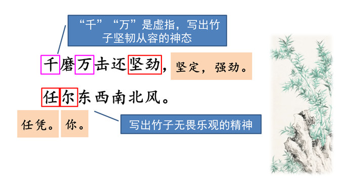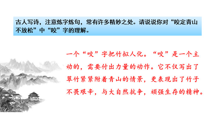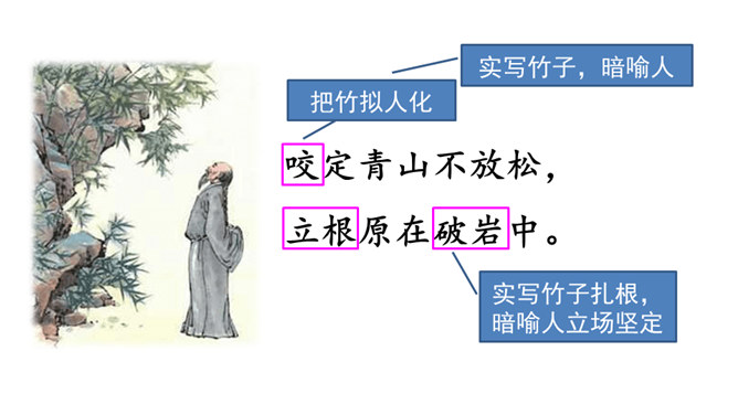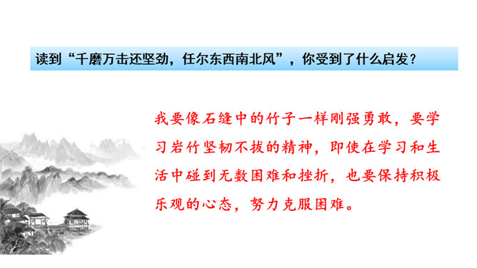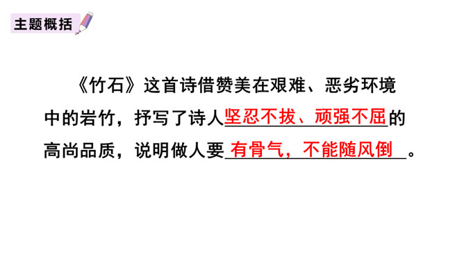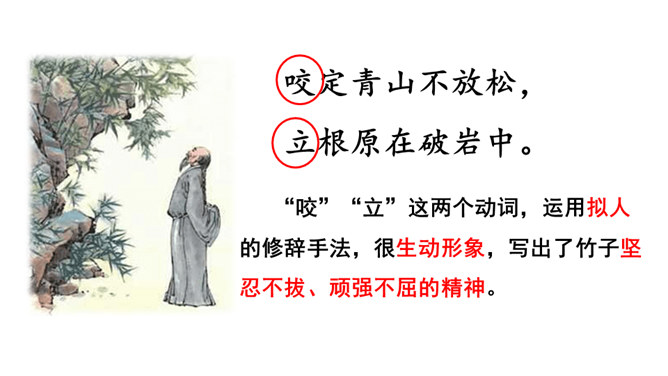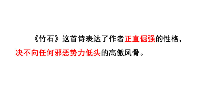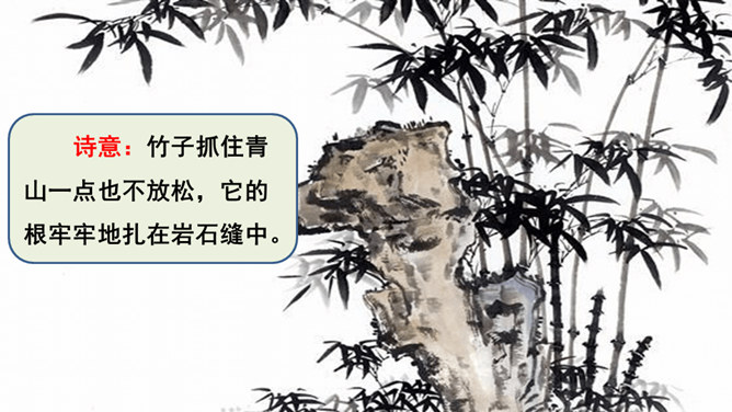 齐读诗的前两句,这两句诗中有两个动词很生动形象,你能找出来吗?借助注释理解这两句诗的意思,说说作者看到了什么?“咬”“立”这两个动词,运用拟人的修辞手法,很生动形象,写出了竹子坚忍不拔、顽强不屈的精神。齐读后两句诗,借助注释理解这两句诗的意思,说说这首诗表达了作者怎样的志向?这首诗表达了作者正直倔强的性格,决不向任何邪恶势力低头的高傲风骨。这三首诗,在表达的方法上有什么共同特点?所属专题:竹石ppt。