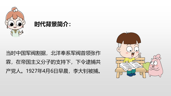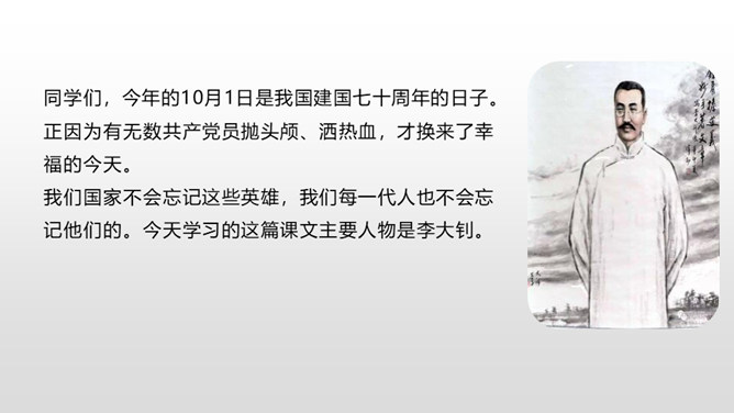 1.学会本课的生字。(重点)2.初步感知文意,了解课文内容。(难点)同学们,今年的10月1日是我国建国七十周年的日子。正因为有无数共产党员抛头颅、洒热血,才换来了幸福的今天。我们国家不会忘记这些英雄,我们每一代人也不会忘记他们的。今天学习的这篇课文主要人物是李大钊。阅读全文,分析文章的层次是什么。熟读全文,画出你喜欢的句子,并说说为什么喜欢。所属专题:十六年前的回忆ppt。