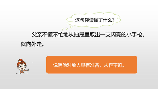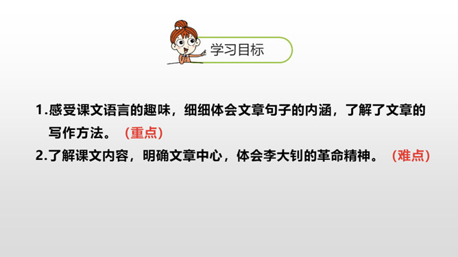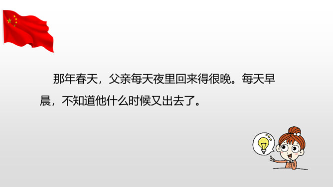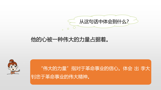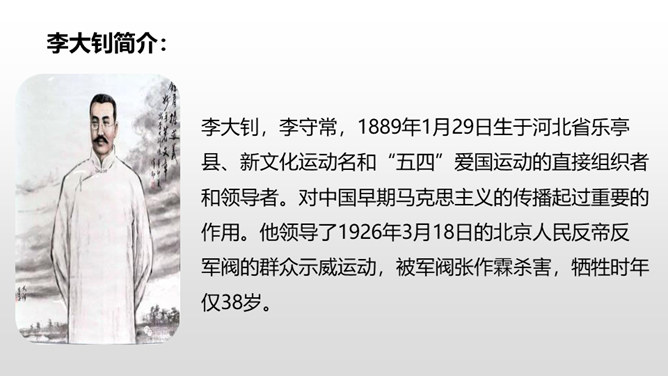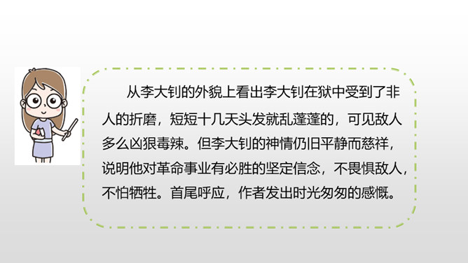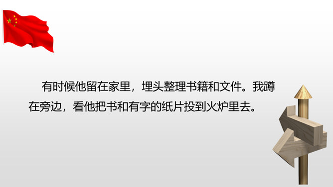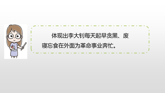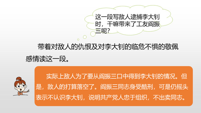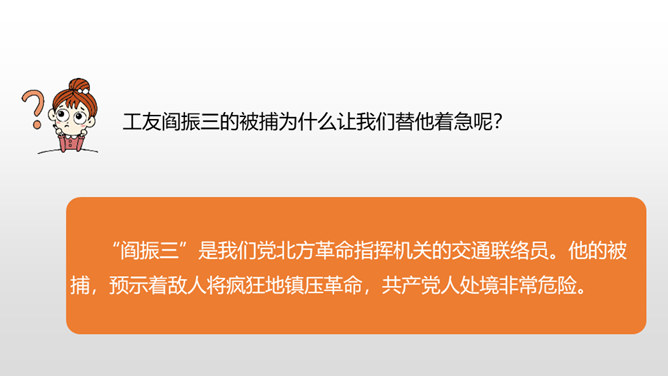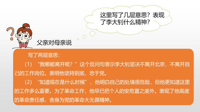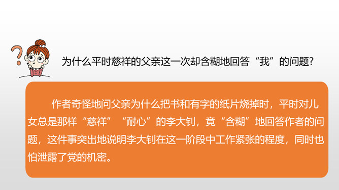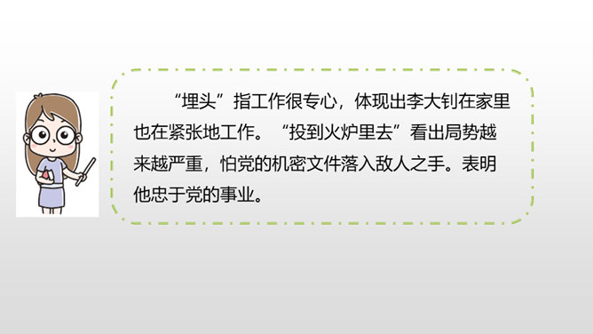 “埋头”指工作很专心,体现出李大钊在家里也在紧张地工作。“投到火炉里去”看出局势越来越严重,怕党的机密文件落入敌人之手。表明他忠于党的事业。作者奇怪地问父亲为什么把书和有字的纸片烧掉时,平时对儿女总是那样“慈祥”“耐心”的李大钊,竟“含糊”地回答作者的问题,这件事突出地说明李大钊在这一阶段中工作紧张的程度,同时也怕泄露了党的机密。阎振三”是我们党北方革命指挥机关的交通联络员。他的被捕,预示着敌人将疯狂地镇压革命,共产党人处境非常危险。所属专题:十六年前的回忆ppt。