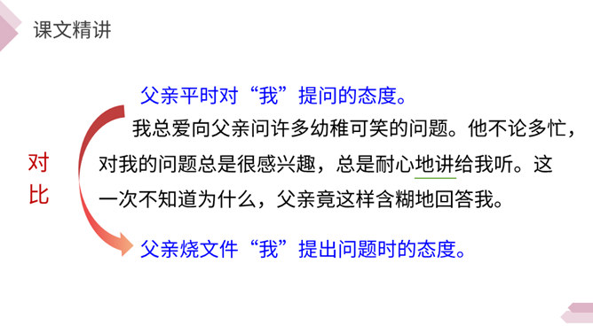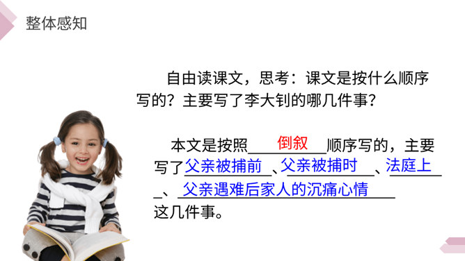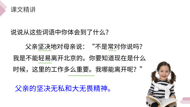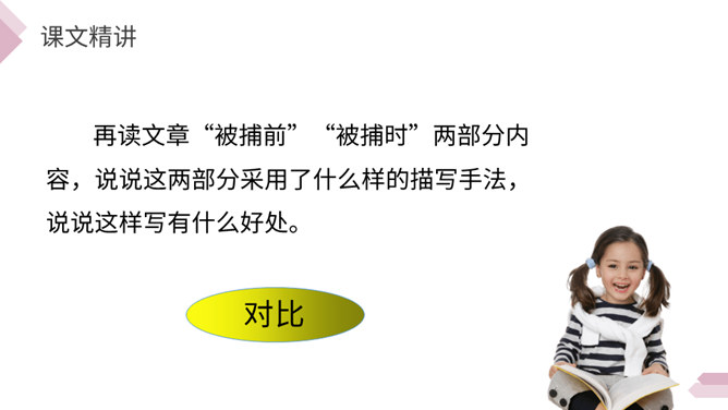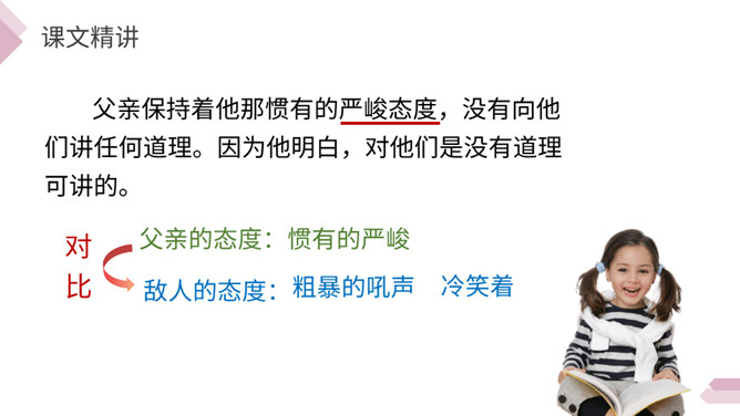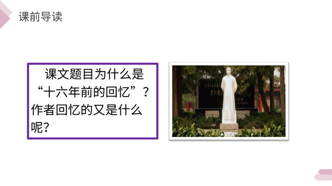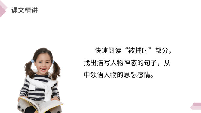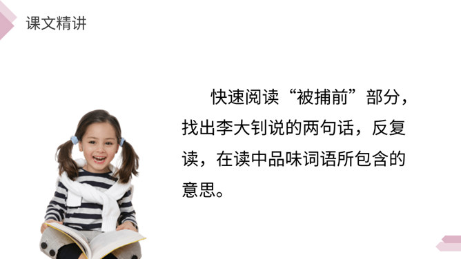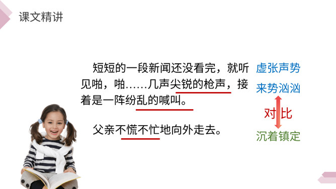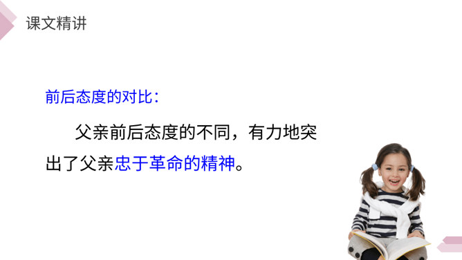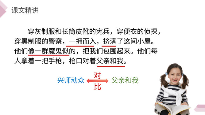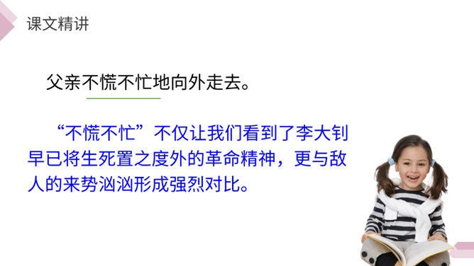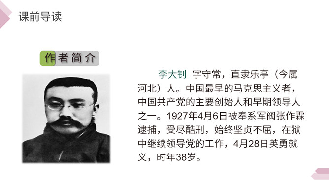 快速阅读“被捕前”部分,找出李大钊说的两句话,在读中品味词语所包含的意思。快速阅读“被捕时”部分,找出描写人物神态的句子,从中领悟人物的思想感情。“不慌不忙”不仅让我们看到了李大钊早已将生死置之度外的革命精神,更与敌人的来势汹汹形成强烈对比。再读文章“被捕前”“被捕时”两部分内容,说说这两部分采用了什么样的描写手法,说说这样写有什么好处。前后态度的对比:父亲前后态度的不同,有力地突出了父亲忠于革命的精神。所属专题:十六年前的回忆ppt。