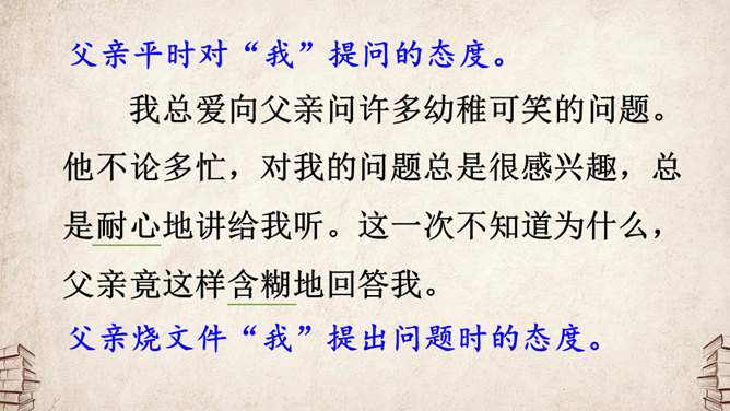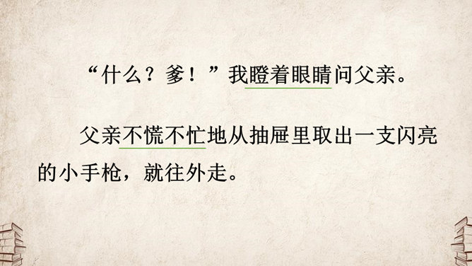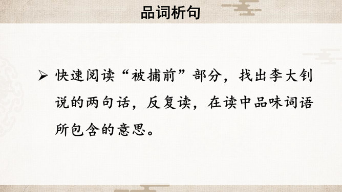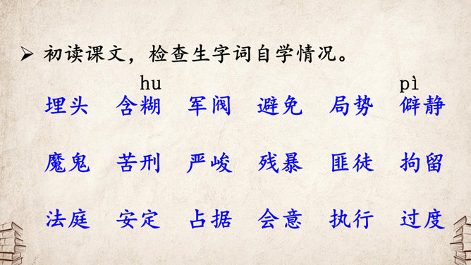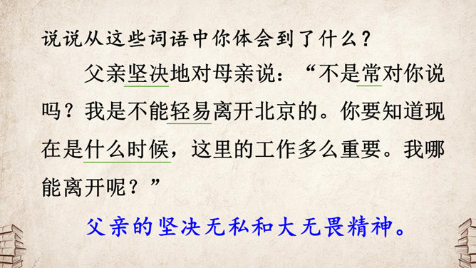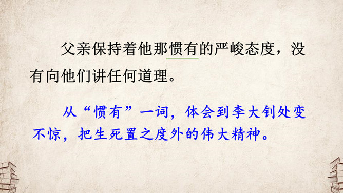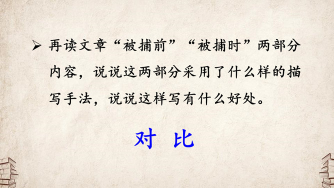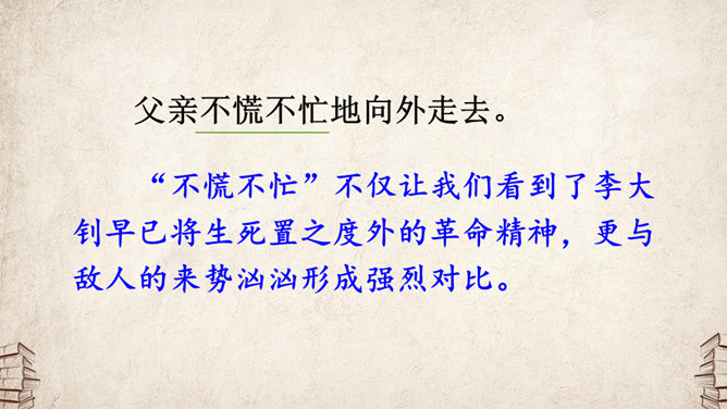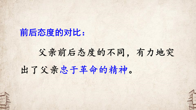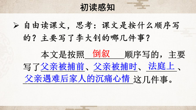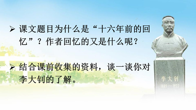 对照课本,检查改错。默读课文,回忆课文主要内容。请学生结合前两部分的内容进行学习,小组合作探究,自主学习“法庭上”“被害后”两部分的内容。从“乱蓬蓬”看出了李大钊遭受了非人的对待,但他经历残酷的折磨后依然面色“平静”,“慈祥”一词更是写出了李大钊对亲人那深切的爱。这强烈的对比将他对革命事业的坚贞不屈和视死如归的精神展露无遗。这样写更加突出了作者对父亲被害的事情记忆深刻,也表达了作者对父亲深深的怀念。所属专题:十六年前的回忆ppt。