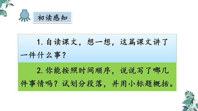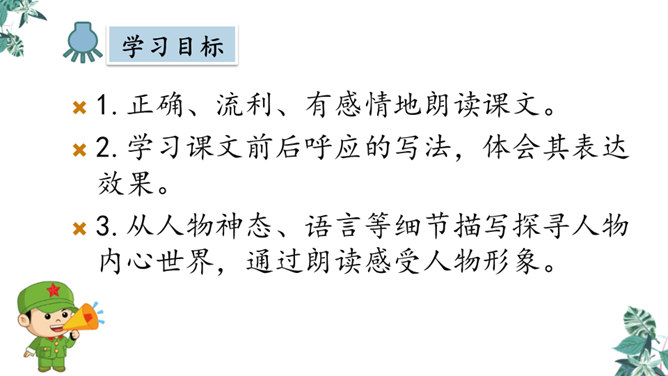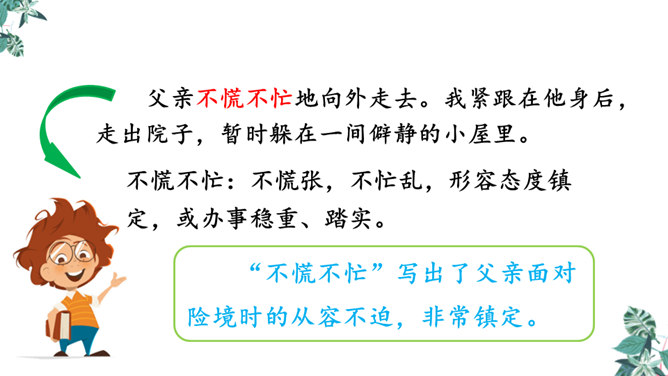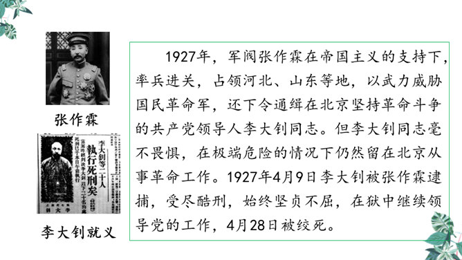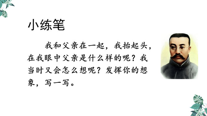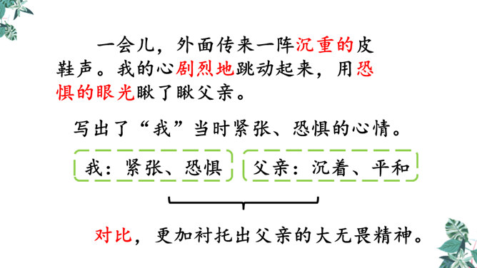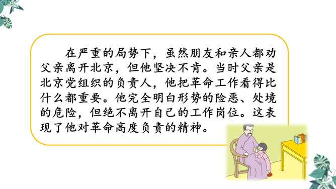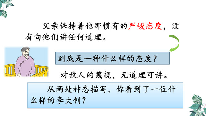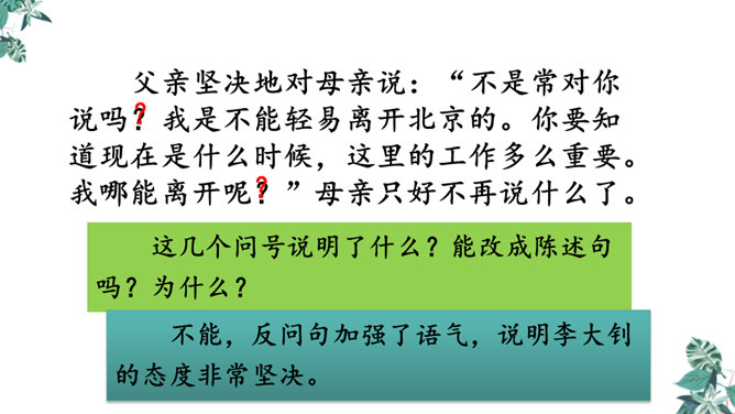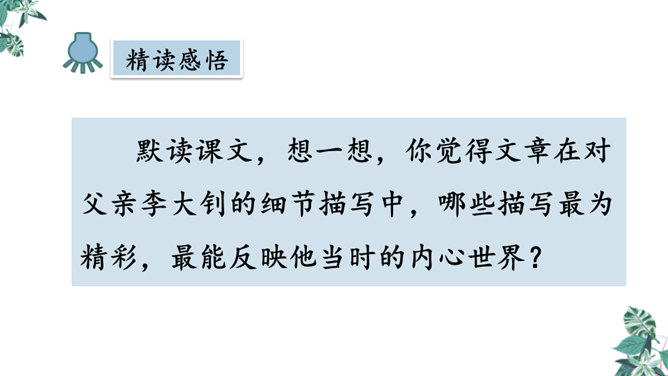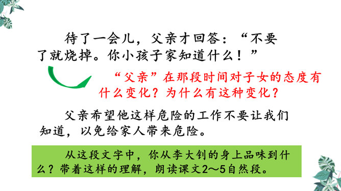 默读课文,想一想,你觉得文章在对父亲李大钊的细节描写中,哪些描写最为精彩,最能反映他当时的内心世界?“父亲”在那段时间对子女的态度有什么变化?为什么有这种变化?这几个问号说明了什么?能改成陈述句吗?为什么?不能,反问句加强了语气,说明李大钊的态度非常坚决。从两处神态描写,你看到了一位什么样的李大钊?看完这些,你们心里一定有很多感触。此时此刻的你,想对李大钊说些什么?所属专题:十六年前的回忆ppt。