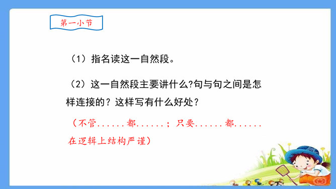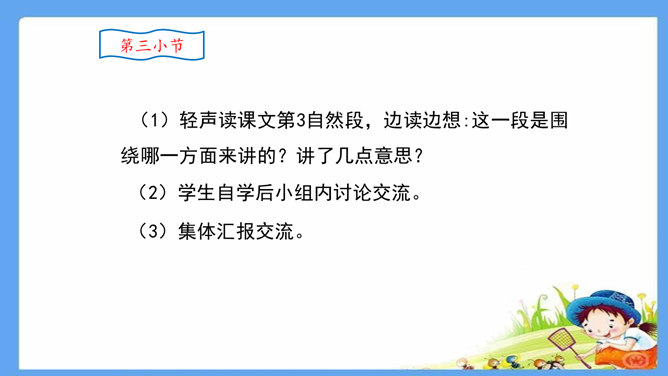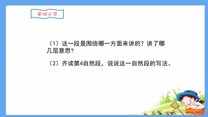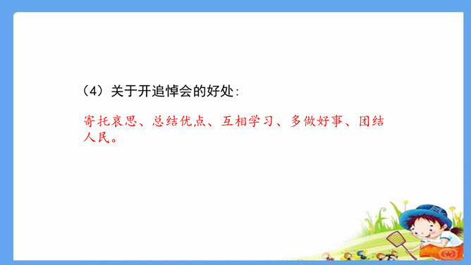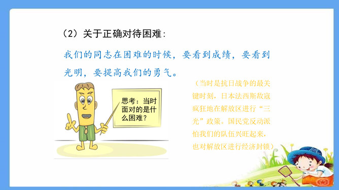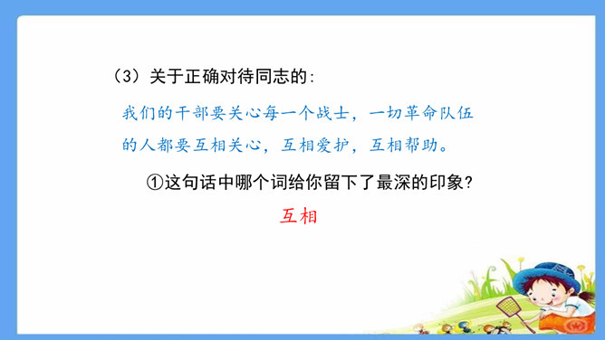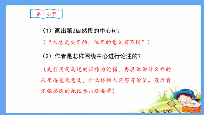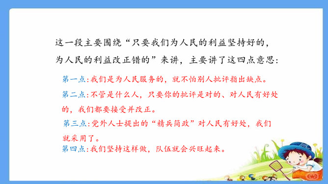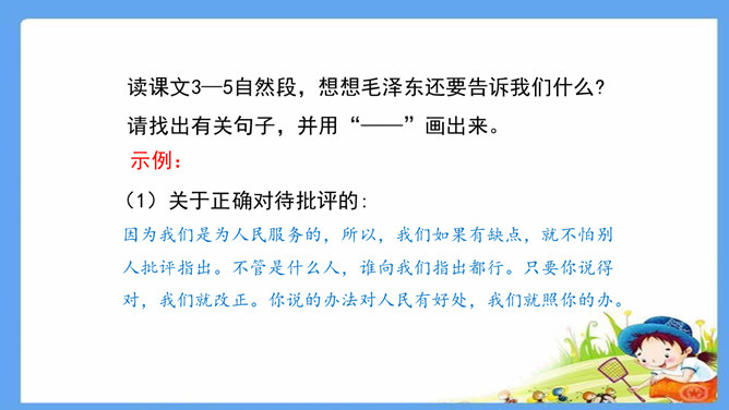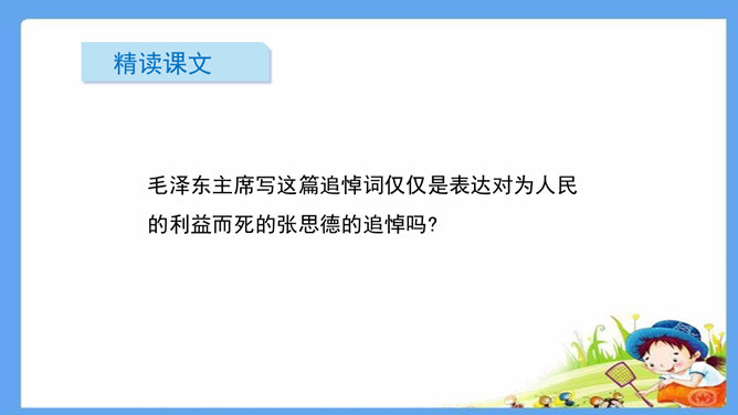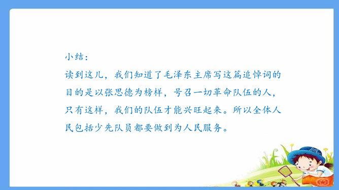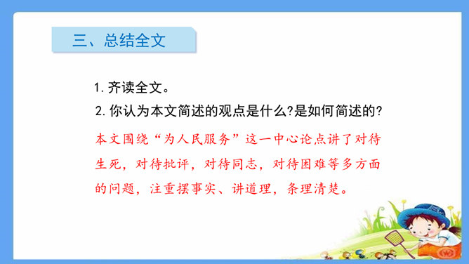 读到这儿,我们知道了毛泽东主席写这篇追悼词的目的是以张思德为榜样,号召一切革命队伍的人,只有这样,我们的队伍才能兴旺起来。所以全体人民包括少先队员都要做到为人民服务。说说这篇文章的观点是什么?围绕观点选择了哪几方面内容?(1)这一段是围绕哪一方面来讲的?讲了哪几层意思?(2)齐读第4自然段,说说这一自然段的写法。本文围绕“为人民服务”这一中心论点讲了对待生死,对待批评,对待同志,对待困难等多方面的问题,注重摆事实、讲道理,条理清楚。所属专题:为人民服务ppt。