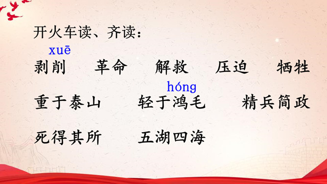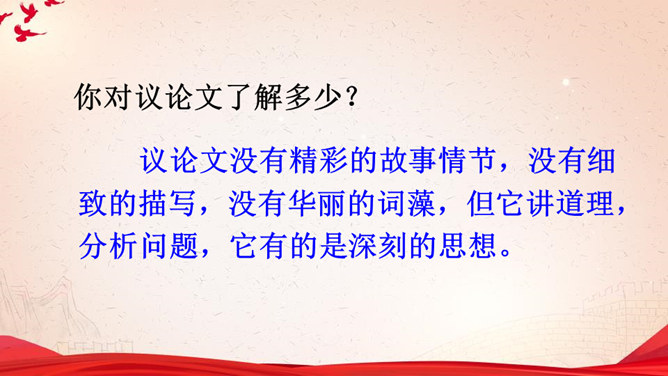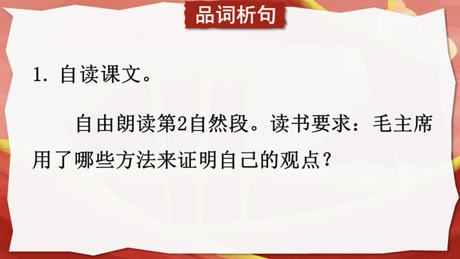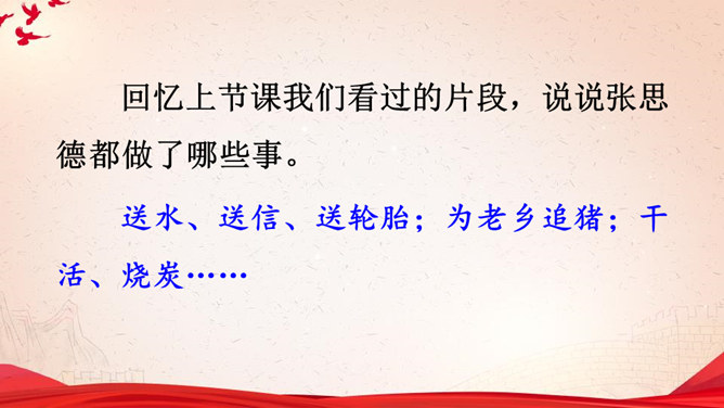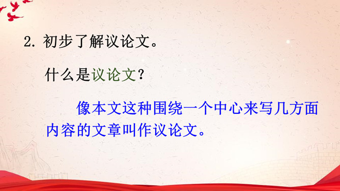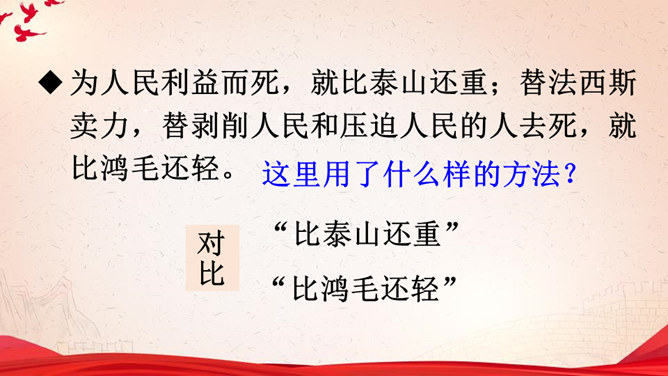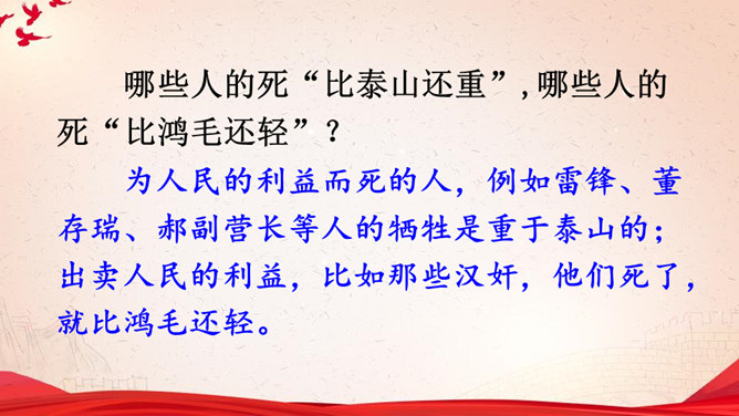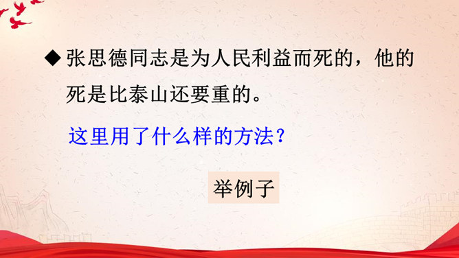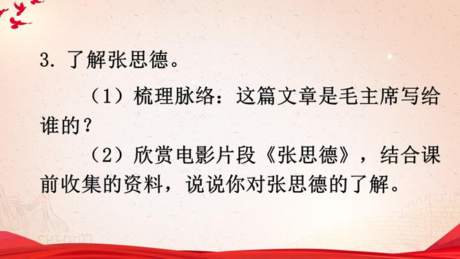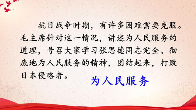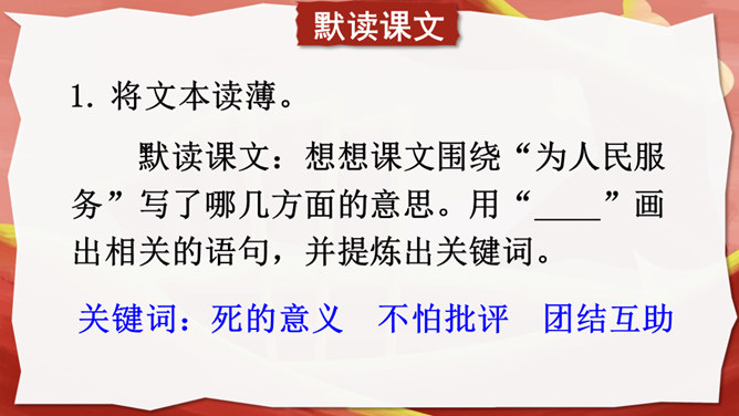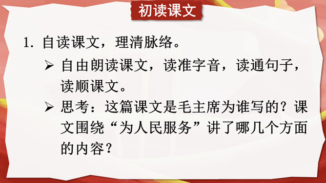 自读课文,理清脉络。自由朗读课文,读准字音,读通句子,读顺课文。思考:这篇课文是毛主席为谁写的?课文围绕“为人民服务”讲了哪几个方面的内容?(1)梳理脉络:这篇文章是毛主席写给谁的?(2)欣赏电影片段《张思德》,结合课前收集的资料,说说你对张思德的了解。像本文这种围绕一个中心来写几方面内容的文章叫作议论文。了解毛主席围绕观点是怎样展开去说、具体地说、深入地说,这就是把书重新读厚。所属专题:为人民服务ppt。