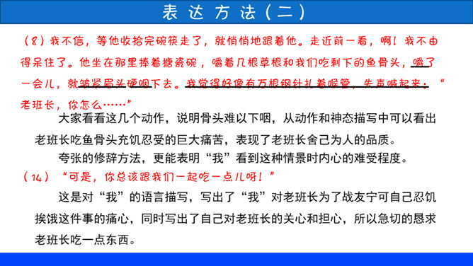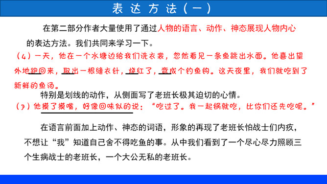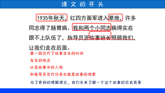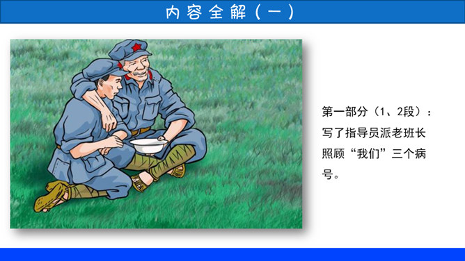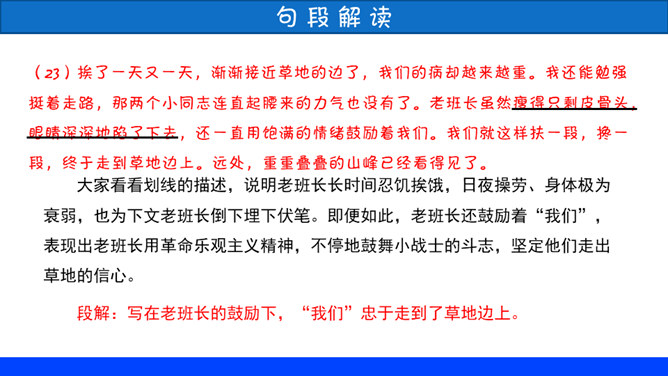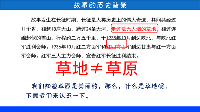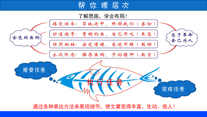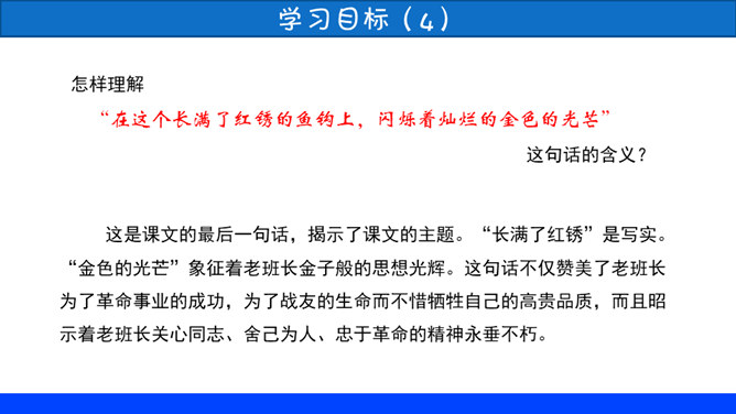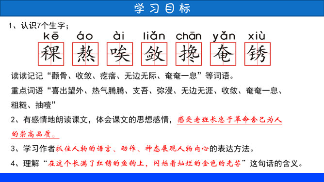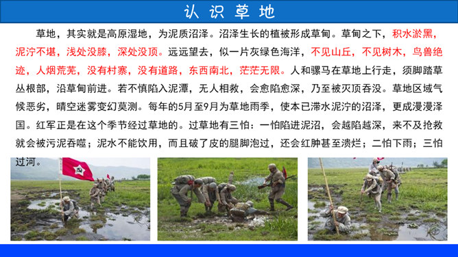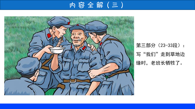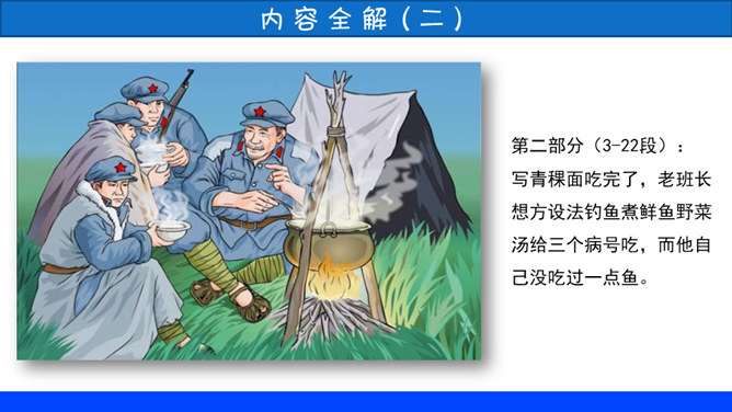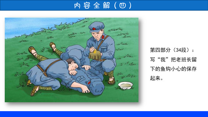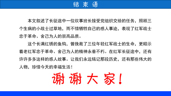 本文叙述了长征途中一位炊事班长接受党组织交给的任务,照顾三个生病的小战士过草地,而不惜牺牲自己的感人事迹,表现了红军战士忠于革命、舍己为人的崇高品质。这个长满红锈的鱼钩,曾挽救了三位年轻红军战士的生命,更昭示着老红军忠于革命、舍己为人的精神永垂不朽。在红军长征途中,还有许许多多这样的感人故事。让我们永远铭记那段历史,还有那些伟大的人物,珍惜今天的幸福生活!所属专题:金色的鱼钩ppt。