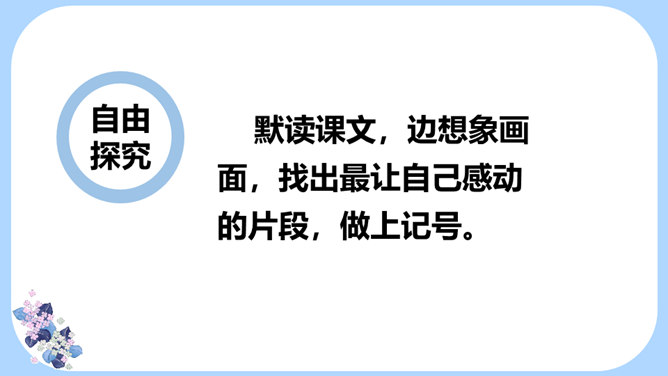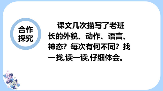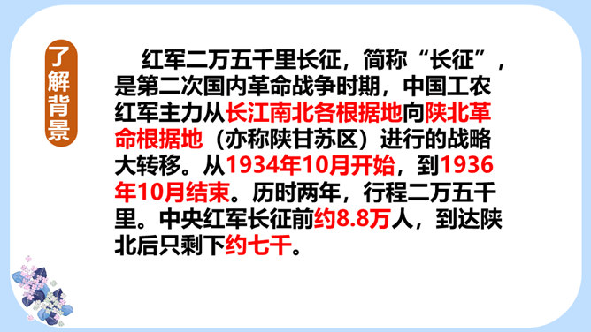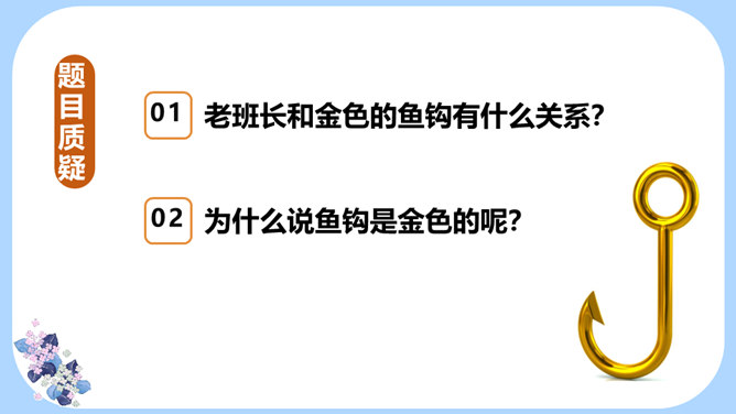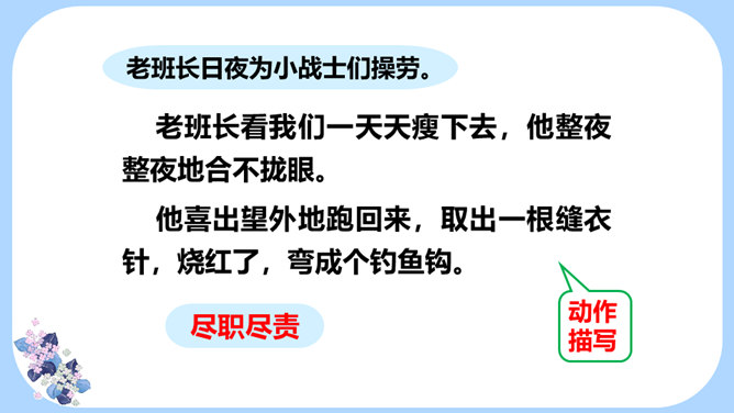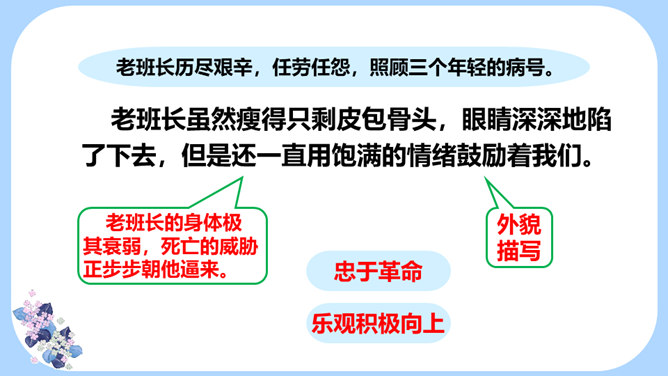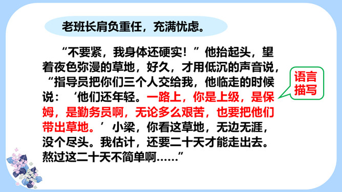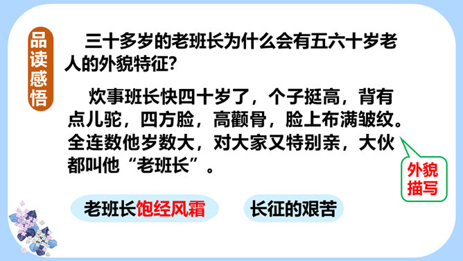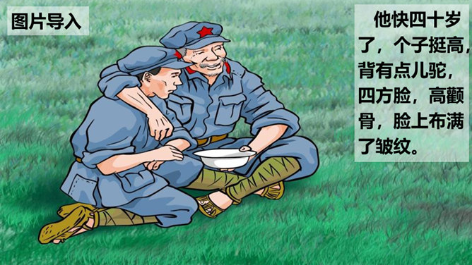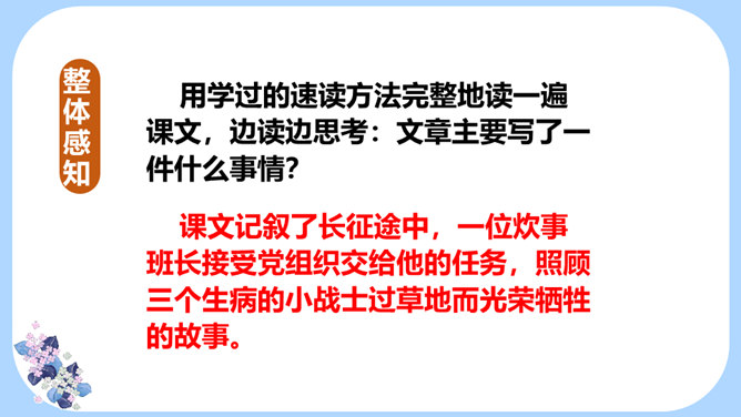用学过的速读方法完整地读一遍课文,边读边思考:文章主要写了一件什么事情?课文记叙了长征途中,一位炊事班长接受党组织交给他的任务,照顾三个生病的小战士过草地而光荣牺牲的故事。课文几次描写了老班长的外貌、动作、语言、神态?每次有何不同?找一找,读一读,仔细体会。默读课文,边想象画面,找出最让自己感动的片段,做上记号。假如你是伤员,面对奄奄一息的老班长,会有怎样的感受?所属专题:金色的鱼钩ppt。