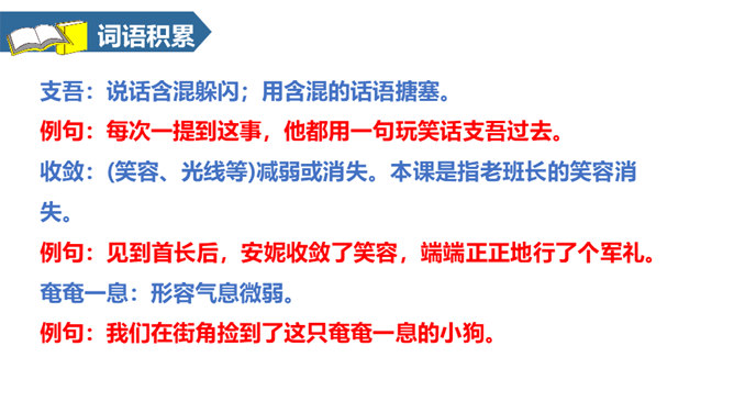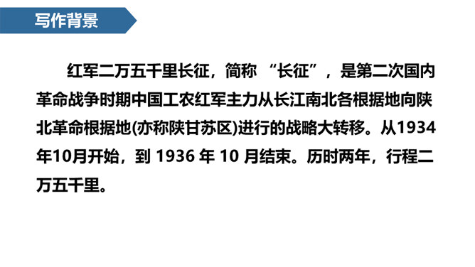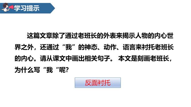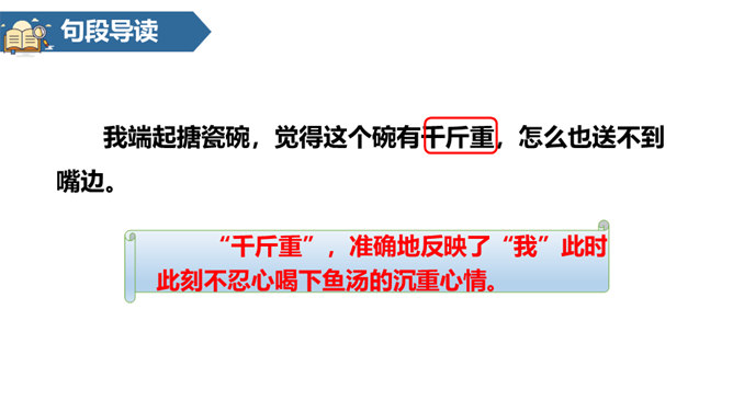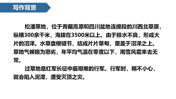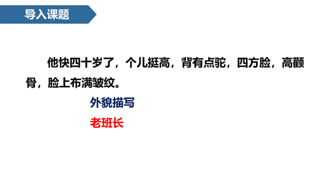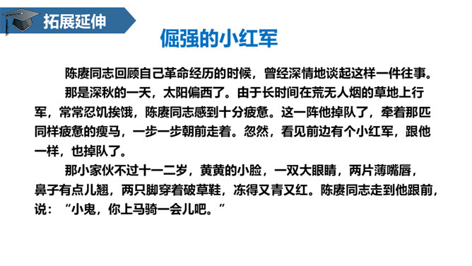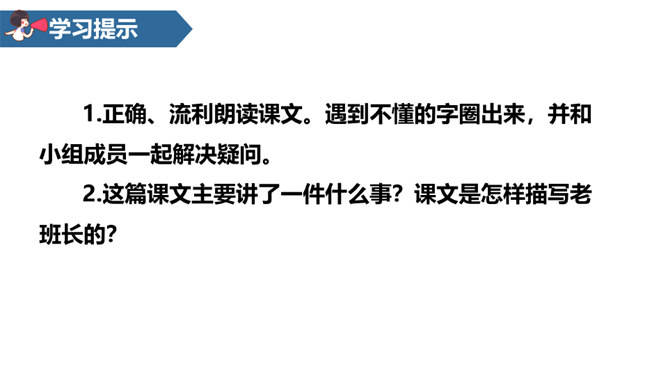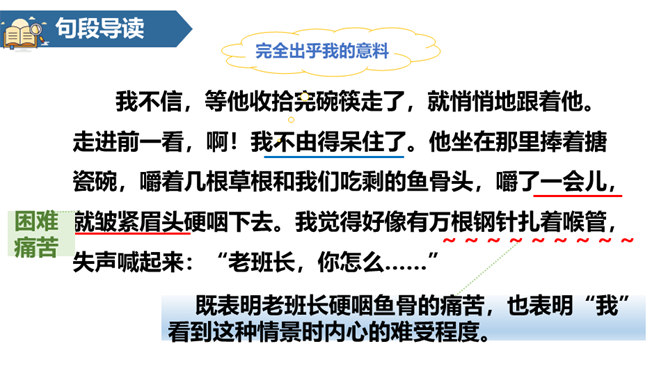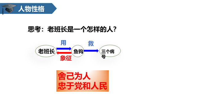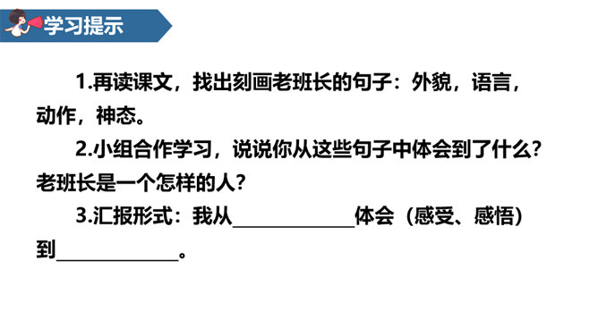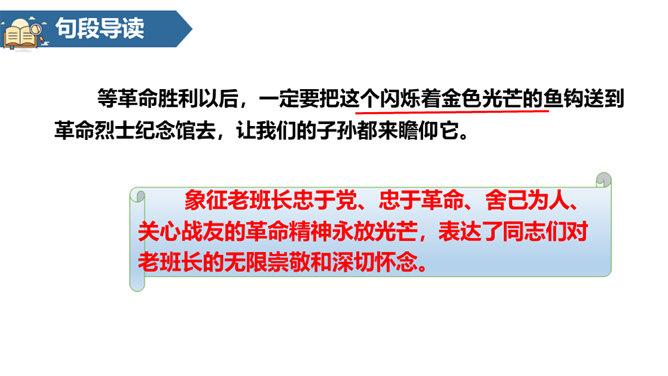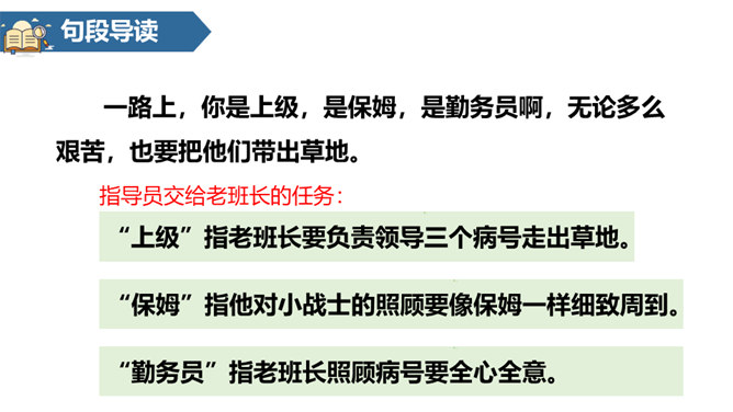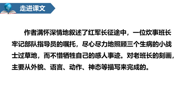 1.正确、流利朗读课文。遇到不懂的字圈出来,并和小组成员一起解决疑问。2.这篇课文主要讲了一件什么事?课文是怎样描写老班长的?作者满怀深情地叙述了红军长征途中,一位炊事班长牢记部队指导员的嘱托,尽心尽力地照顾三个生病的小战士过草地,而不惜牺牲自己的感人事迹。对老班长的刻画,主要从外貌、语言、动作、神态等描写来完成的。再读课文,找出刻画老班长的句子:外貌,语言,动作,神态。所属专题:金色的鱼钩ppt。
